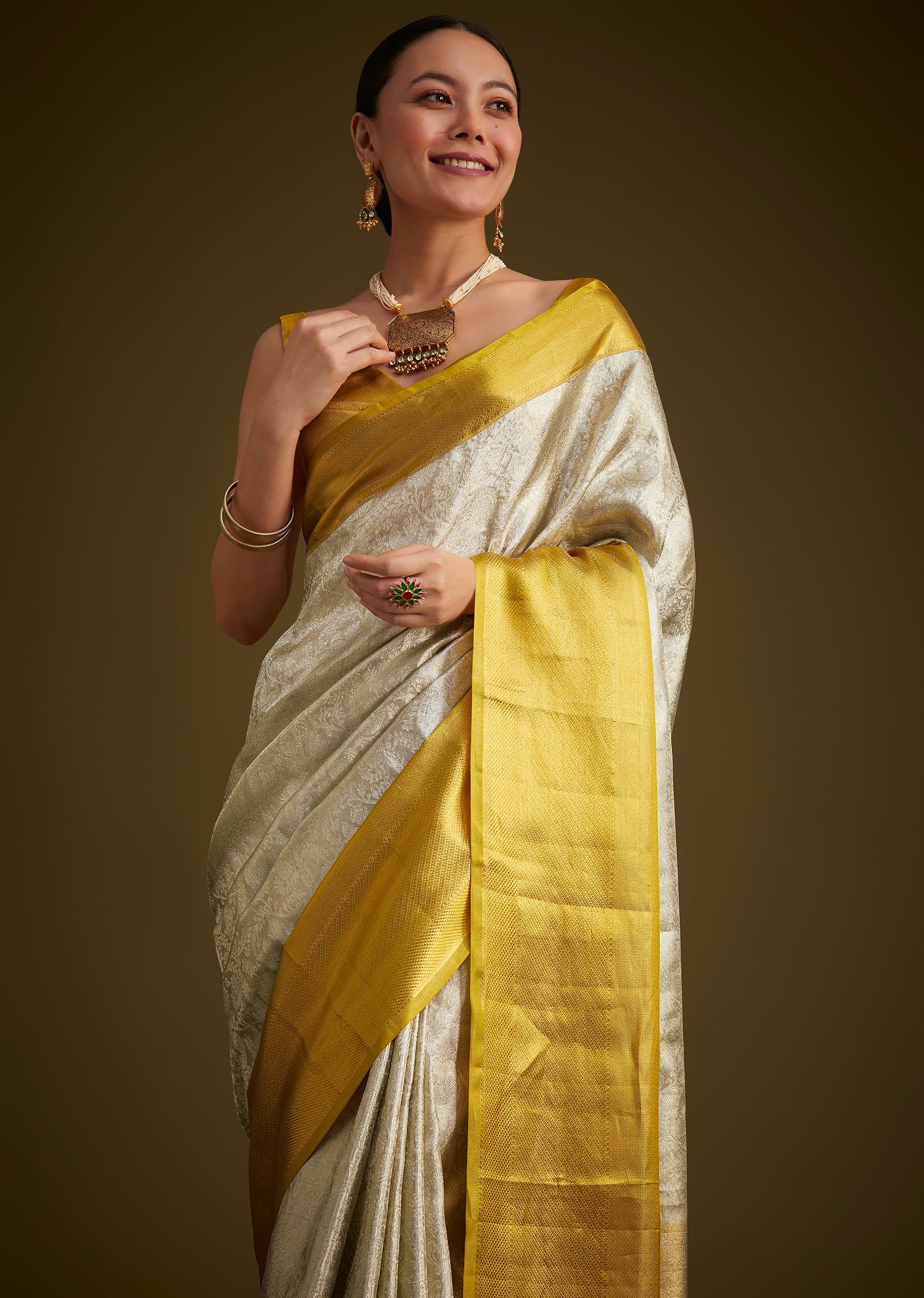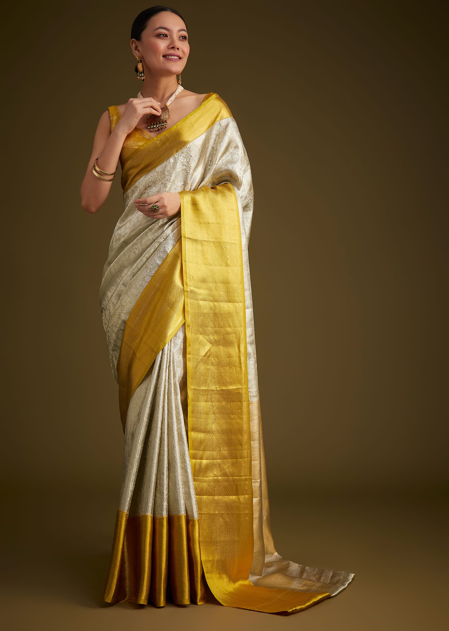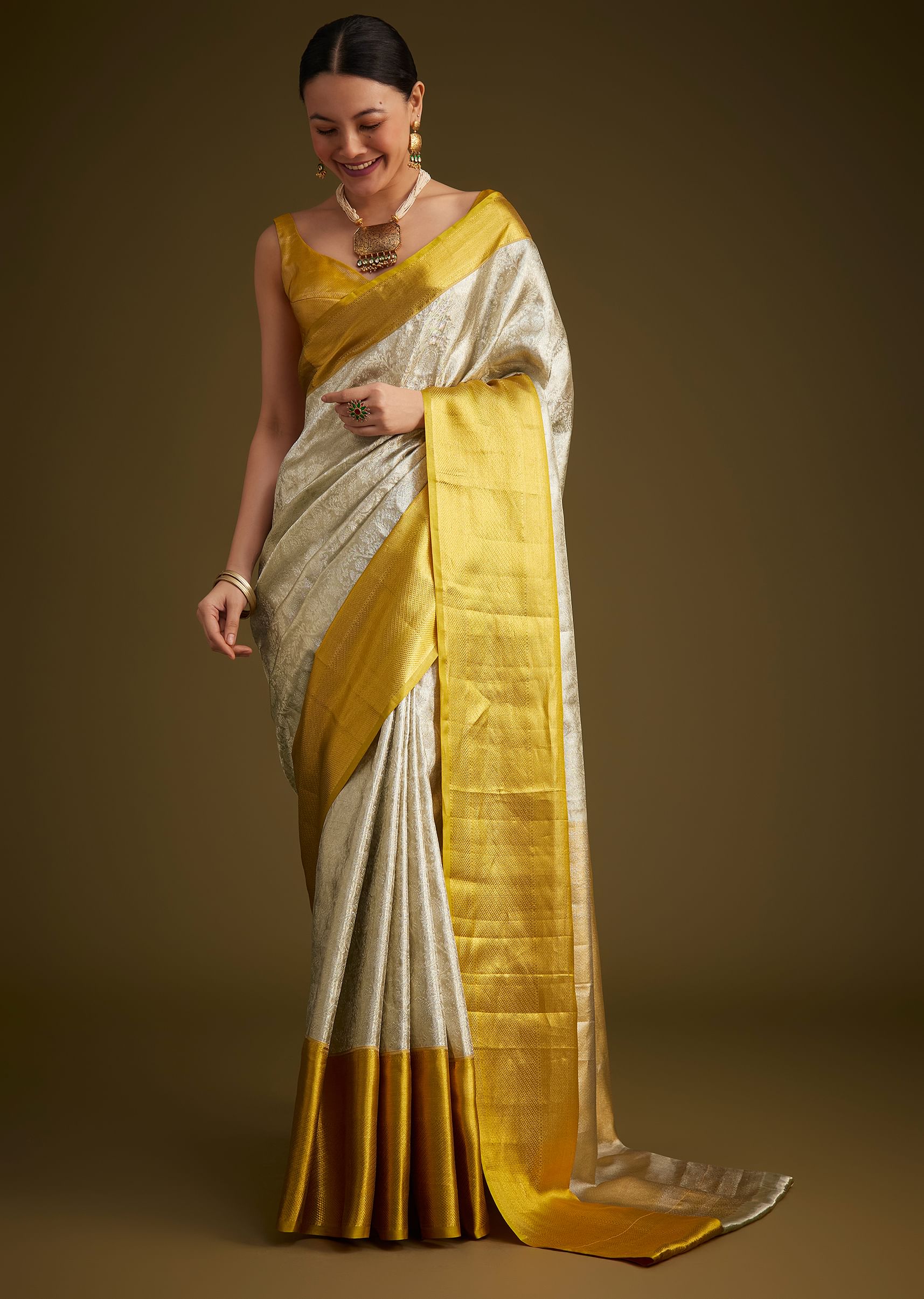 Silver Kanjivaram Silk Saree With Gold Contrast Border