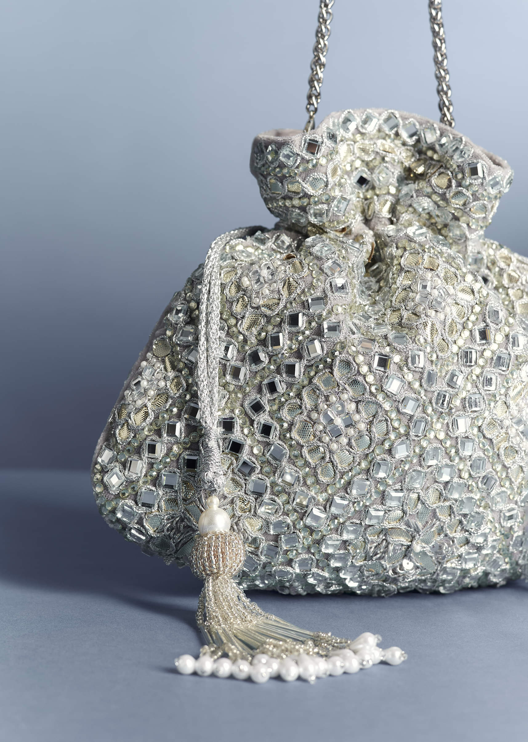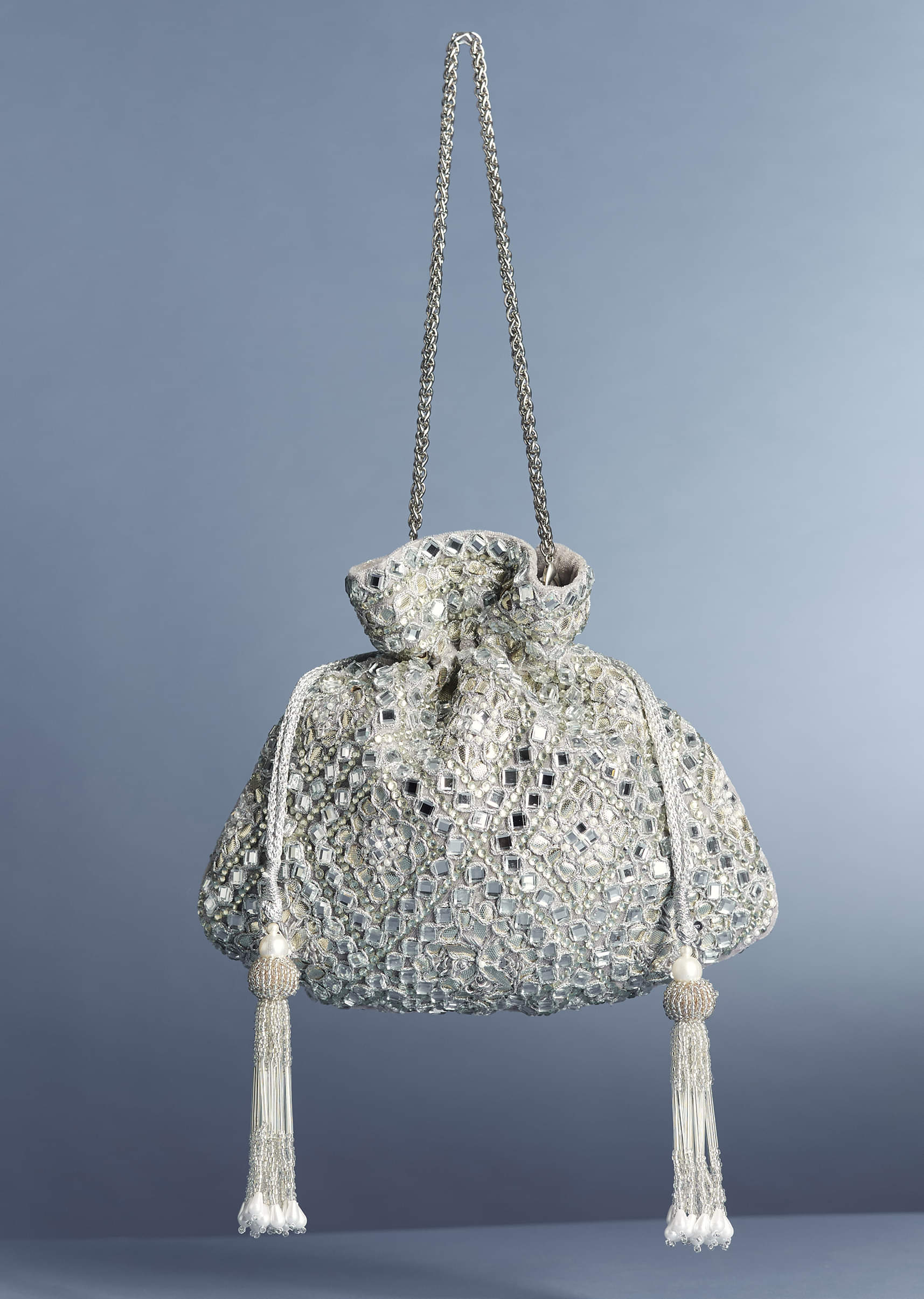 A handcrafted silver potli embellished with fine mirror work and elegant tassels adding just the right sparkle for festive and wedding looks. Awarded as the Most Trusted Brand, we're delivering styles you love, just as promised.