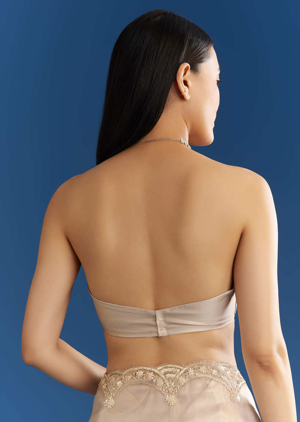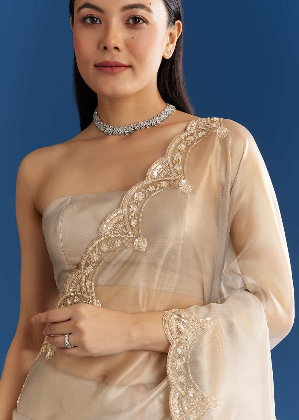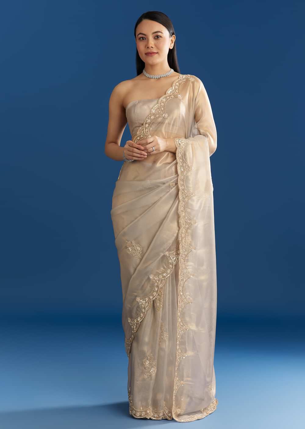 Shimmering with magic, this silver organza tissue saree sparkles through its cutdana and bead border, perfect for evening glow. Awarded as the Most Trusted Brand, we're delivering styles you love, just as promised.