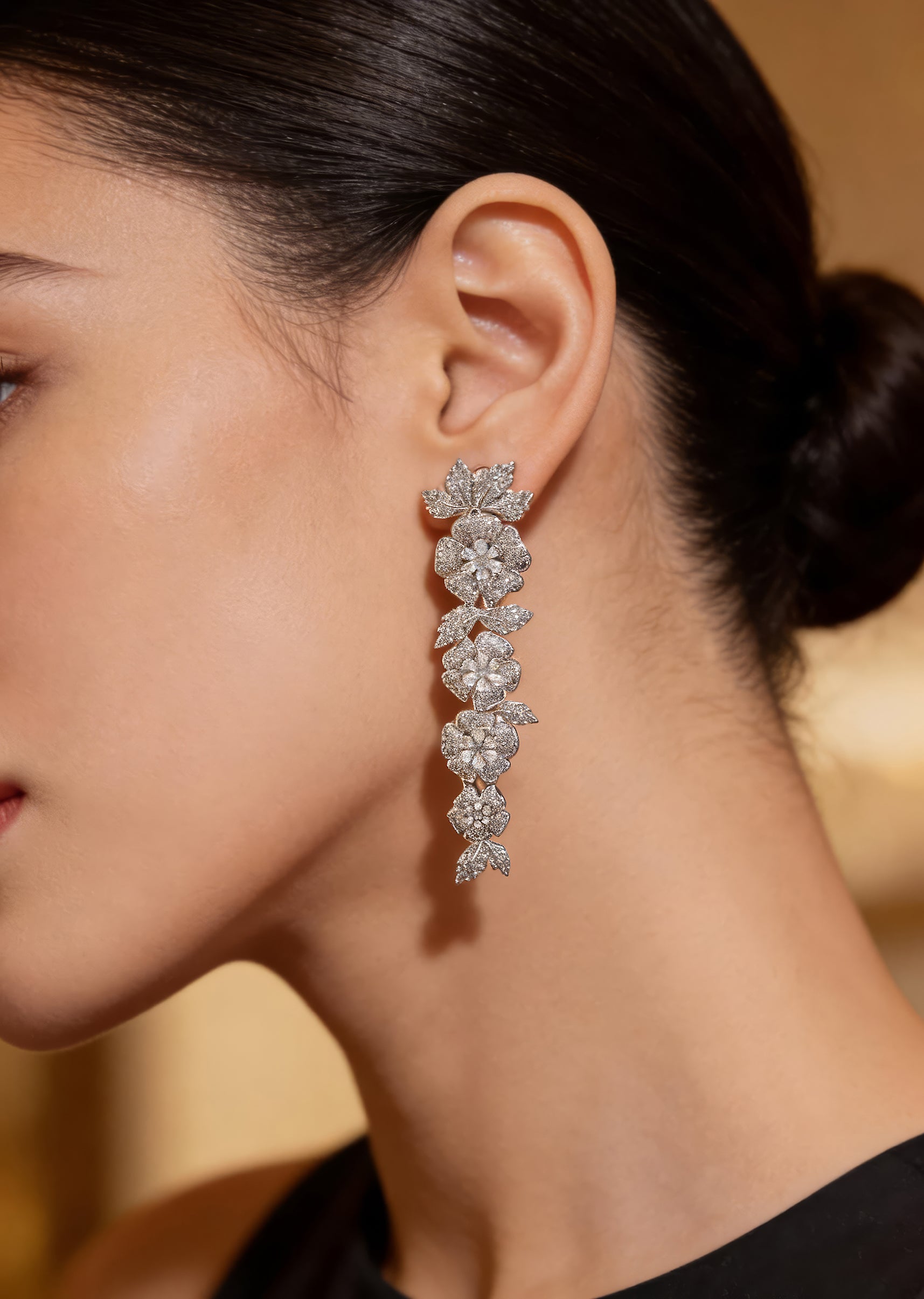 Radiant long danglers adorned with intricate floral motifs & shimmering stones. These statement earrings exude elegance & are perfect for adding a touch of sophistication to evening or festive look.... More Product Details