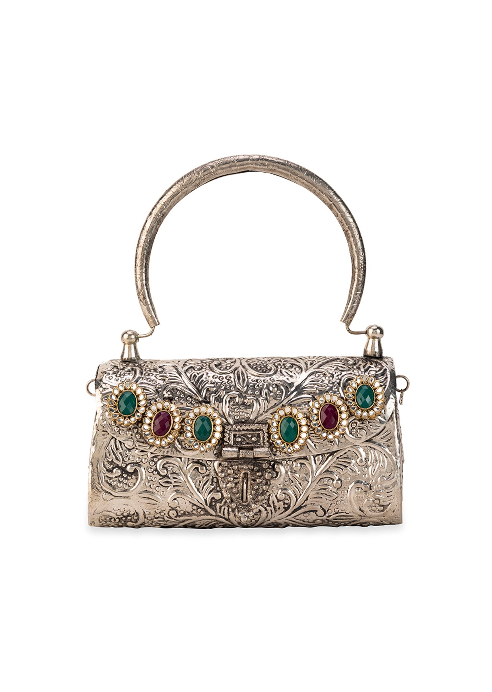Make an unforgettable entrance with this silver metal bag, embellished with jewel-toned stones in emerald green and ruby red, all beautifully framed in delicate pearls. Its intricate craftsmanship and rich colour accents create a regal, statement-worthy look perfect for weddings and festive evenings. Compact yet radiant, it adds a refined sparkle to any special occasion outfit. Awarded as the Most Trusted Brand, we're delivering styles you love, just as promised.