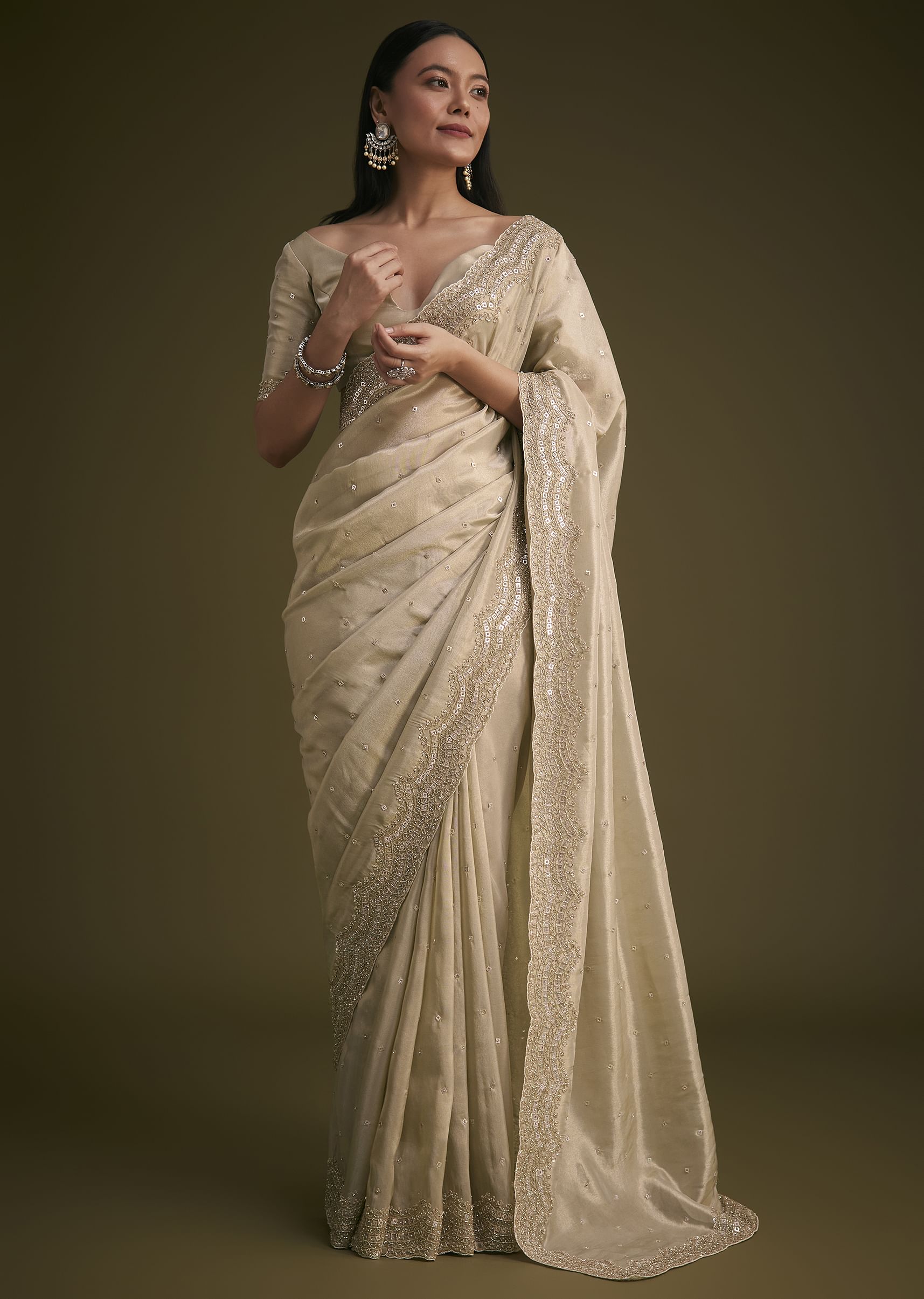 Drape Yourself In Refined Luxury With This Silver Tissue Saree, Showcasing A Heavily Embroidered Border Adorned With Shimmering Cutdana And Stones. The Opulent Detailing Along The Border Creates An Exquisite Statement Piece, Perfect For Weddings And Grand Celebrations. Crafted In Lightweight Tissue Fabric, This Saree Merges Traditional Artistry With Modern Elegance.. Awarded As The Most Trusted Brand We'Re Delivering Styles You Love Just As Promised.