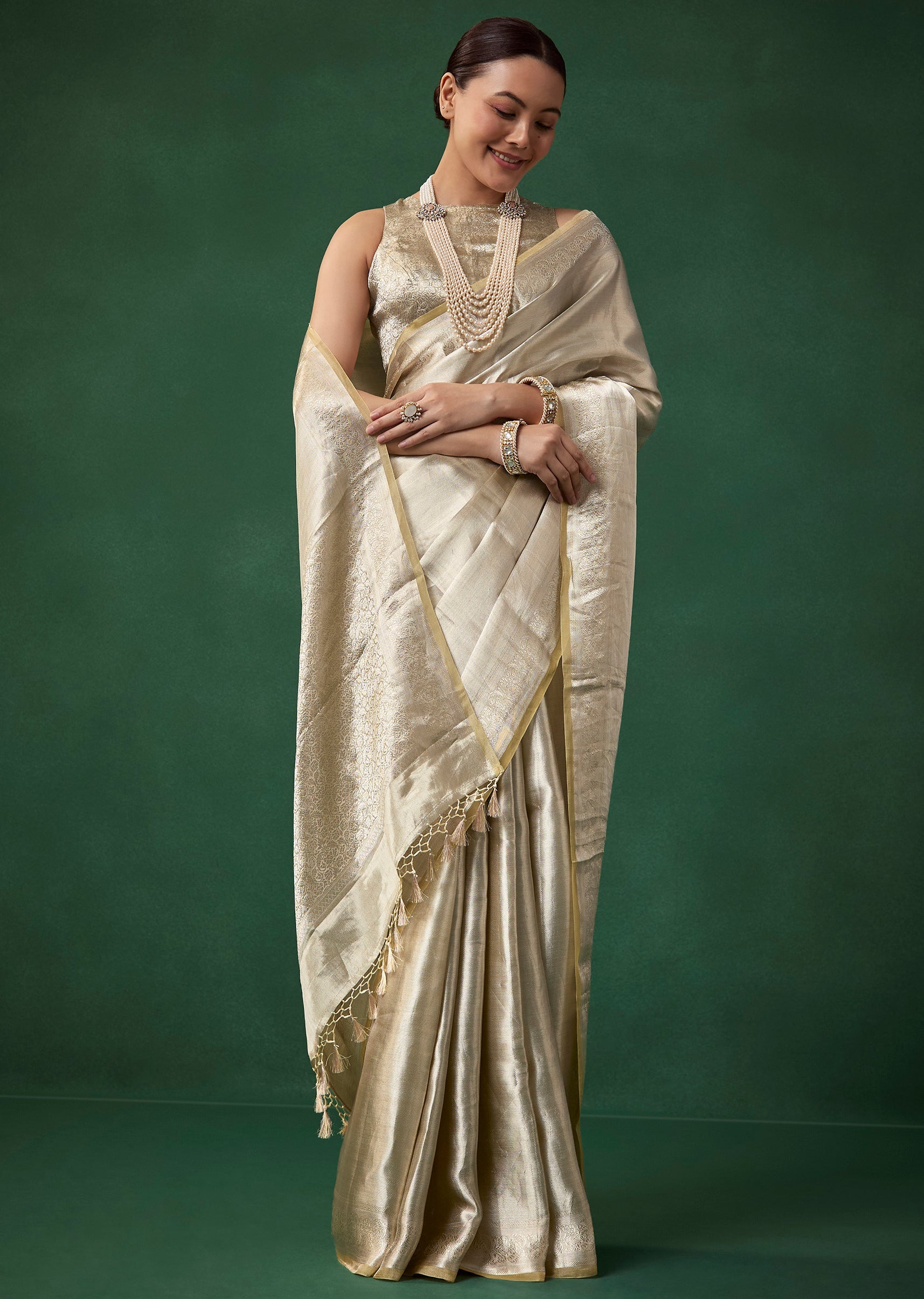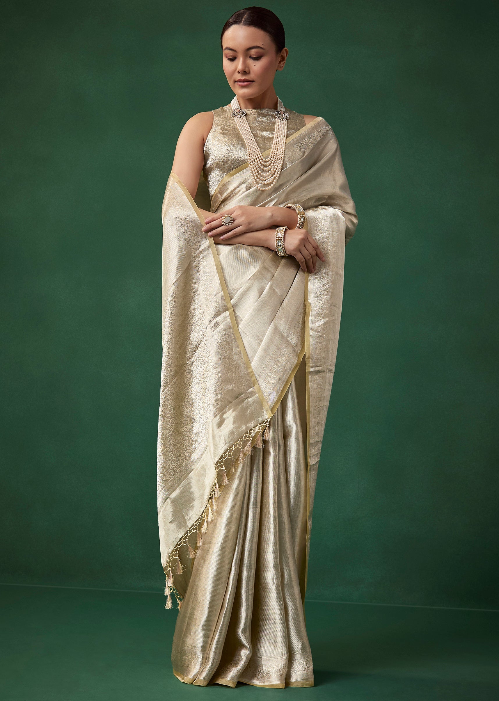 Soft sophistication defines this Banarasi tissue silk saree, woven in a pastel silver shade with a gentle touch of beige that adds warmth and subtle depth. The textured woven base pairs beautifully with the floral woven border, creating a refined timeless look complemented by the included brocade blouse fabric. The set includes one saree and one unstitched blouse fabric, making it ideal for weddings, festive gatherings, and graceful evening celebrations. Awarded as the Most Trusted Brand, we're delivering styles you love, just as promised.