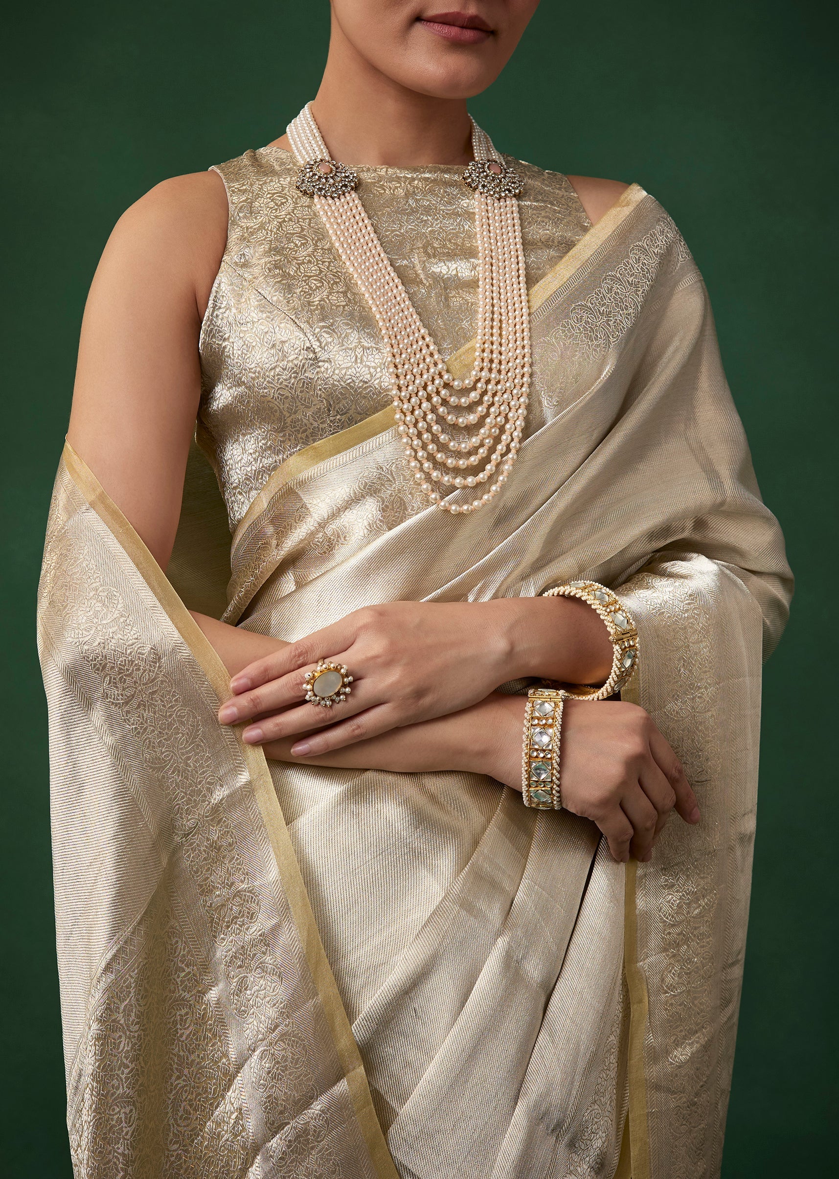 Fit Tips:Keep the pleats crisp for a smooth elegant fall and choose a fitted blouse to highlight the saree’s delicate texture and floral border.
