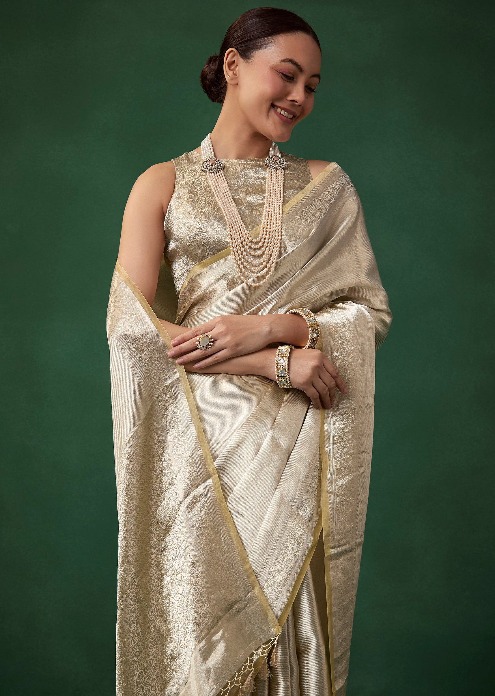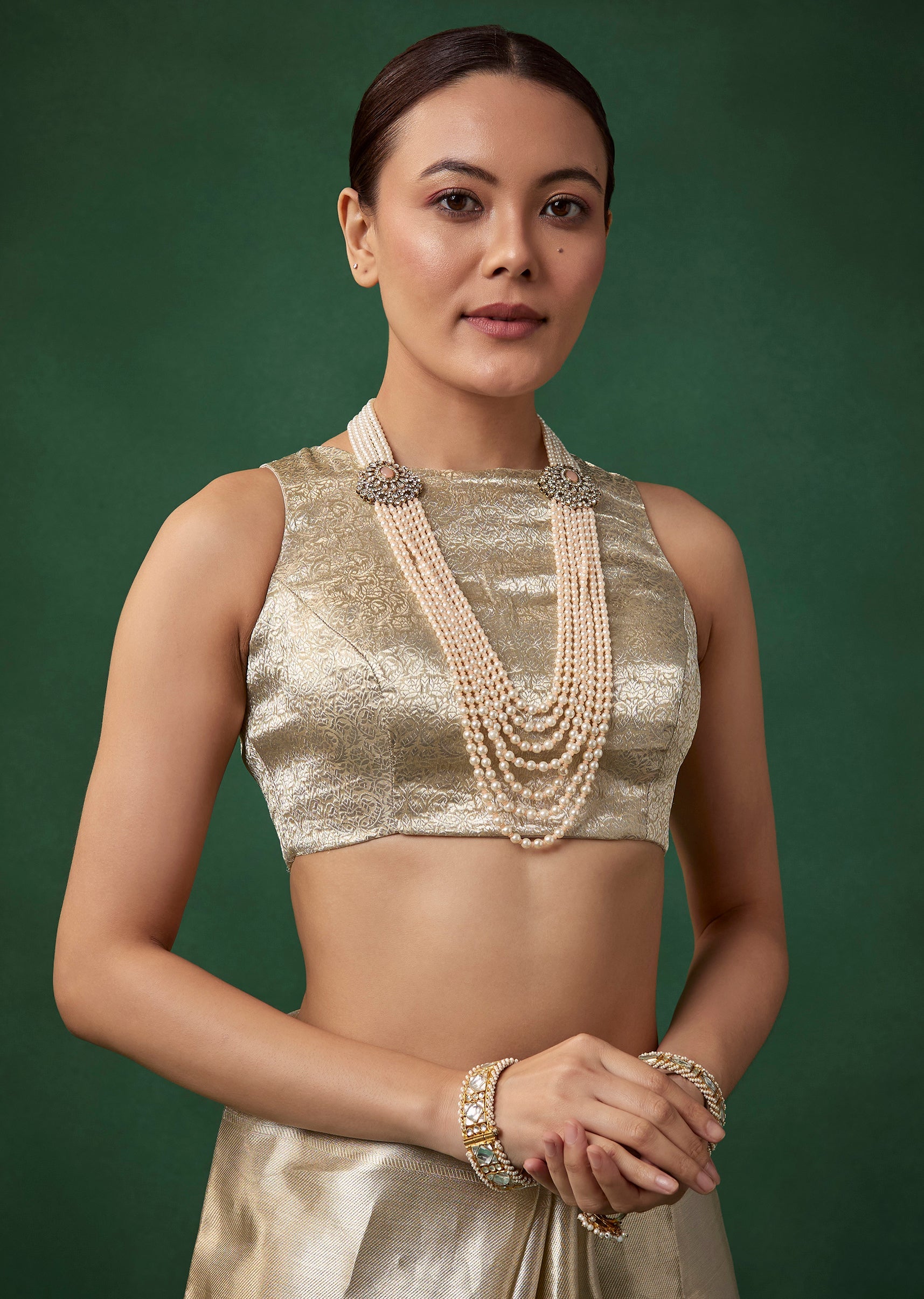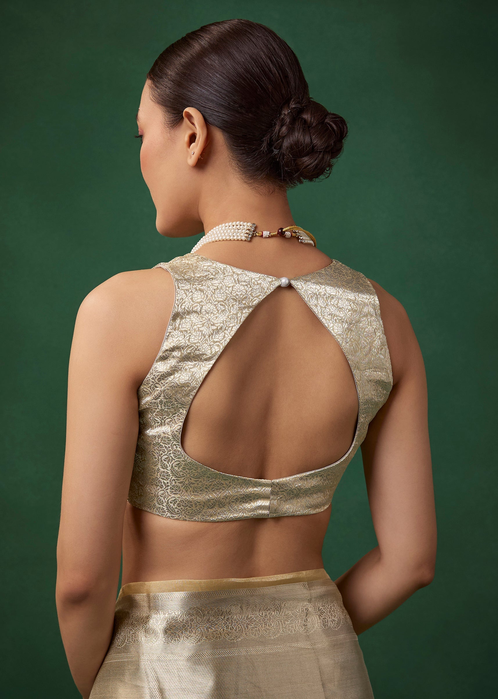 Enhance its muted elegance with pearl or antique gold jewelry, a sleek hairstyle, and soft radiant makeup.