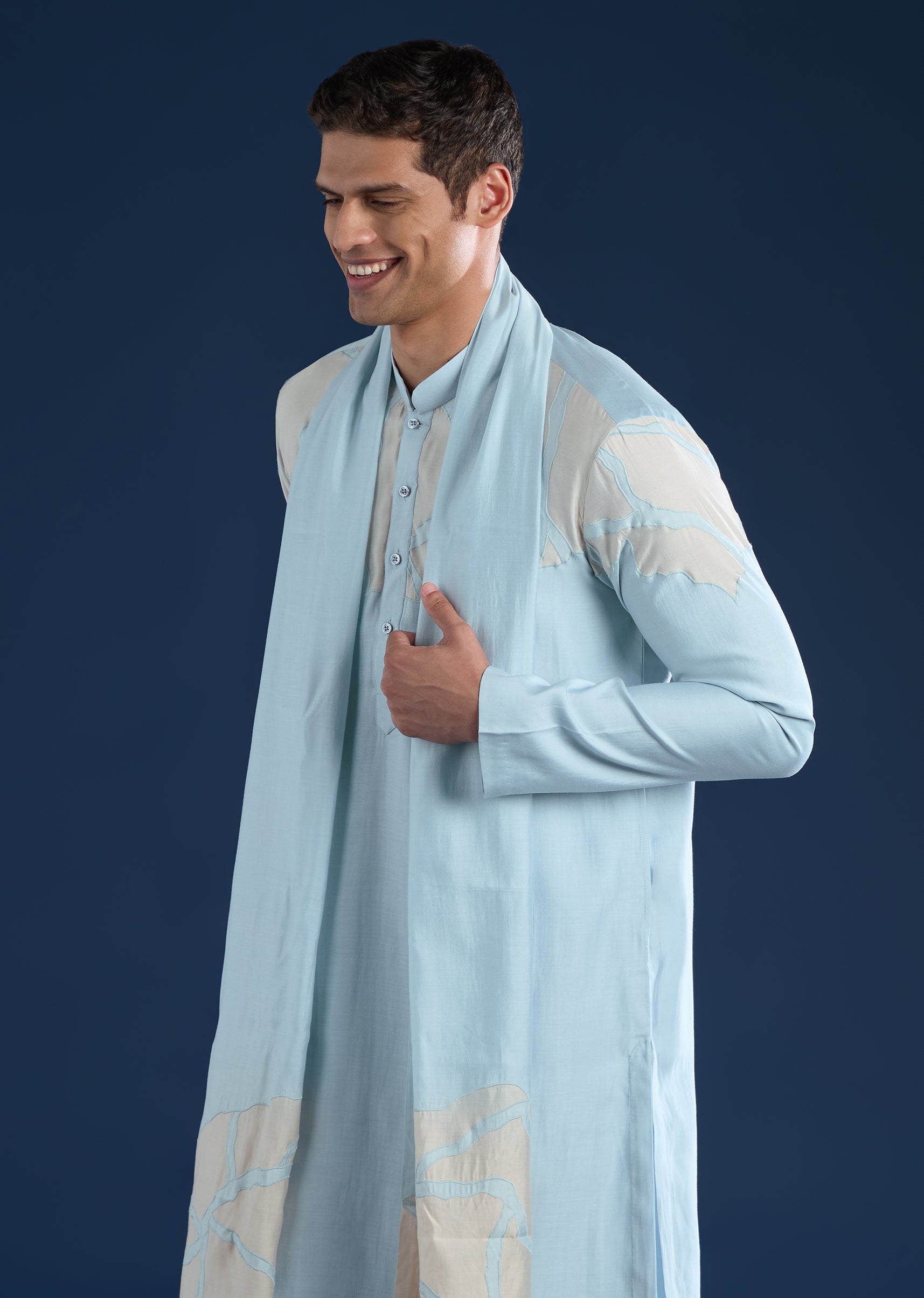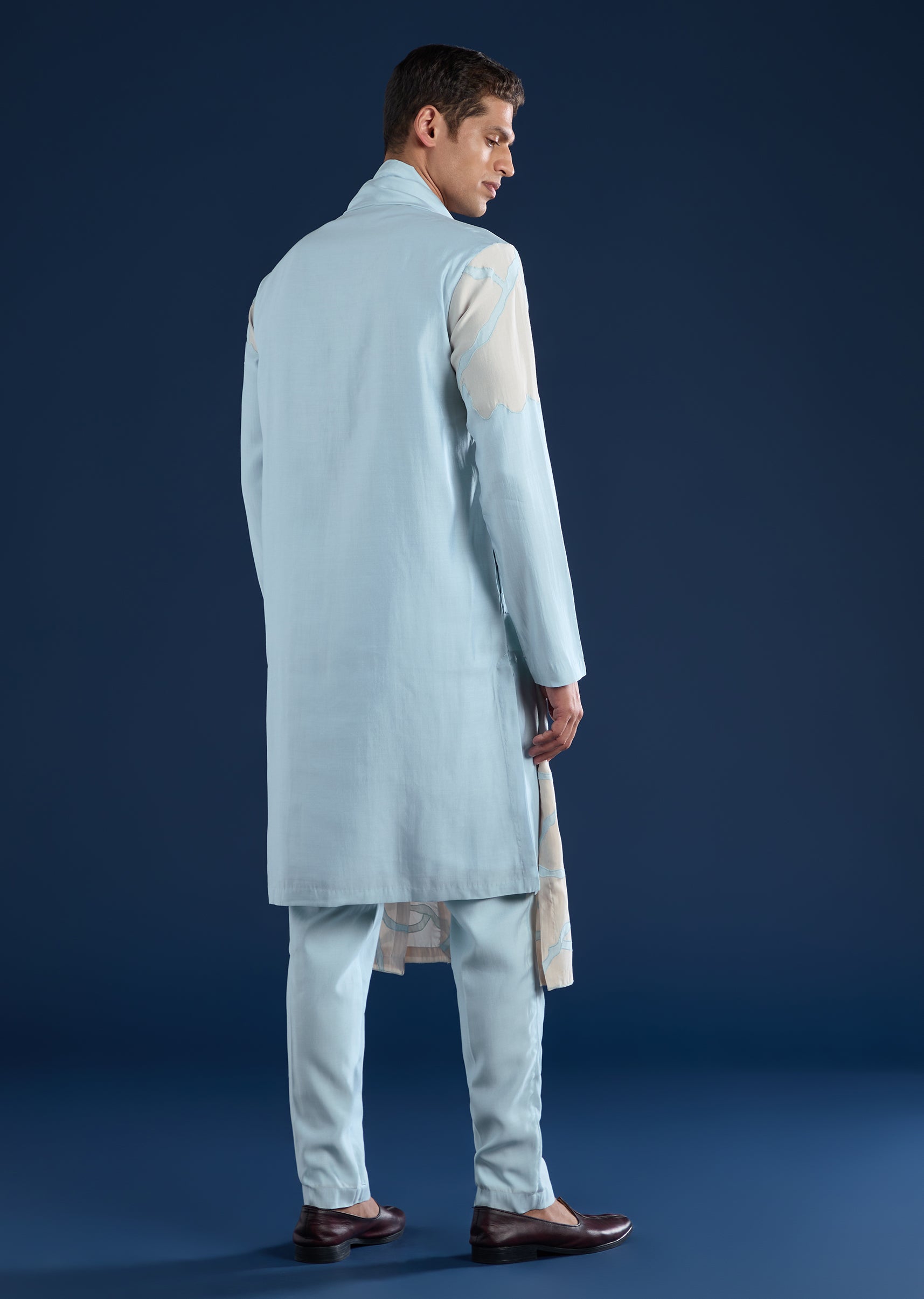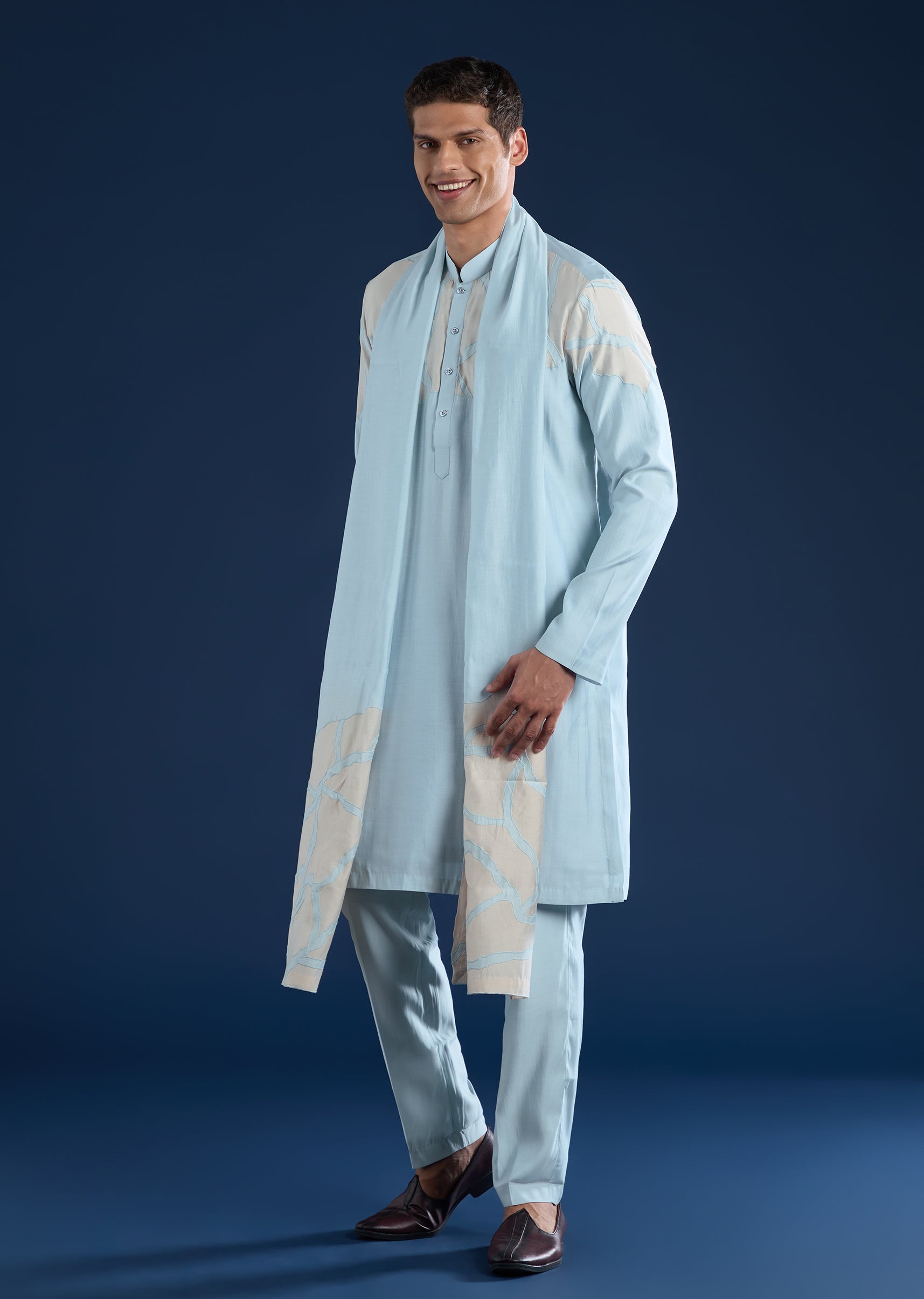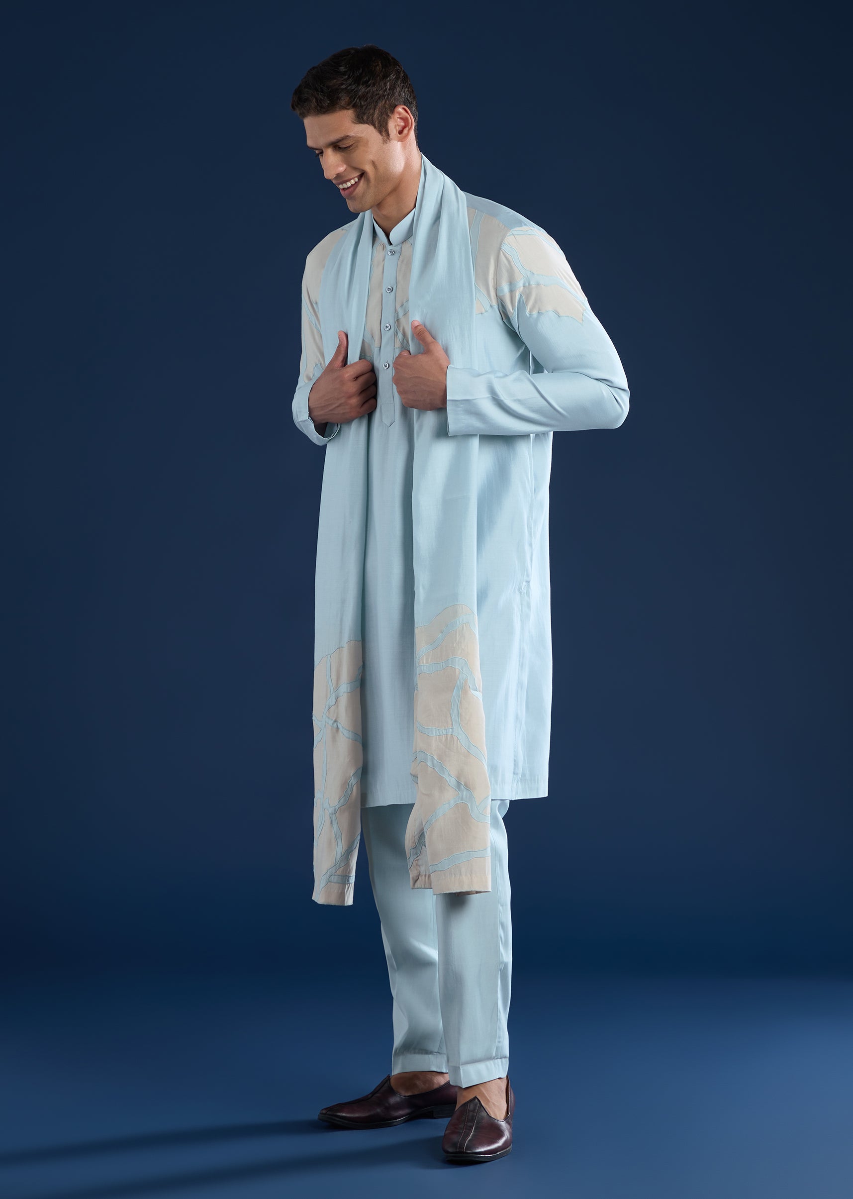 Fresh and festive, this sky blue kurta set is crafted in silk and elevated with delicate appliqué detailing. Designed with a mandarin collar and full sleeves, it comes paired with... More Product Details