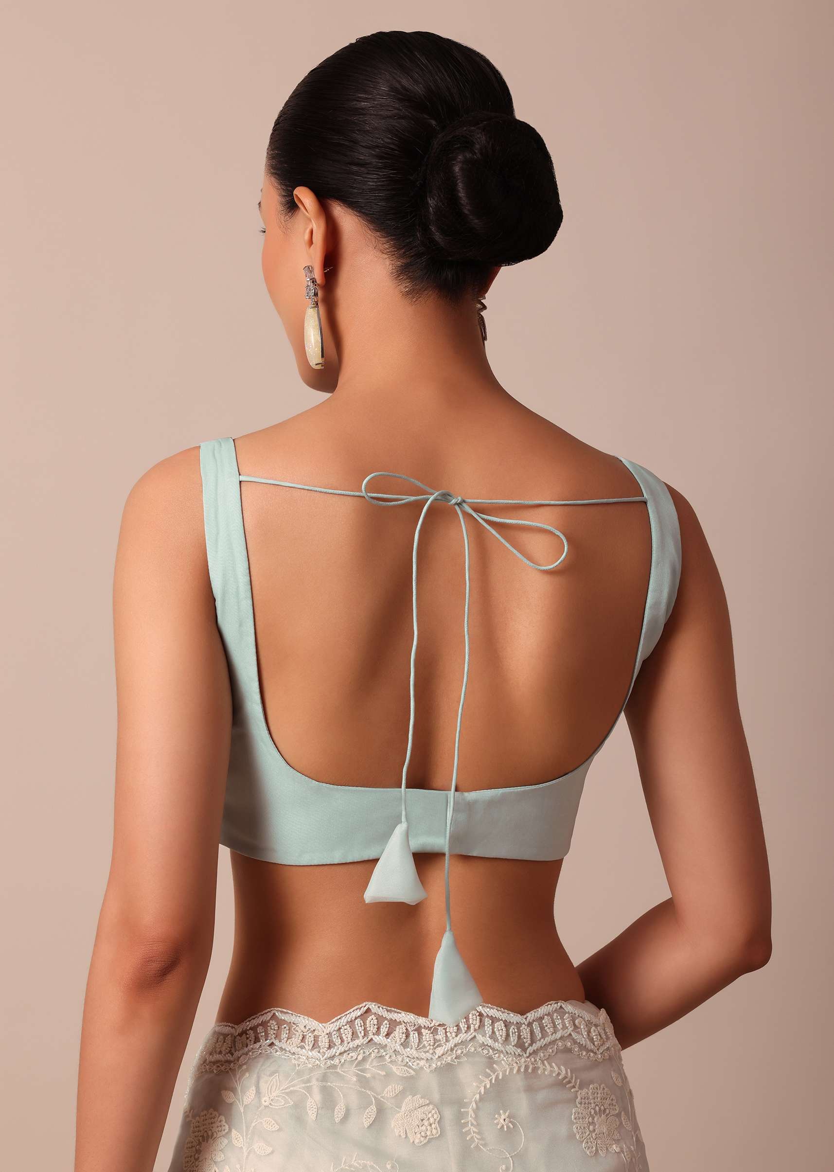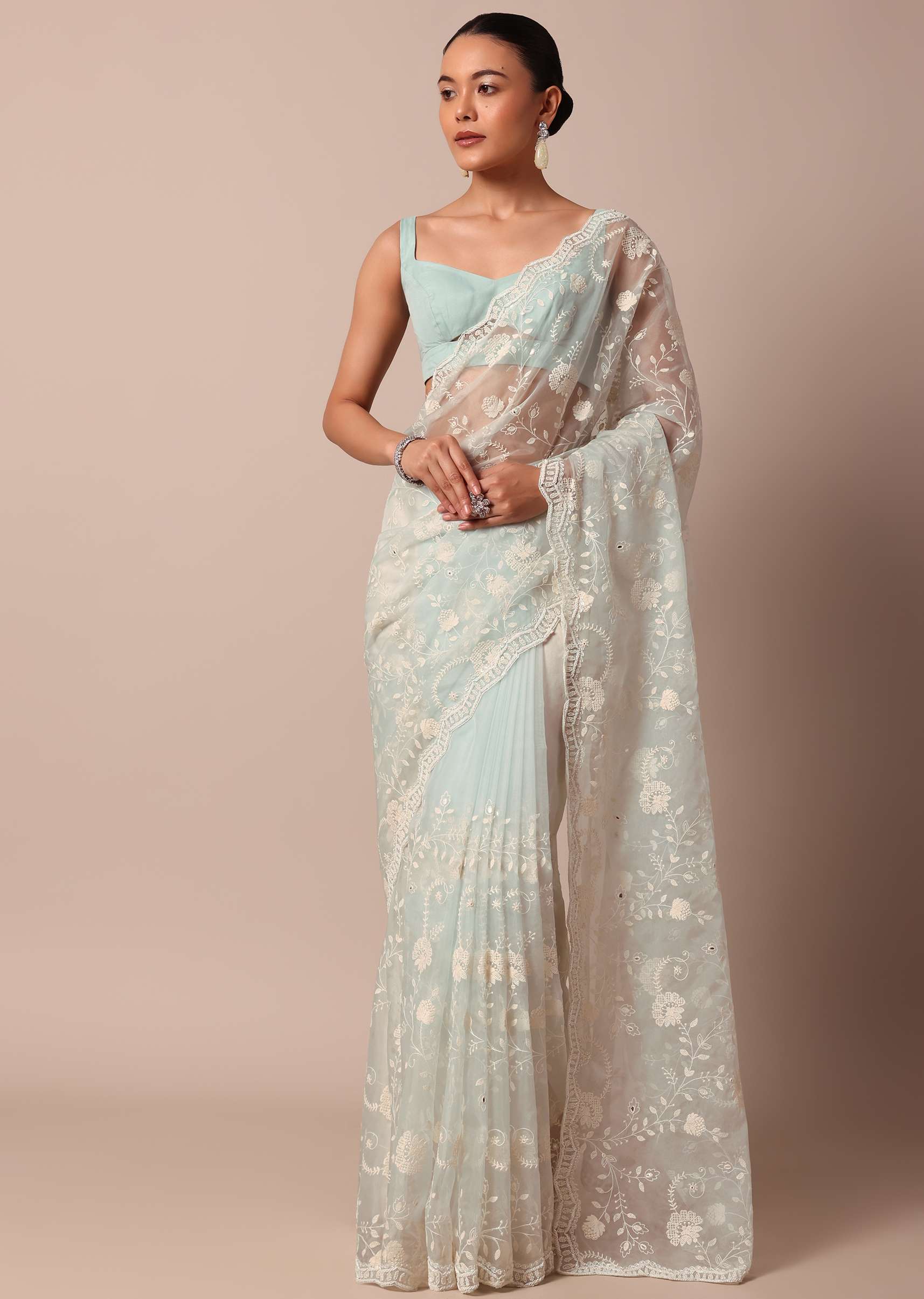 A must-have for year round special occasion is this soothing sky blue saree. Crafted from organza silk fabric it displays traditional chikankari work. Accentuated with mesmerising floral jaal motifs it is elevated with a detailed cutdana scallop border. Completed with an unstitched blouse piece consider this drape your fashionable companion. Awarded As The Most Trusted Brand We'Re Delivering Styles You Love Just As Promised.