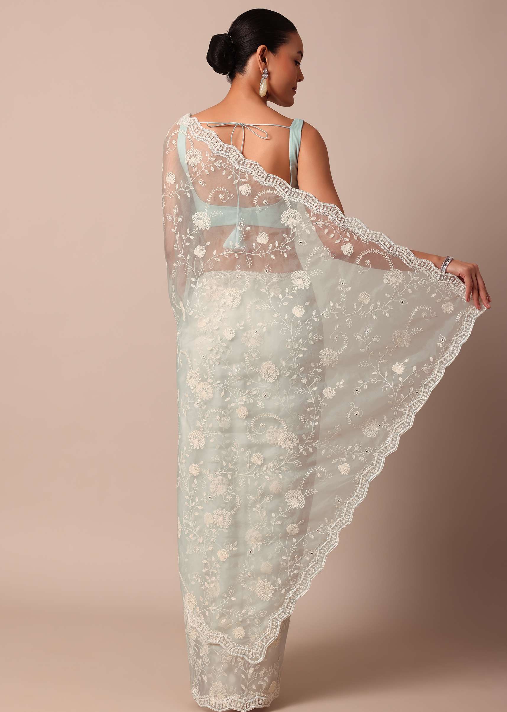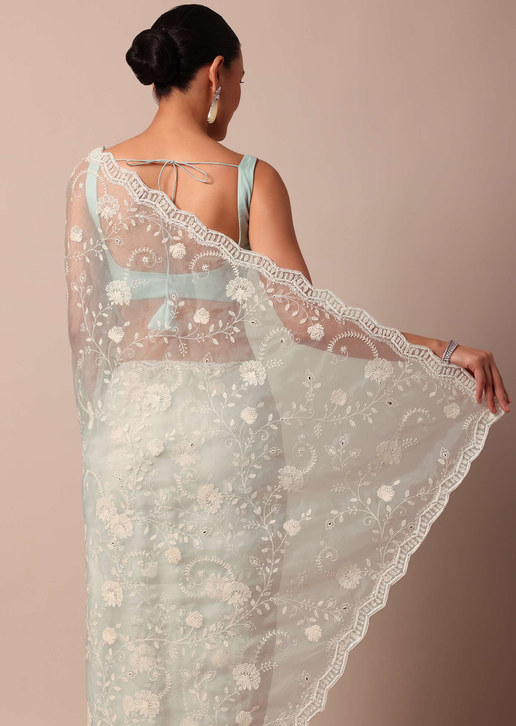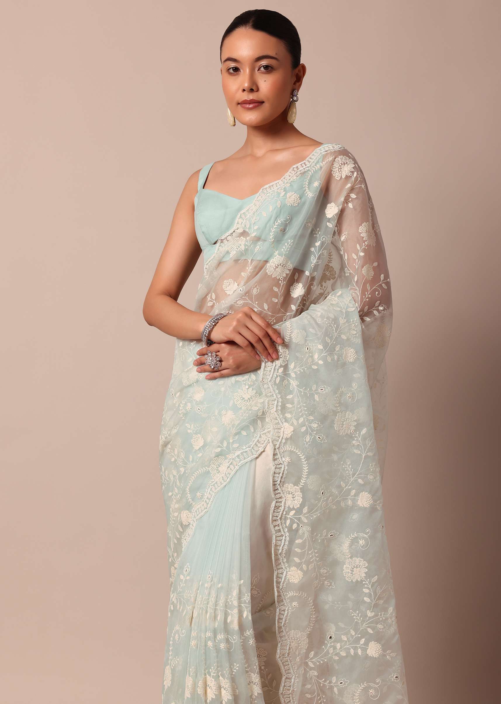 Sky Blue Chikankari Saree In Organza Silk With Scallop Border And Unstitched Blouse Fabric