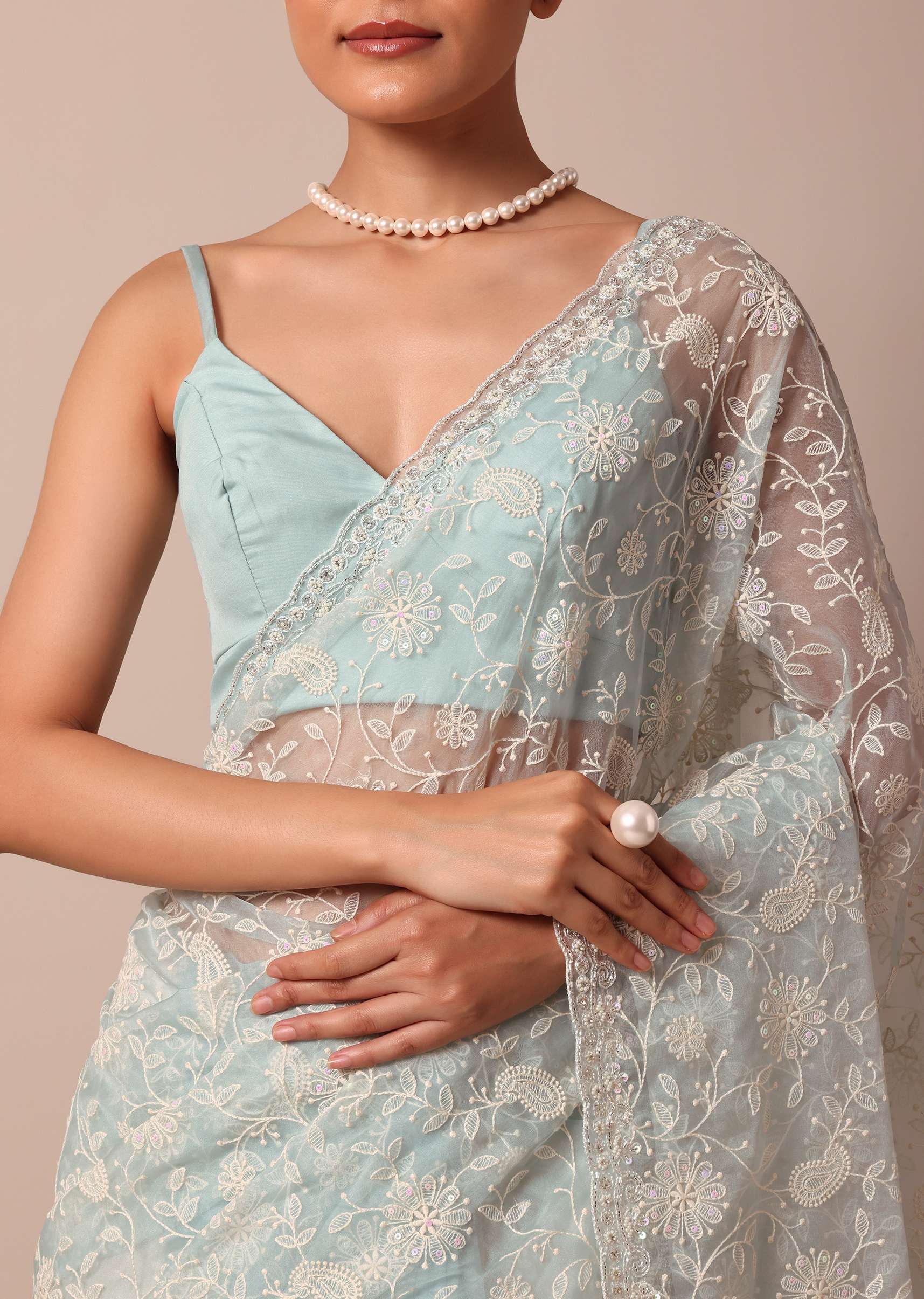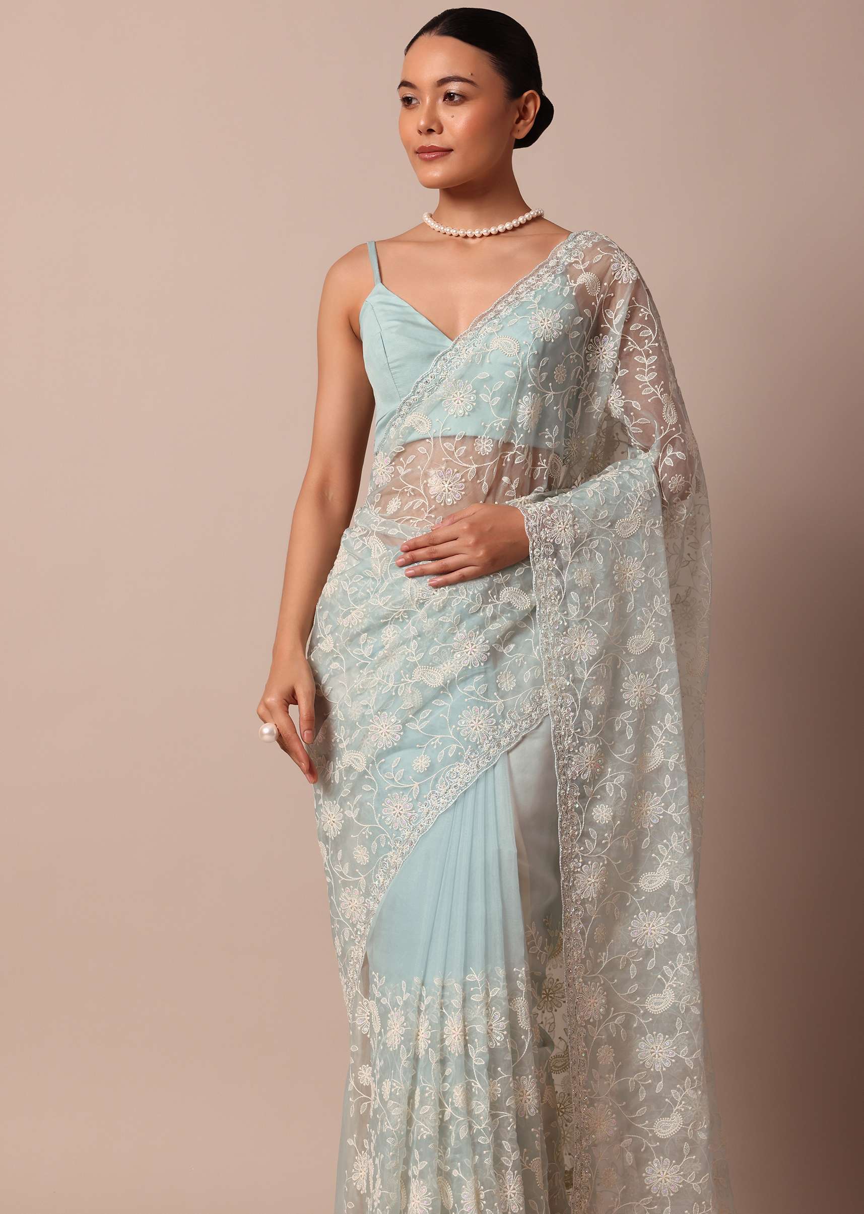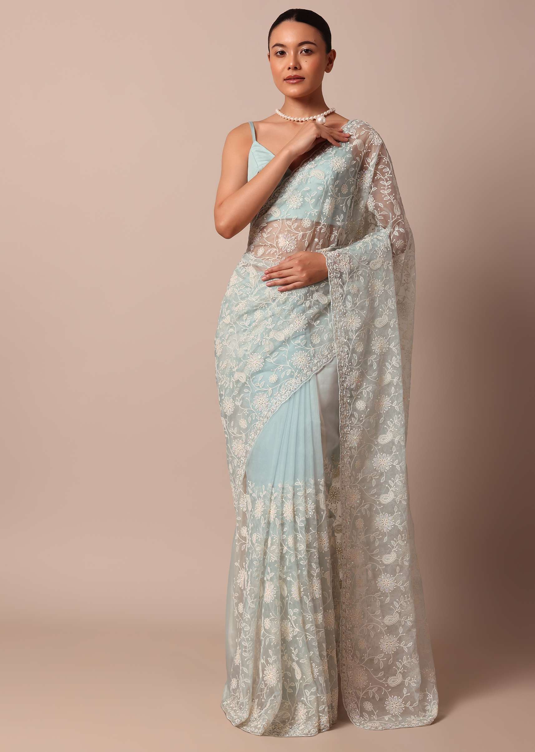 An opulent pick for day-time festive celebrations is this sheer sky blue saree. Fabricated from organza silk it highlights traditional chikankari artistry. Detailed with captivating floral jaal motifs it displays a glistening cutdana beaded border. Completed with an unstitched blouse piece don this drape to win compliments. Awarded As The Most Trusted Brand We'Re Delivering Styles You Love Just As Promised.