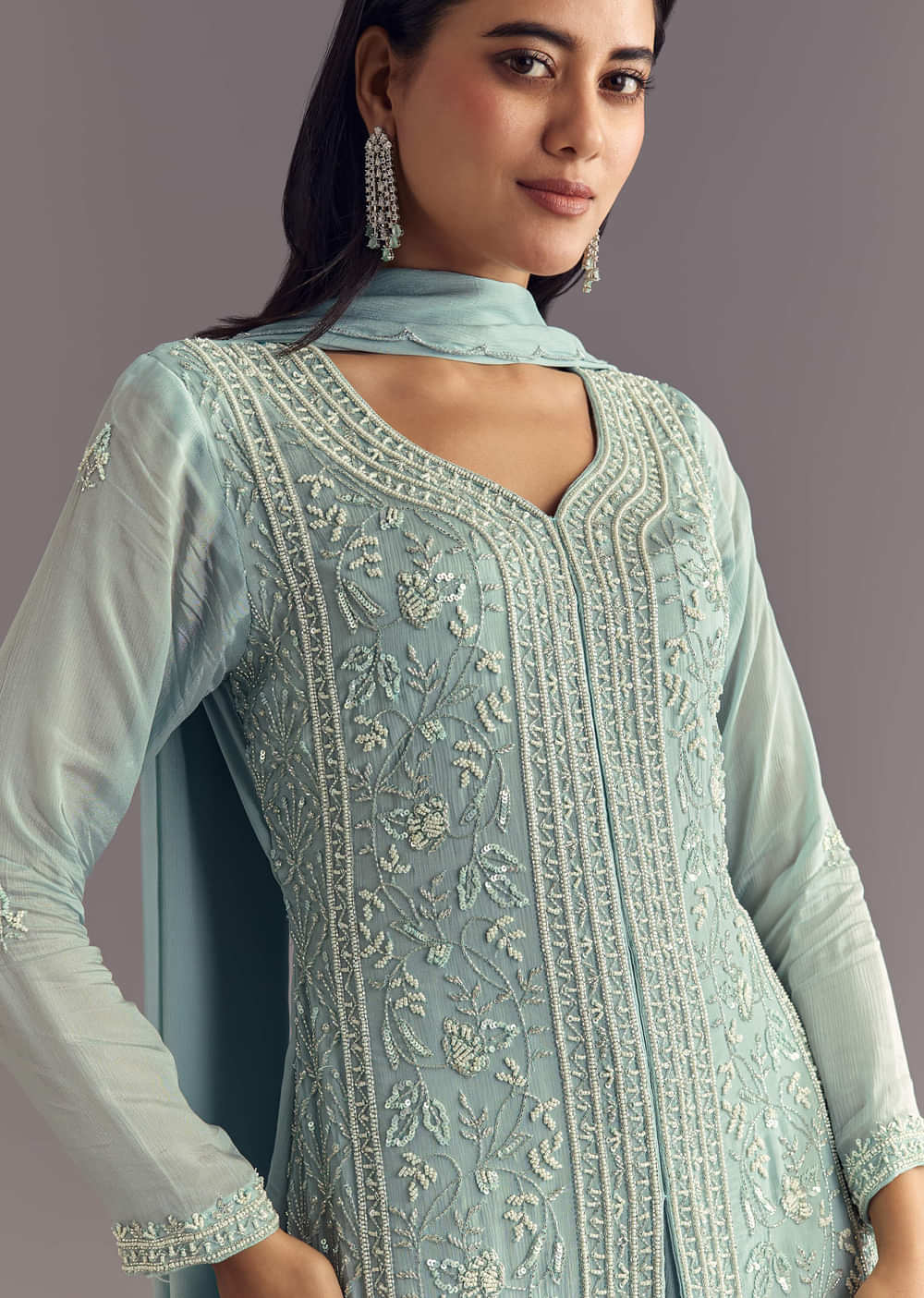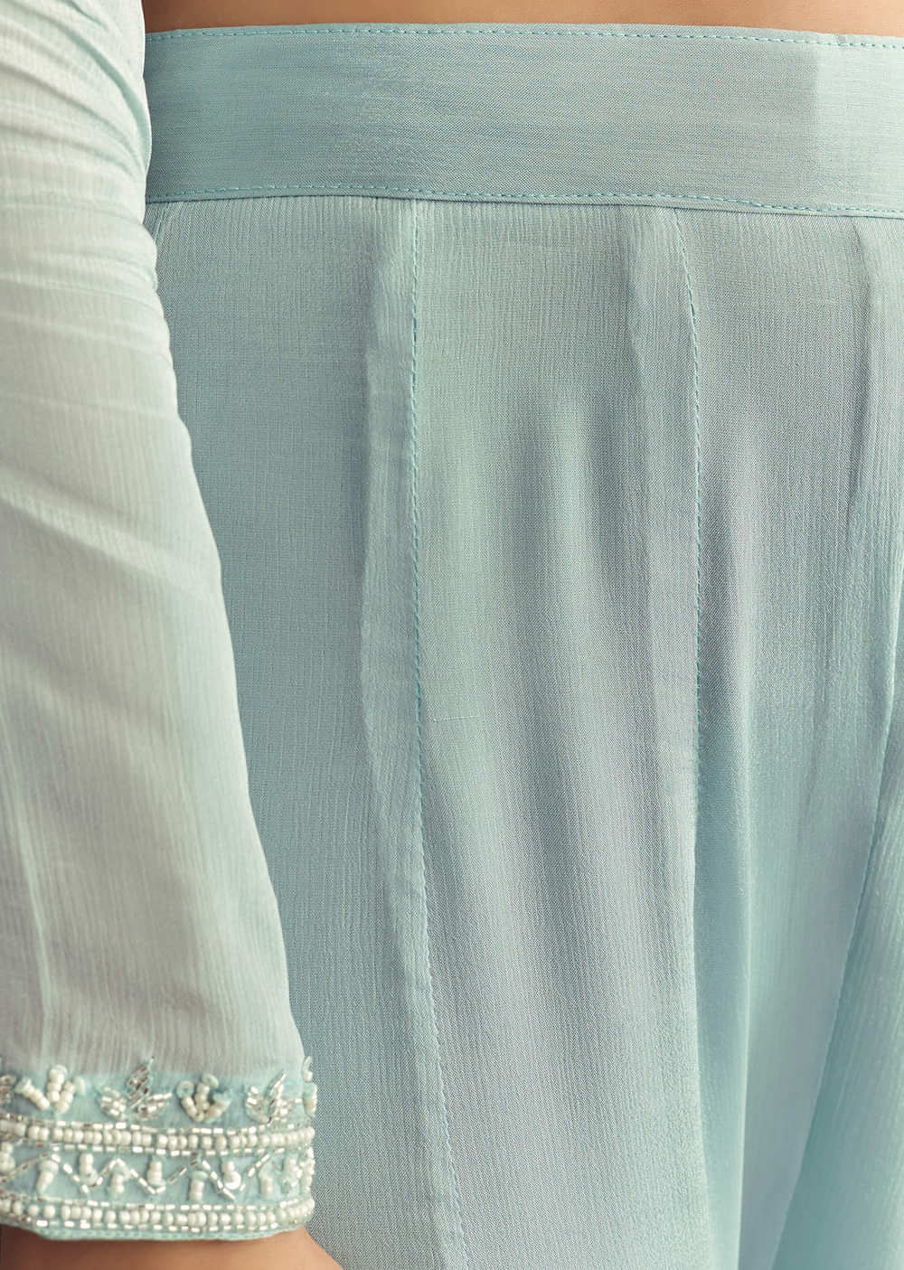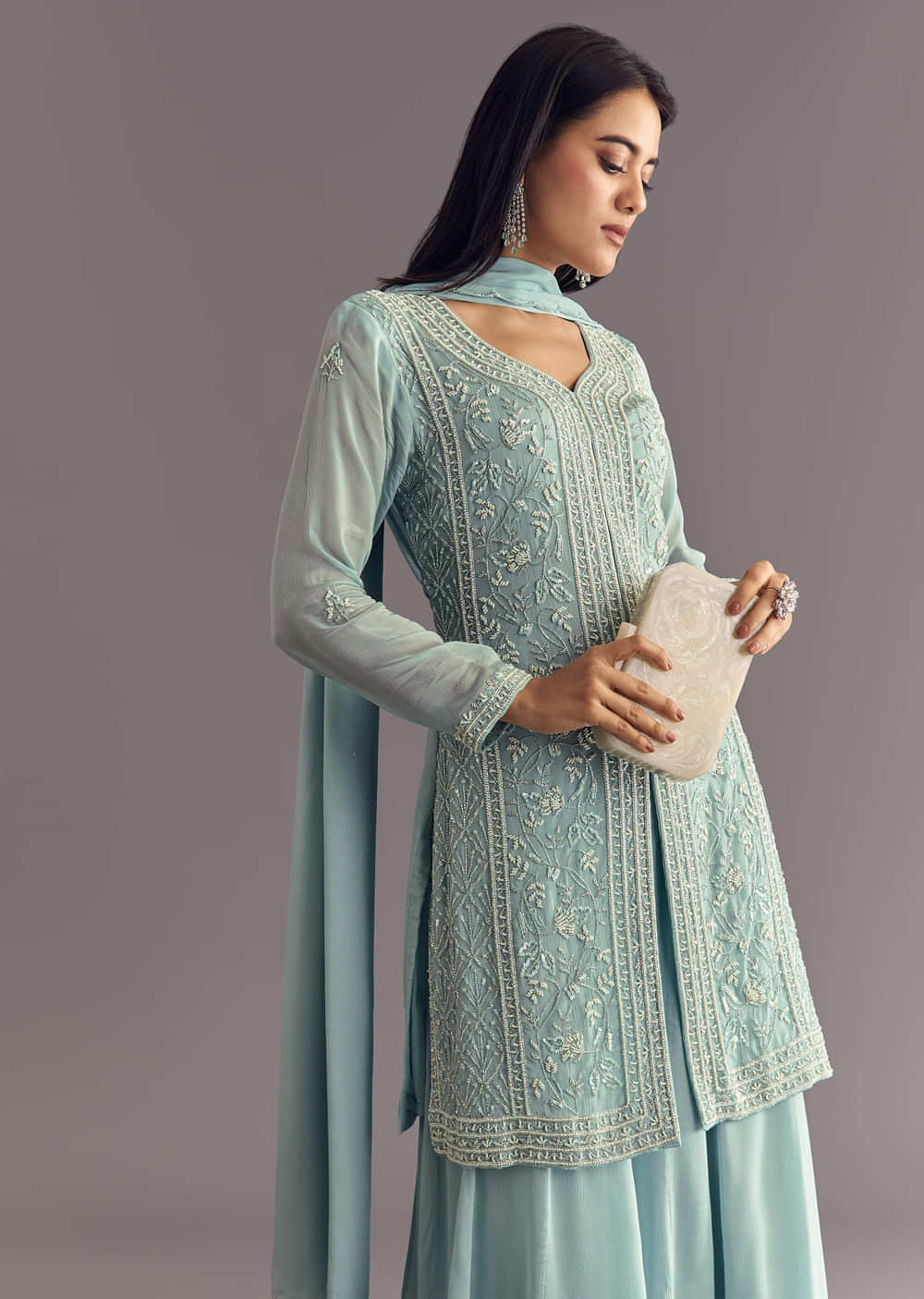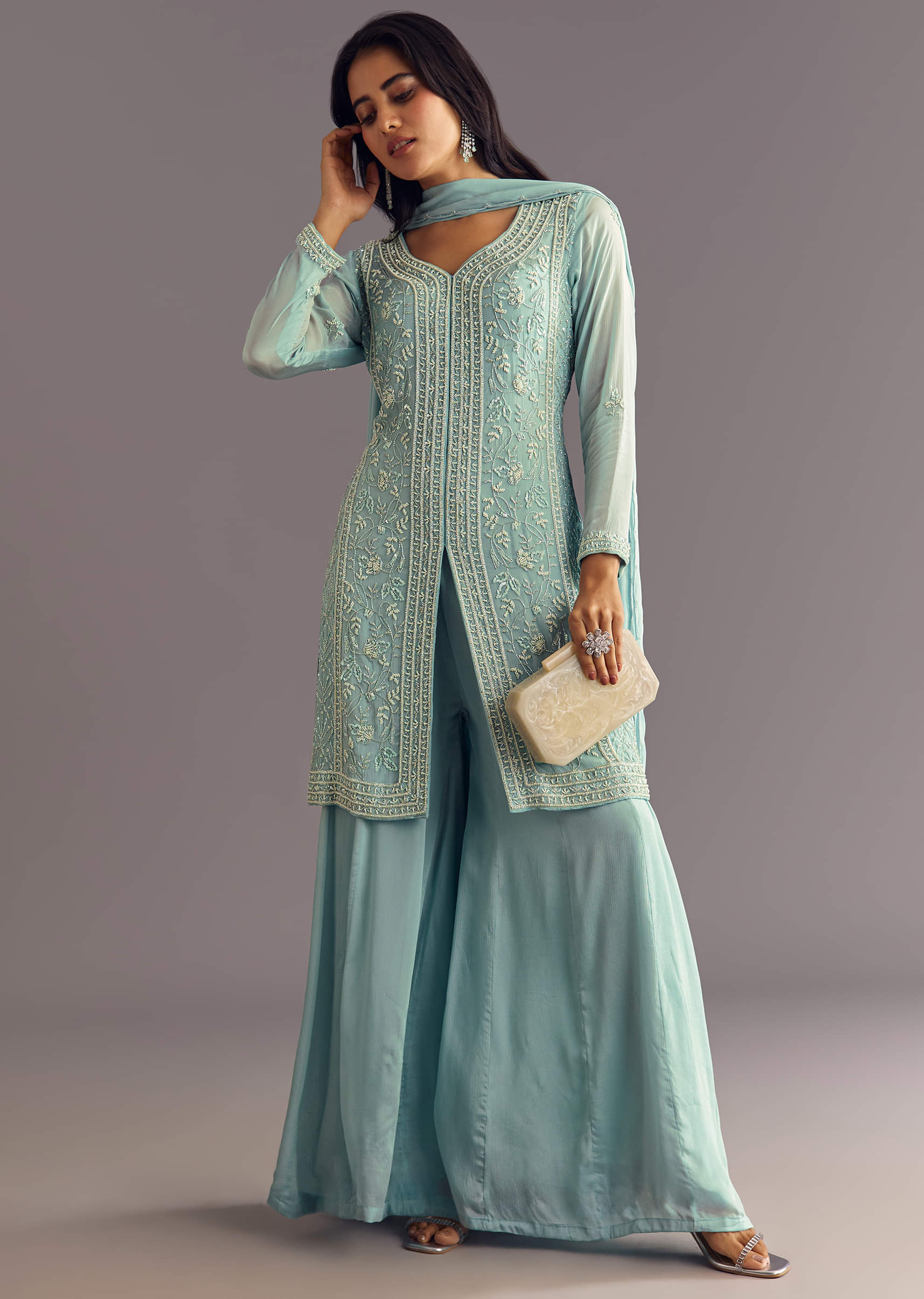 A sky blue chinon kurta hand-embroidered with moti and cut dana work, paired with a twinkling dupatta, perfect for vibrant mehendi moments. Standard Length for the Palazzo is 40" Awarded... More Product Details