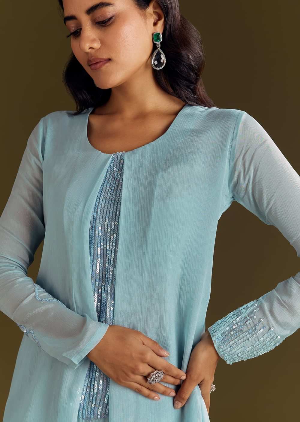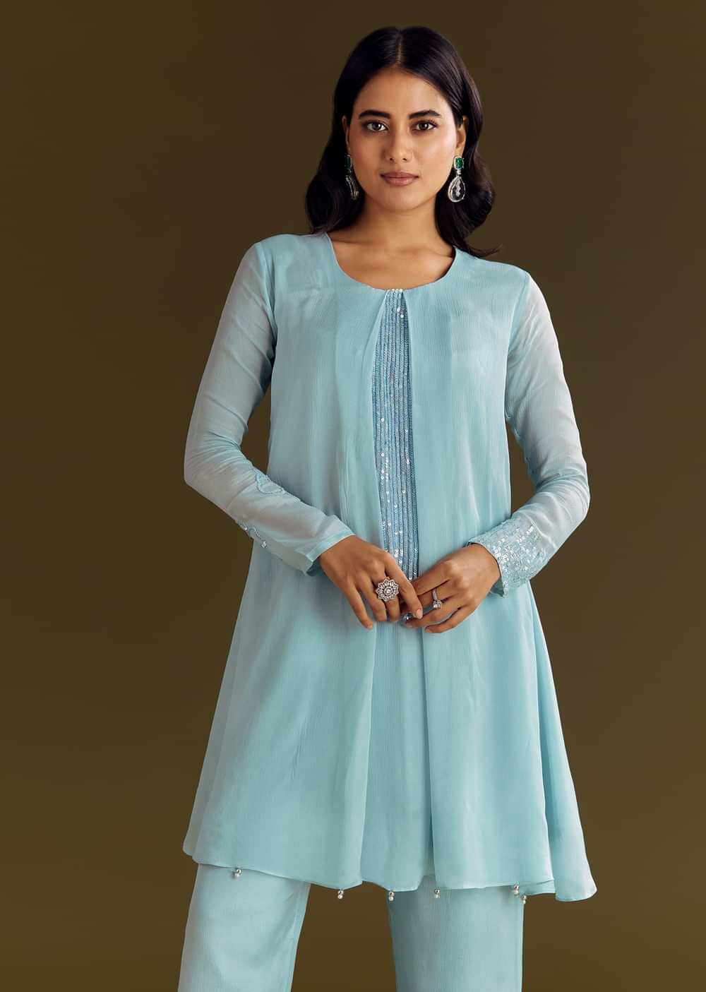 A refreshing sky blue kurta pant set in chinon with subtle sequins detail, made for elevated casual dressing. Awarded as the Most Trusted Brand, we're delivering styles you love, just as promised.