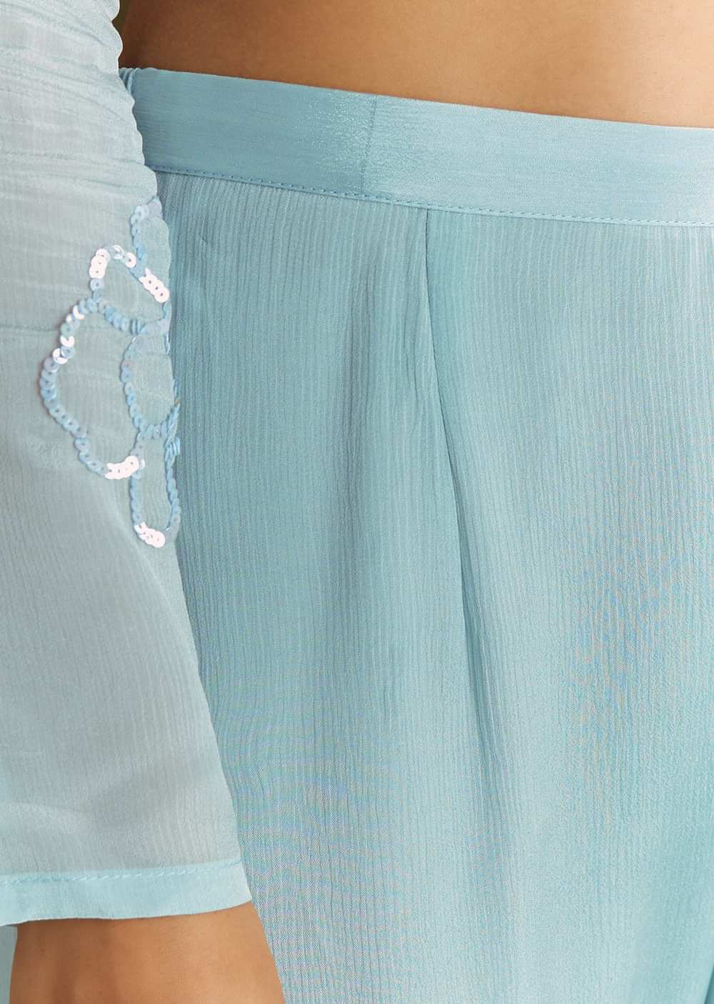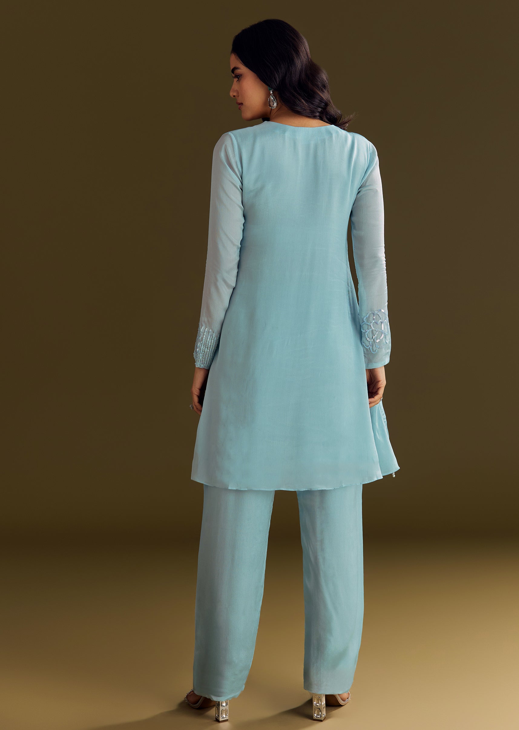 Sky Blue Chinon Kurta Pant Set With Sequins Embroidery