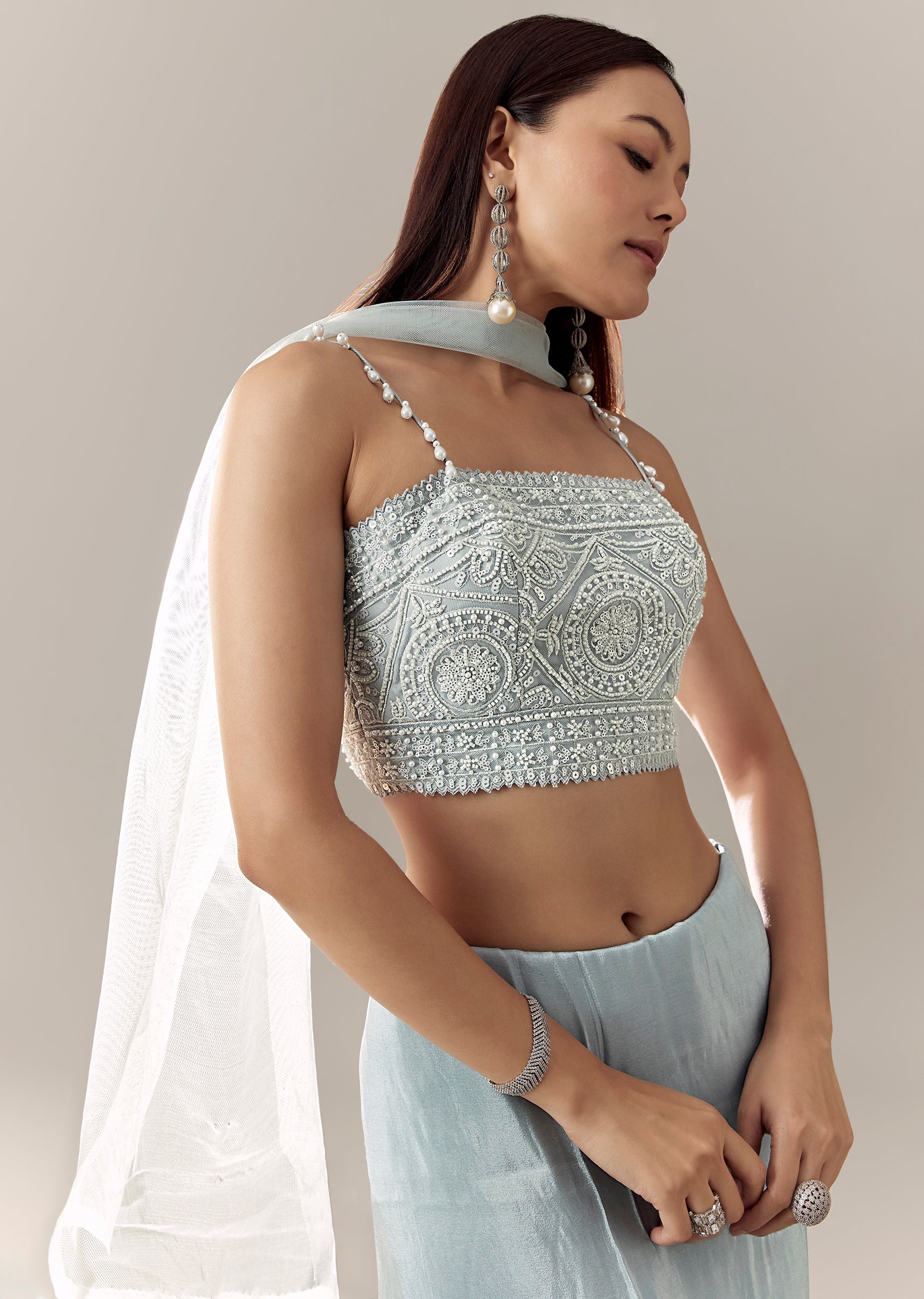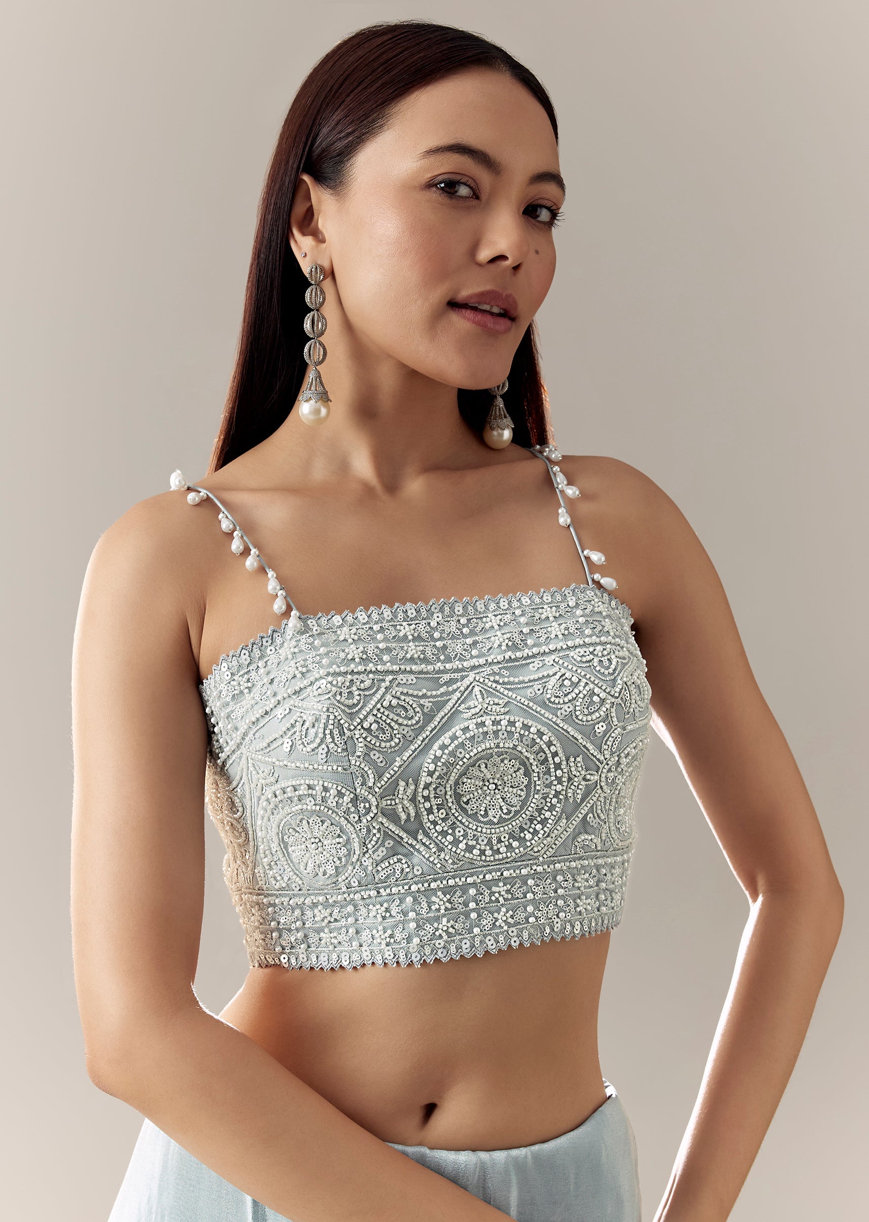 A Milano fancy blouse with a square neckline, noodle straps, cut-dana work, and tassel drop detailing—perfect for cocktail drapes. Awarded as the Most Trusted Brand, we're delivering styles you love, just as promised.
