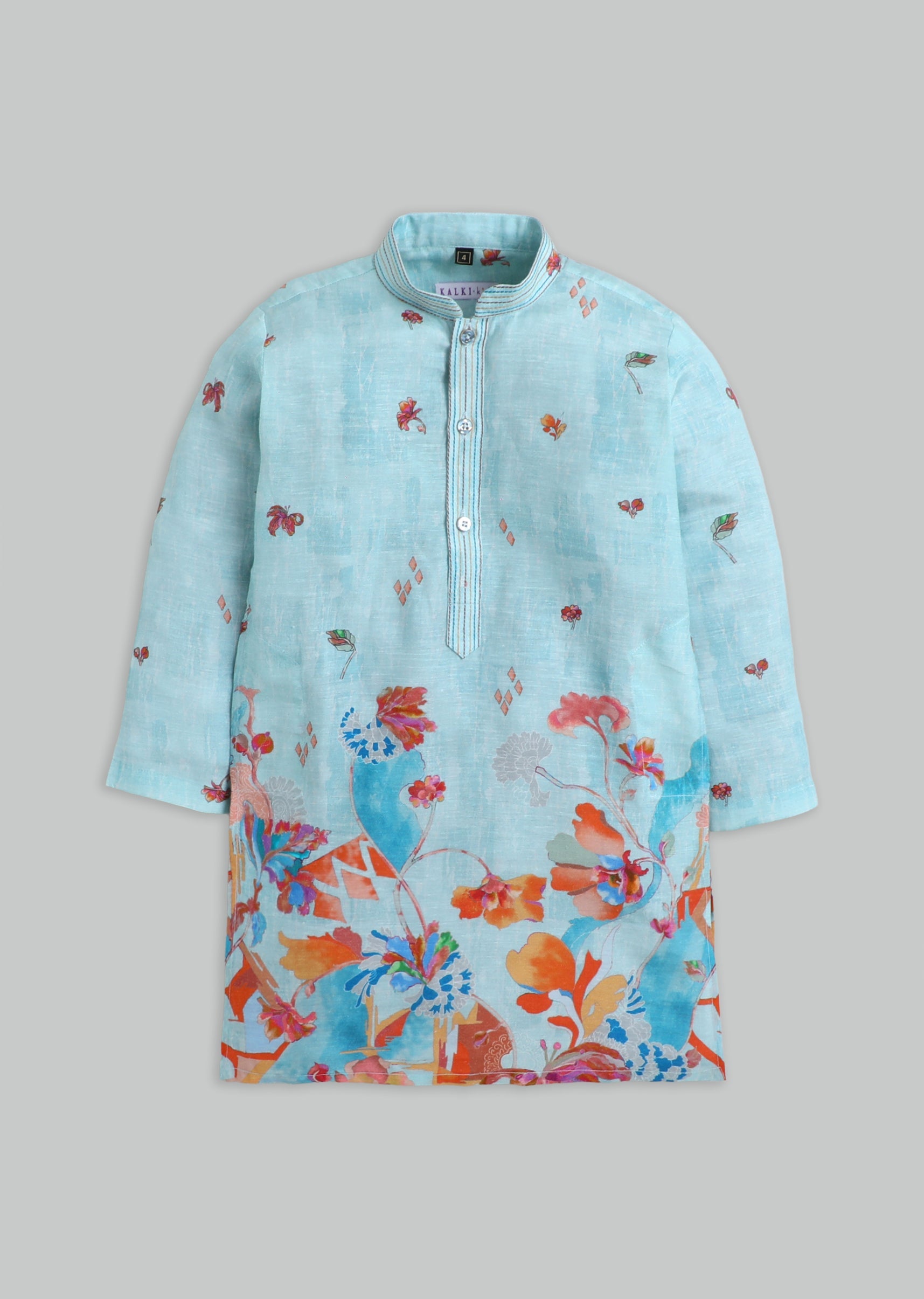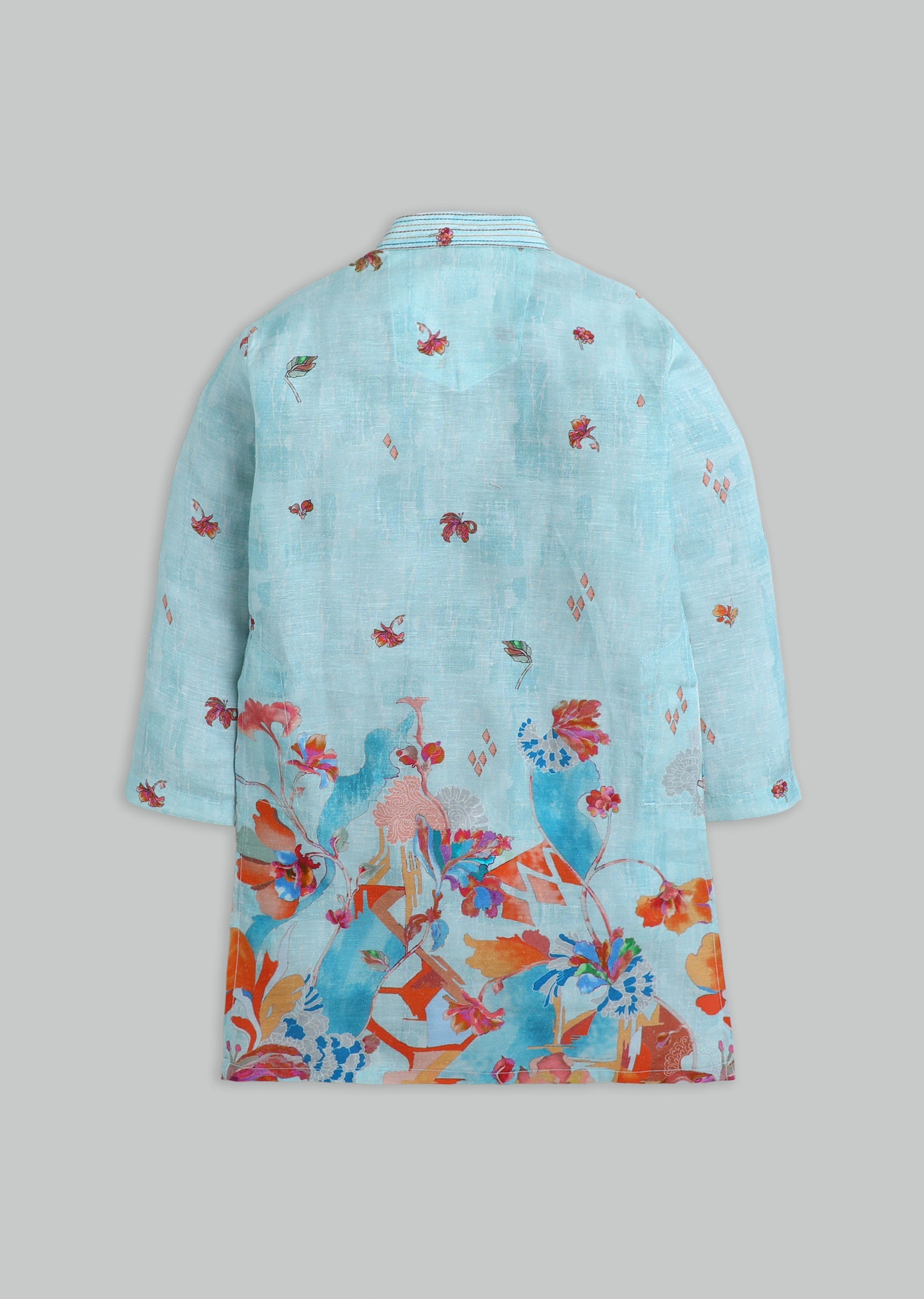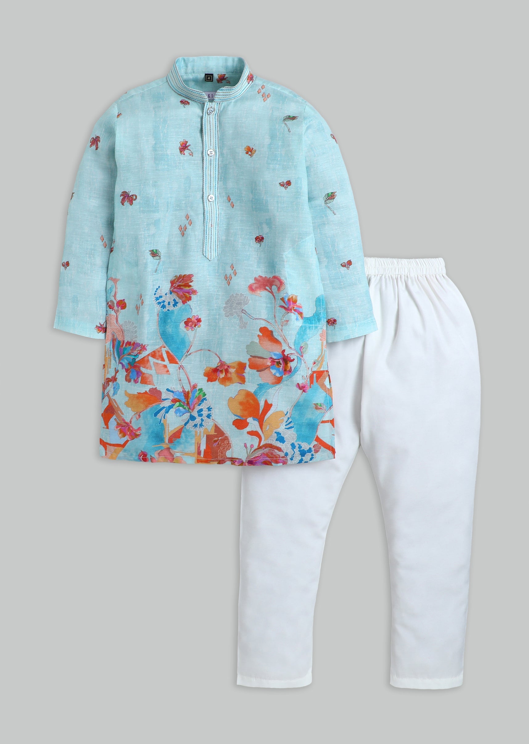 A festive silk kurta set in blue with floral print detailing, styled with a mandarin collar and button front. Paired with matching pants—ideal for weddings and festive celebrations.