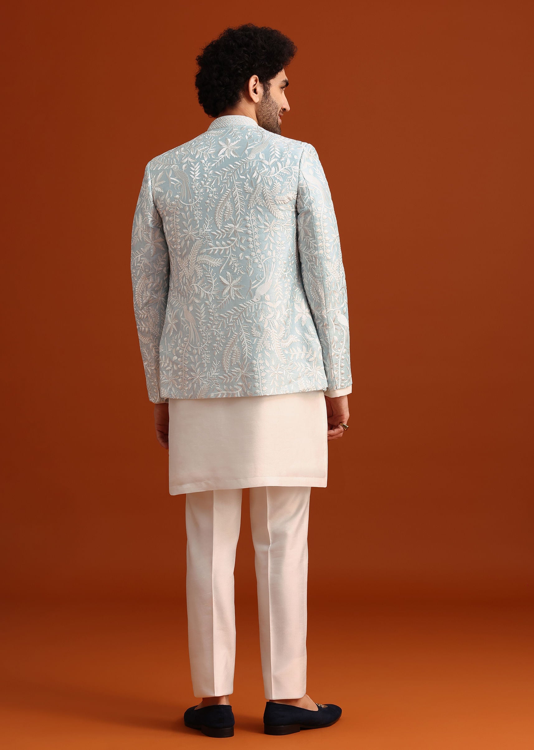 Sky Blue Indo-Western And Kurta Set In Silk With French Knots
