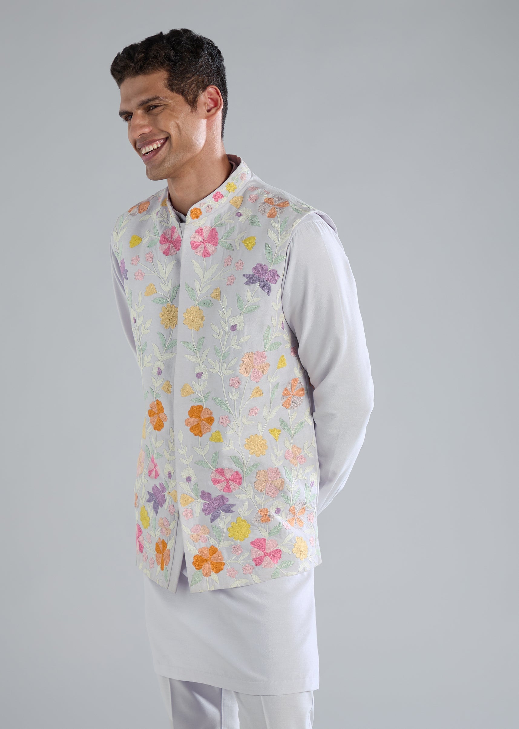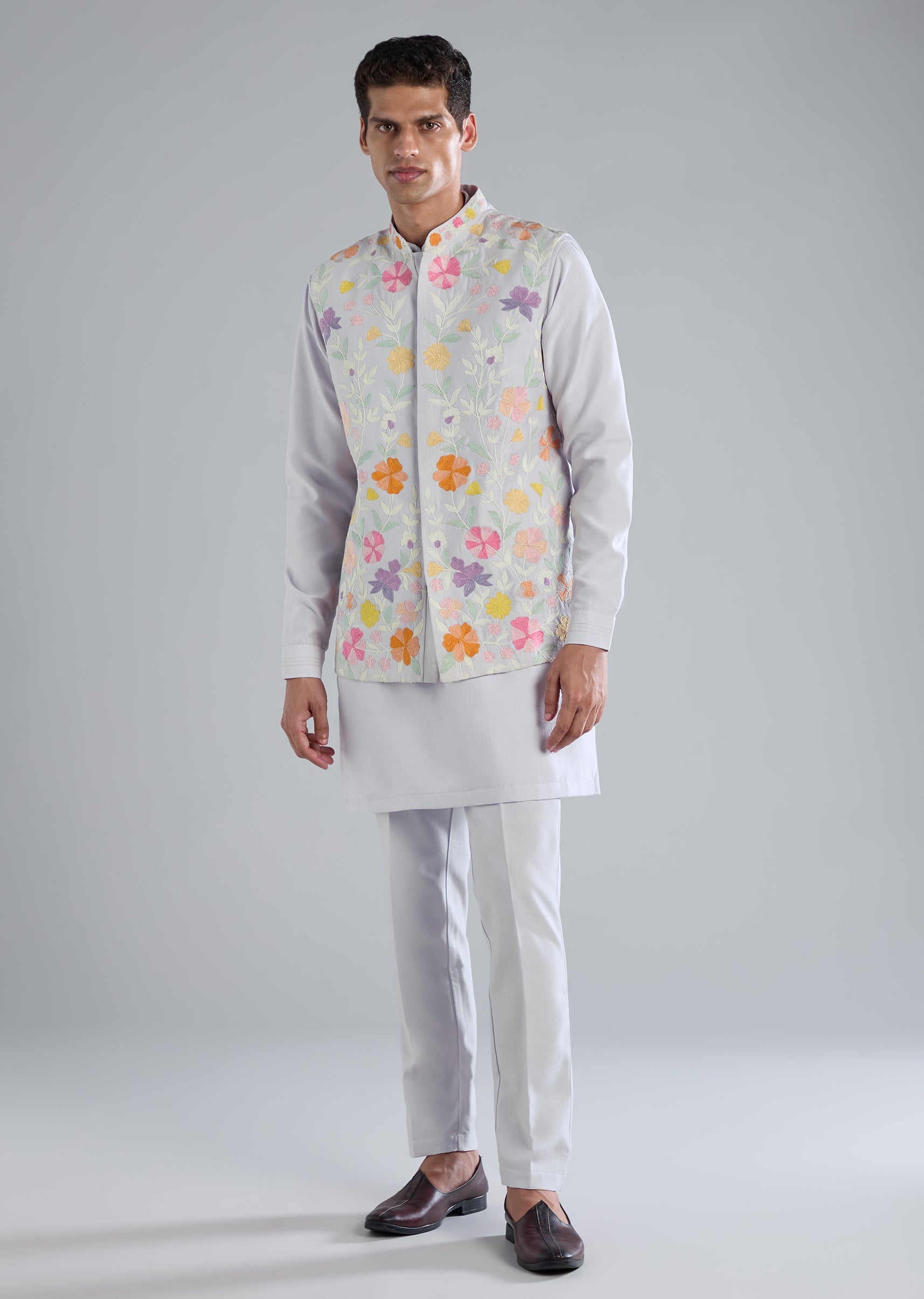 Fresh and festive, this sky blue kurta jacket set crafted in smooth silk fabric is perfect for haldi and mehendi celebrations or for attending a wedding as a guest. The... More Product Details