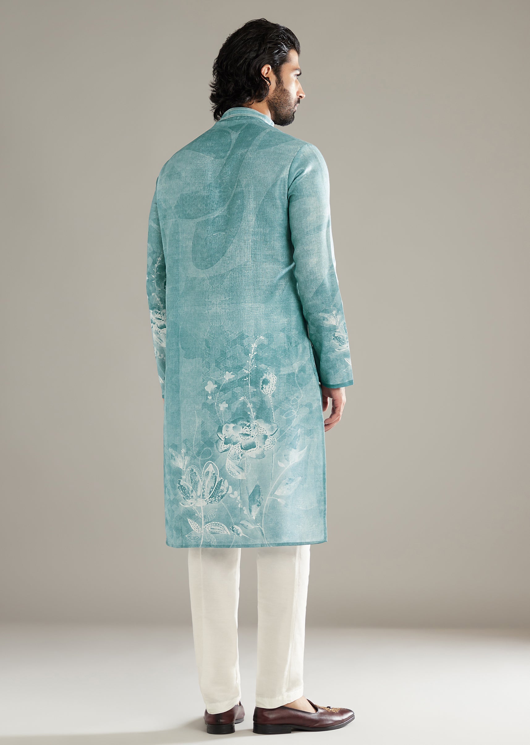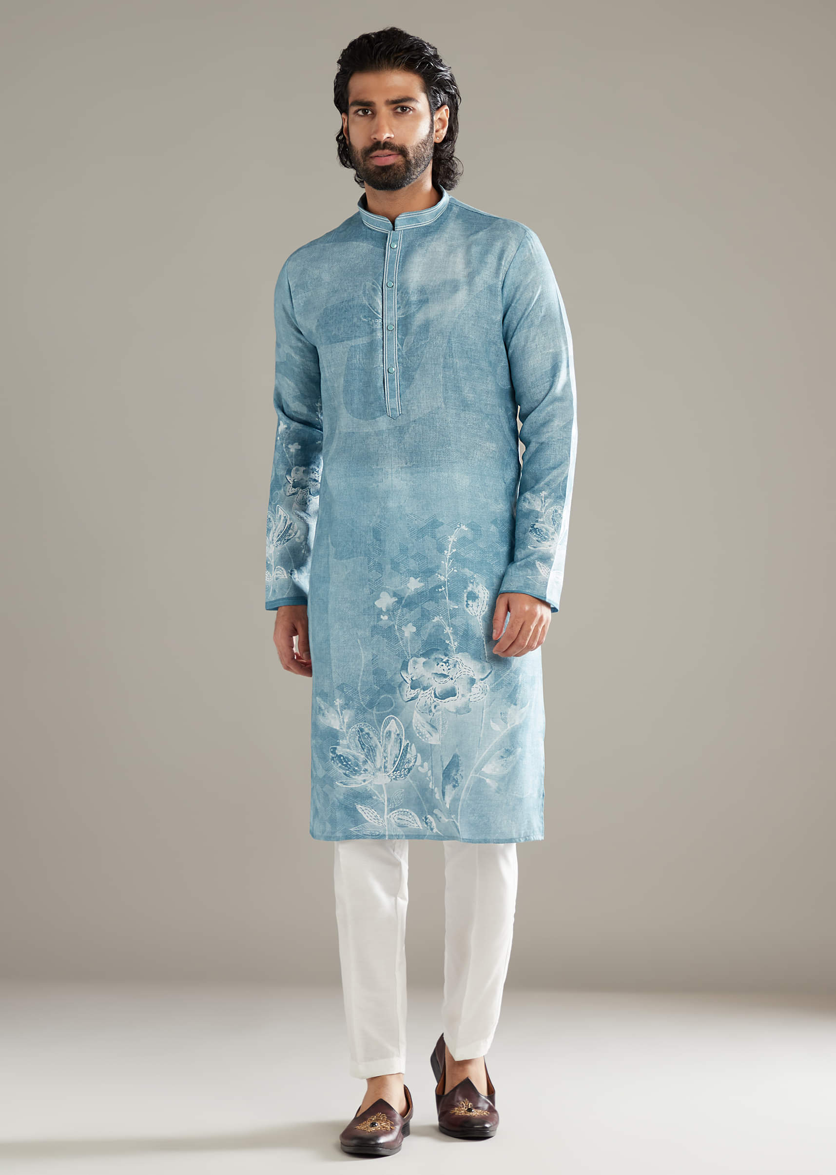 Sky Blue Kurta Set For Men With Printed Floral Motifs