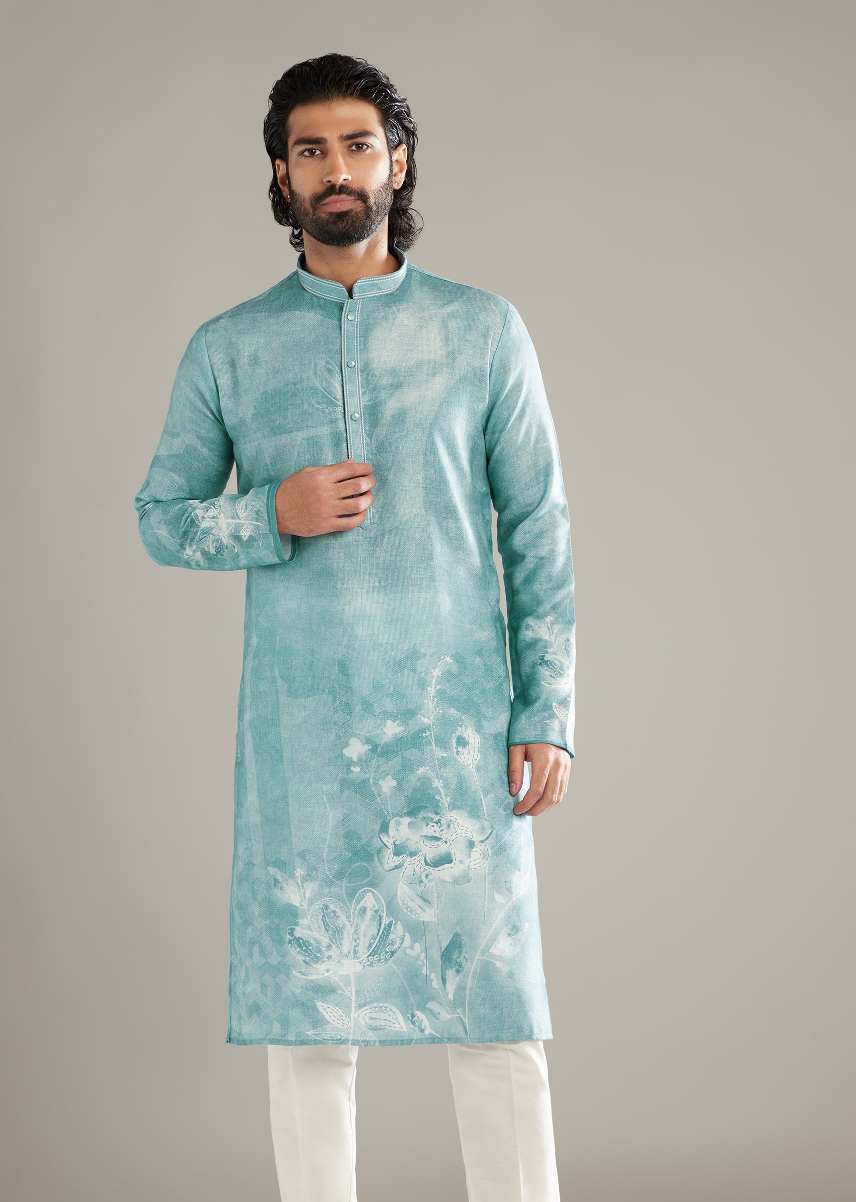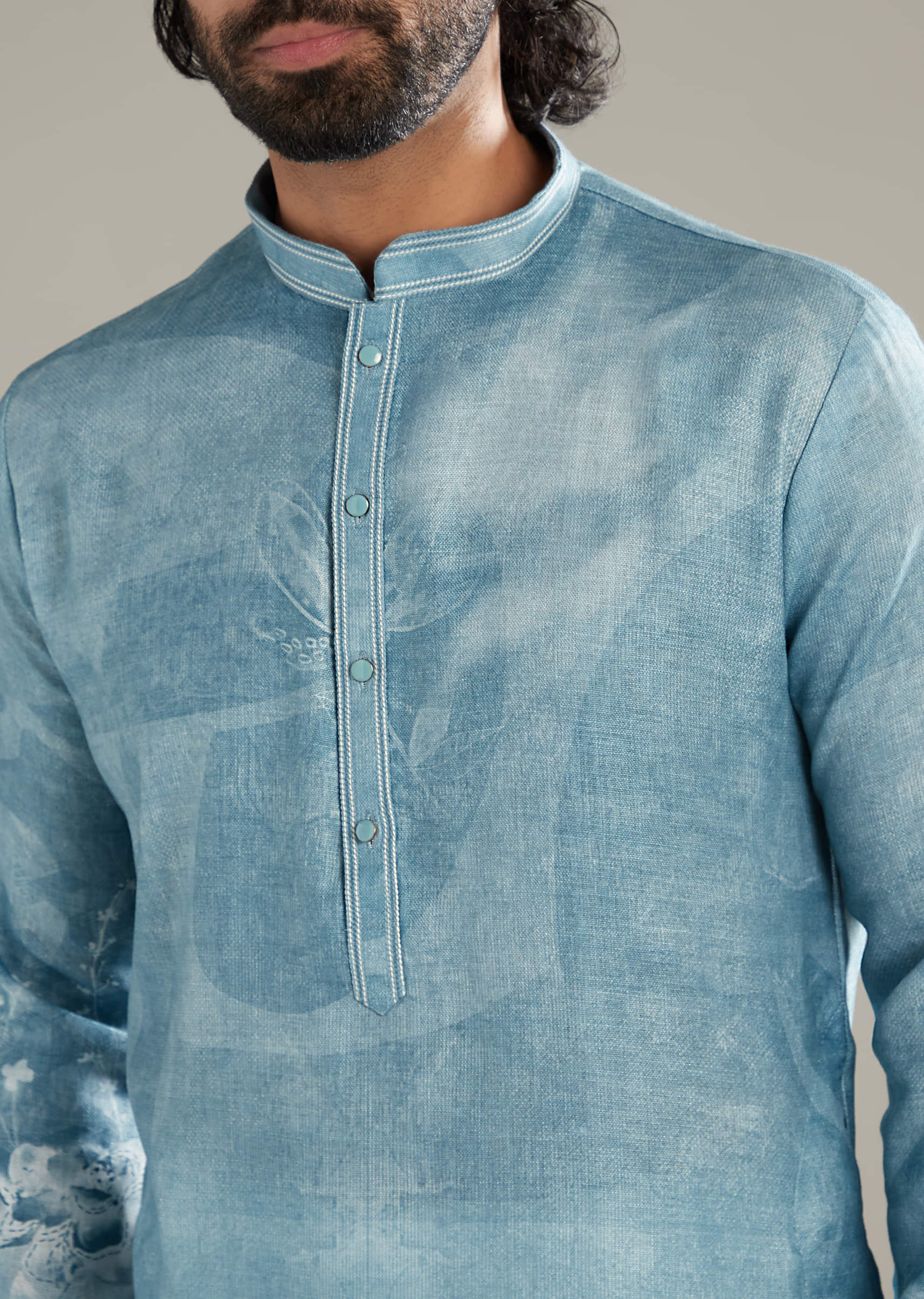 The first thing you notice is how this sky blue linen blend men’s kurta set frames the look with floral motifs at the chest, sleeves, and hem, keeping it fresh,... More Product Details