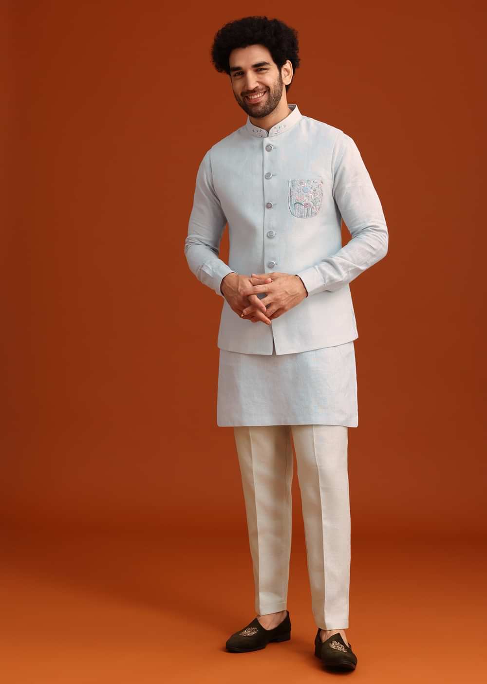 Sky Blue Linen Kurta Jacket Set With Resham Work