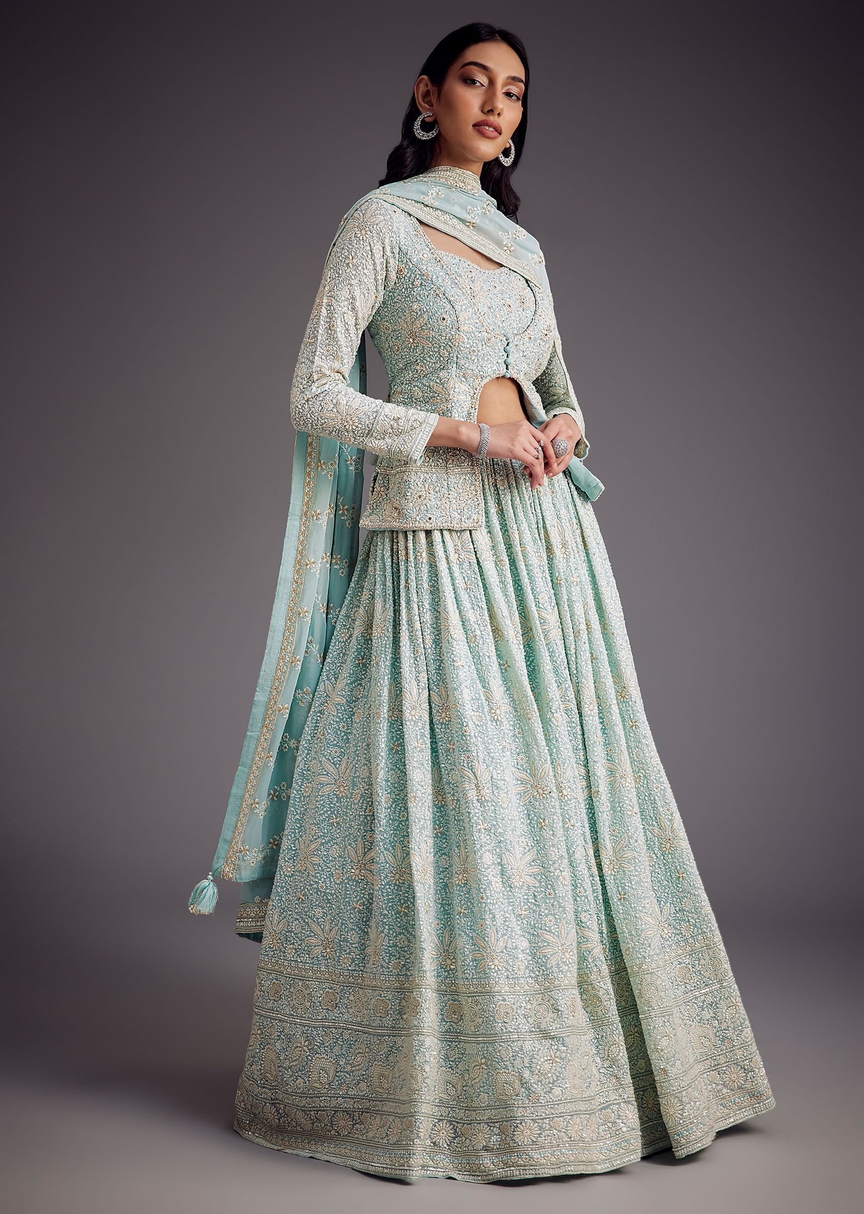 This sky blue lehenga set is a serene masterpiece, adorned with delicate floral hand embroidery that evokes a sense of timeless beauty. The pleated lehenga is paired with a front-button kurta, blending traditional craftsmanship with modern aesthetics. The sheer dupatta, detailed with subtle floral patterns, adds a soft elegance, making this ensemble perfect for day weddings, sangeet nights, or summer festivities where understated charm reigns supreme. Awarded as the Most Trusted Brand, we're delivering styles you love, just as promised.