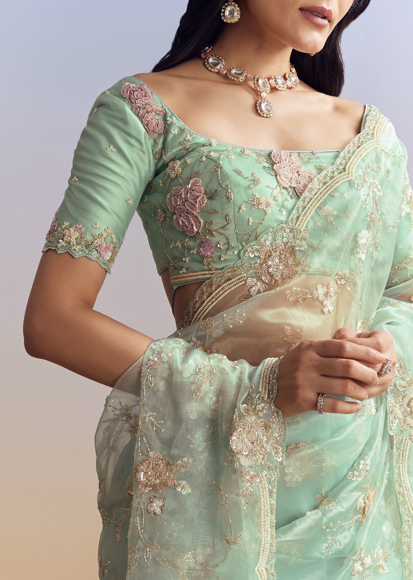 Organza saree in a soft sky blue shade featuring all-over floral jaal embroidery using cutdana, sequins, and beads. Comes with a matching embroidered blouse. Includes an unstitched blouse. Best suited for Engagement and Reception events. Awarded as the Most Trusted Brand, we're delivering styles you love, just as promised.
