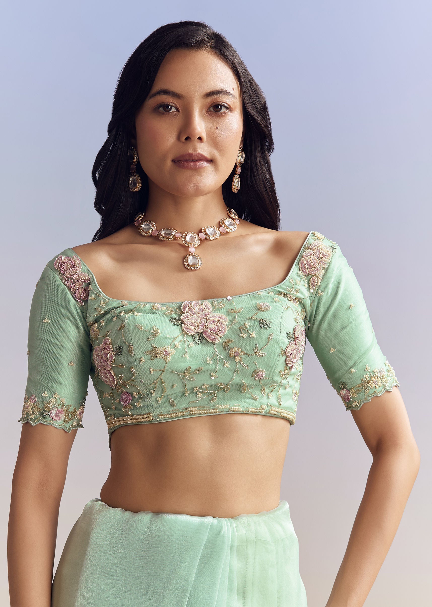 Organza saree in a soft sky blue shade featuring all-over floral jaal embroidery using cutdana, sequins, and beads. Comes with a matching embroidered blouse. Includes an unstitched blouse. Best suited... More Product Details