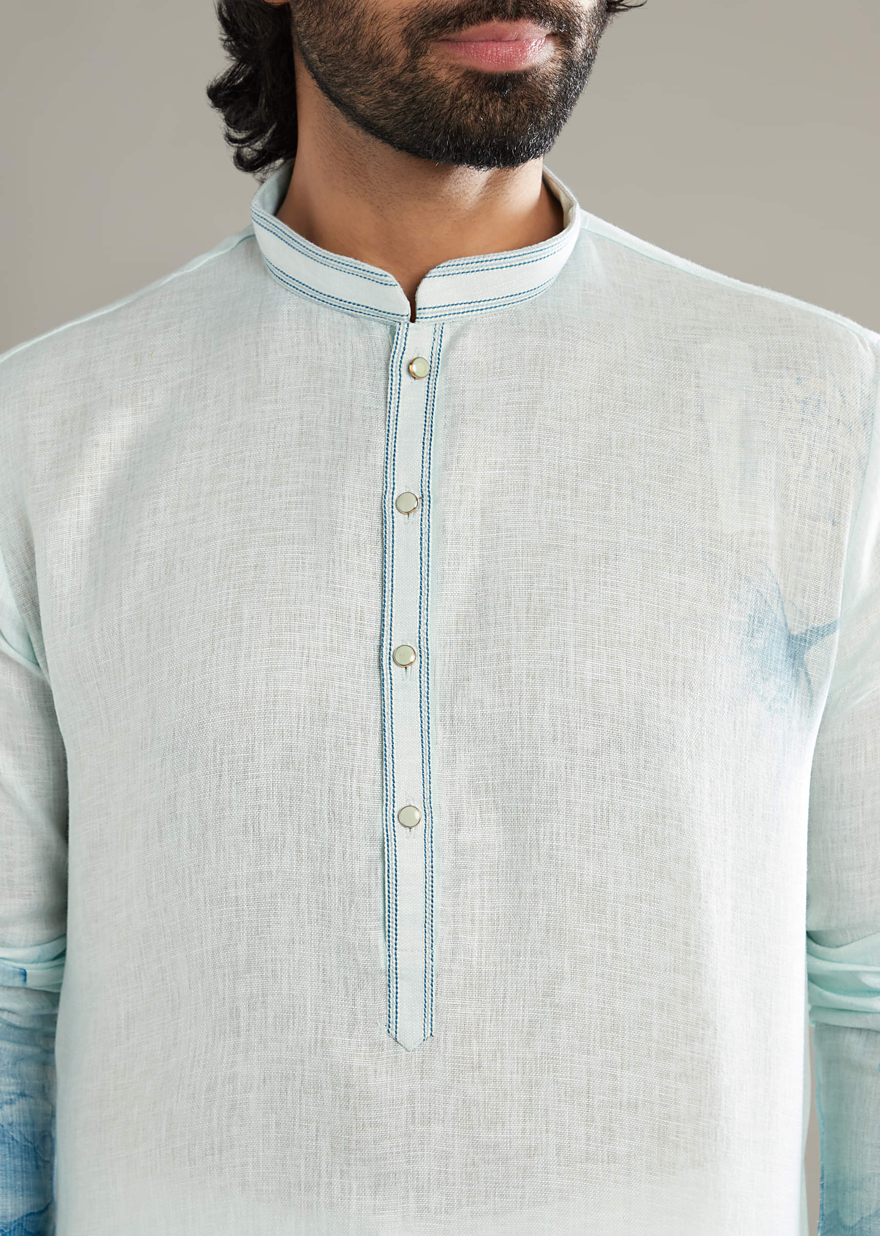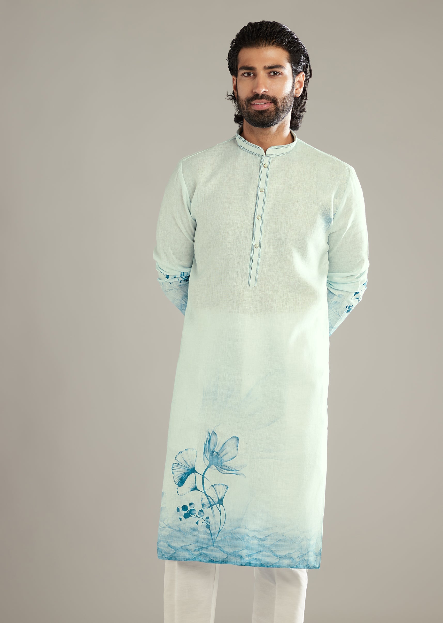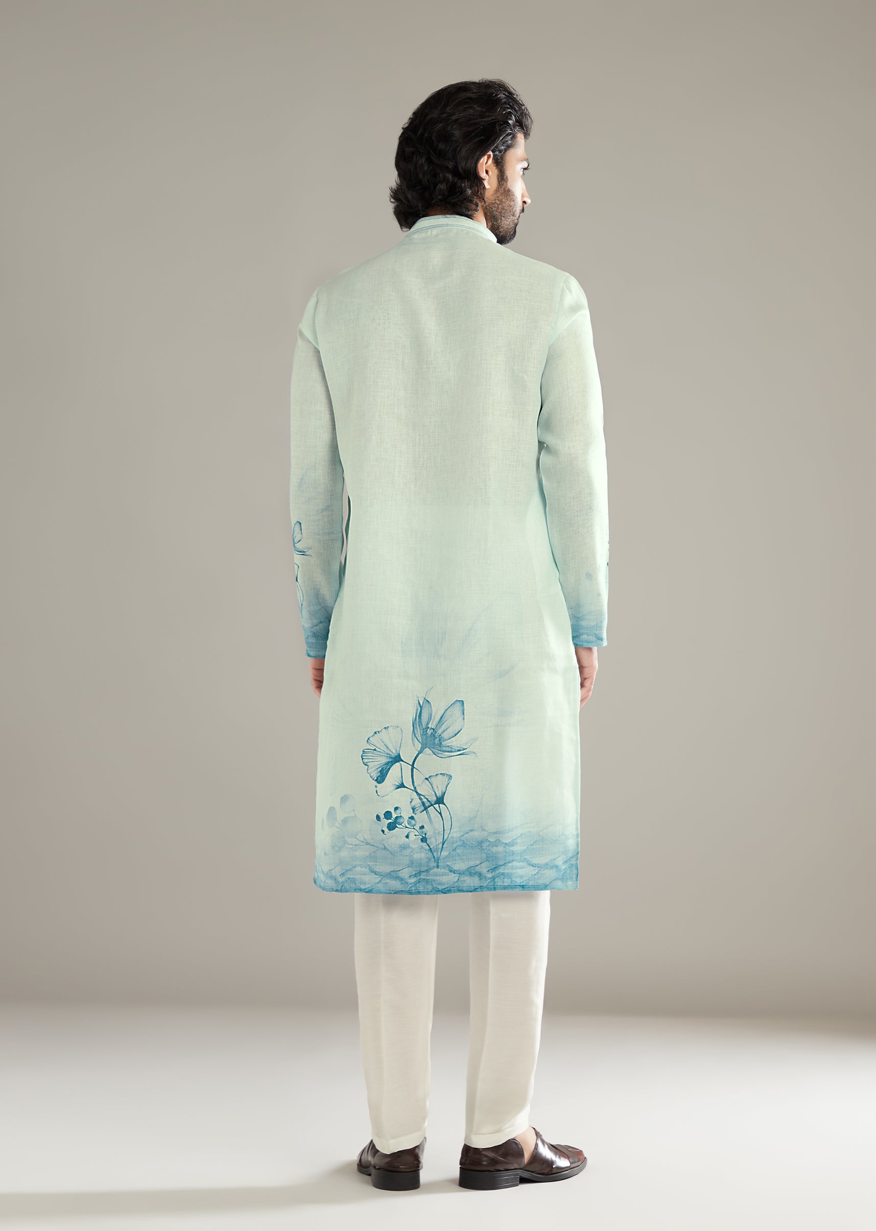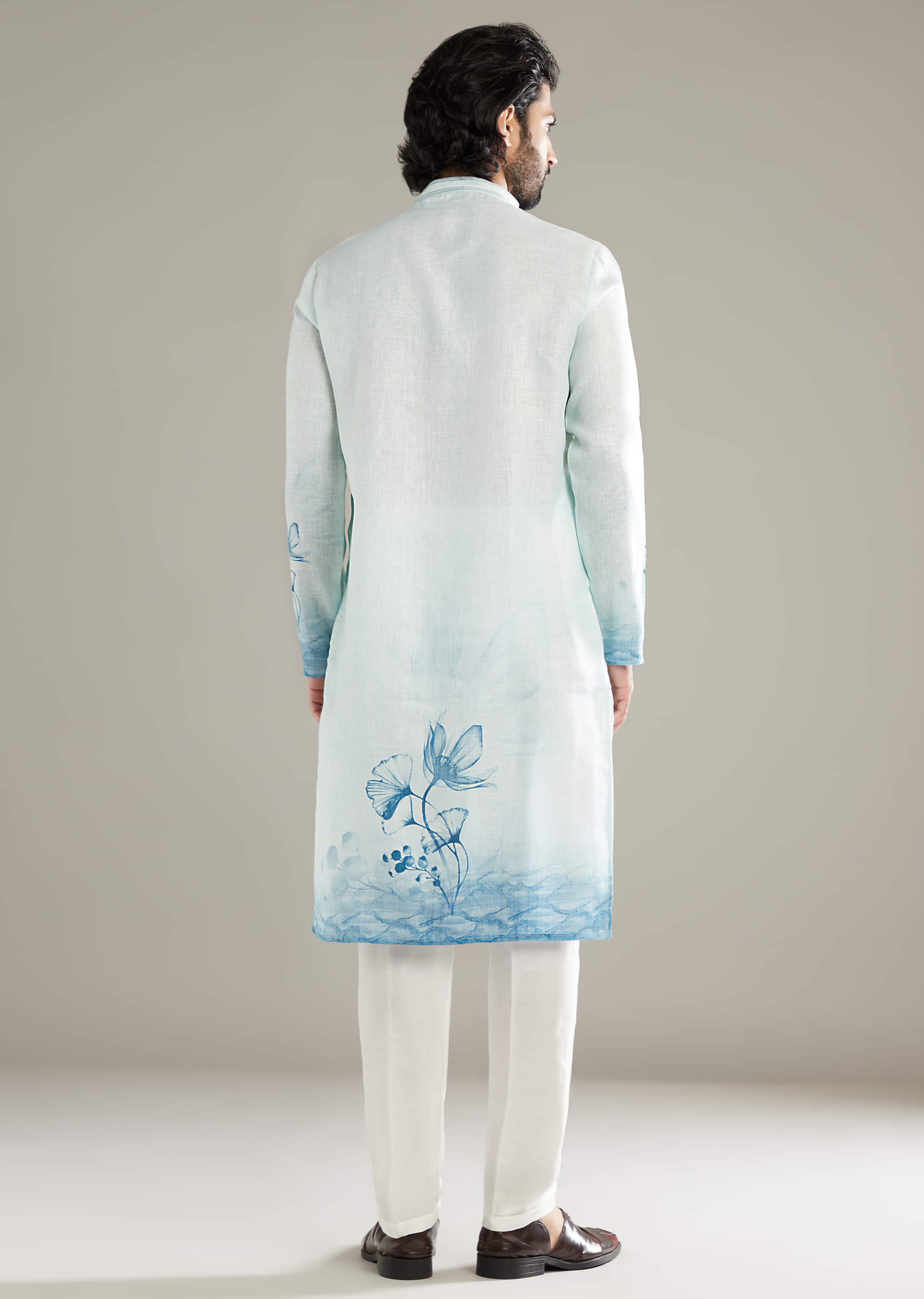 Sky Blue Printed Kurta Set For Men With Floral Motifs