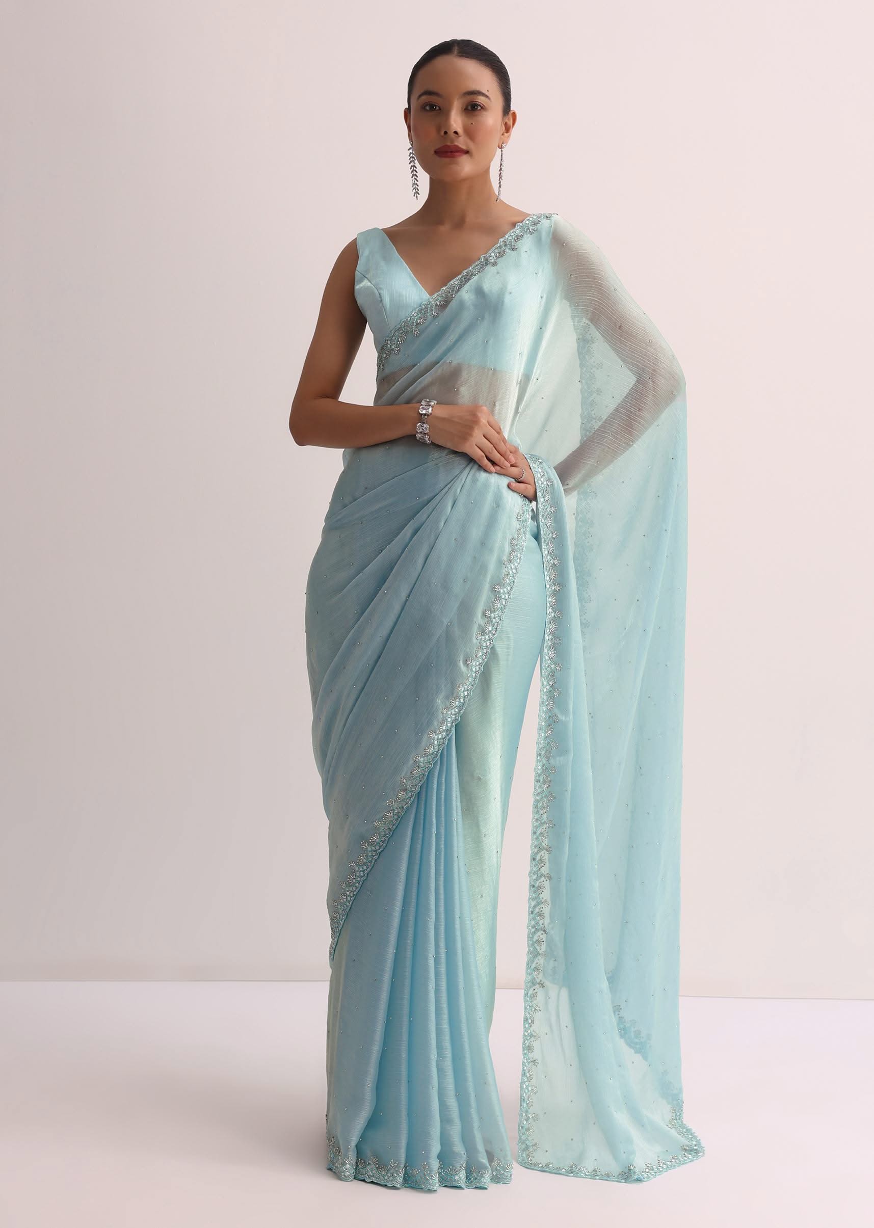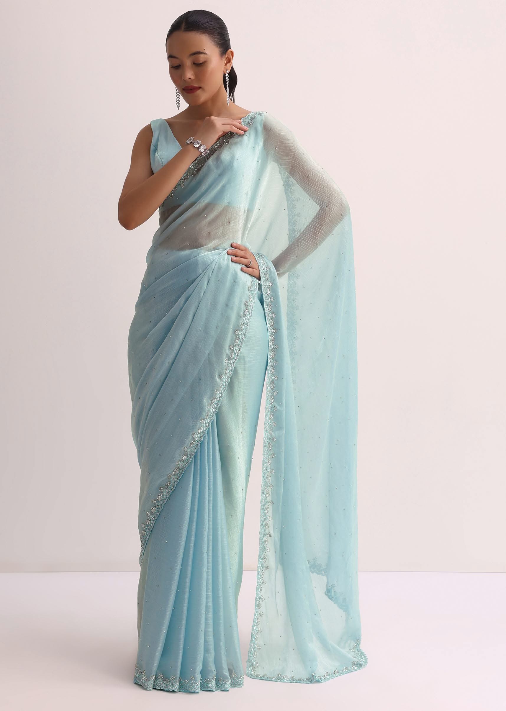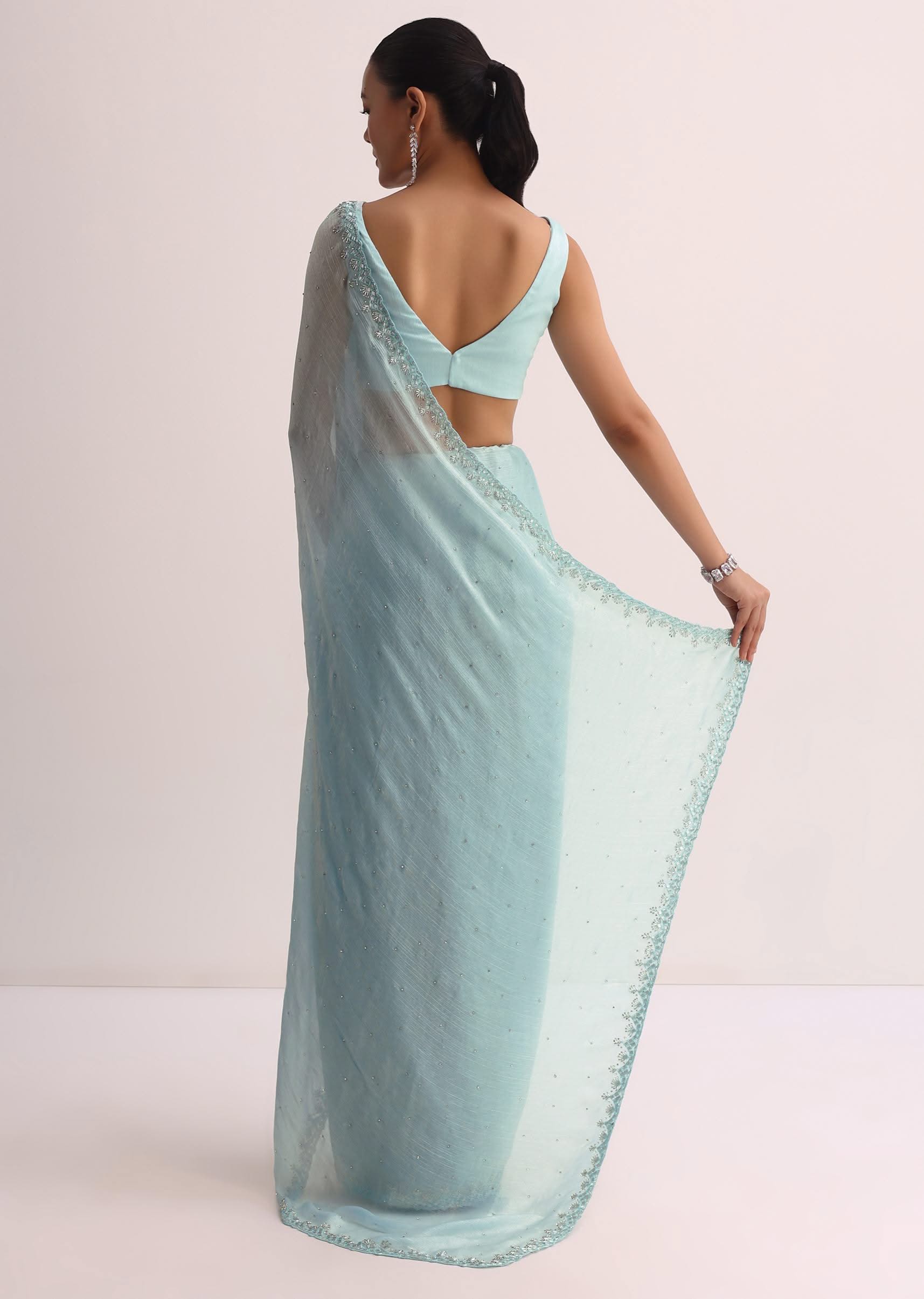 Sky Blue Saree With Cutdana Border And Unstitched Blouse