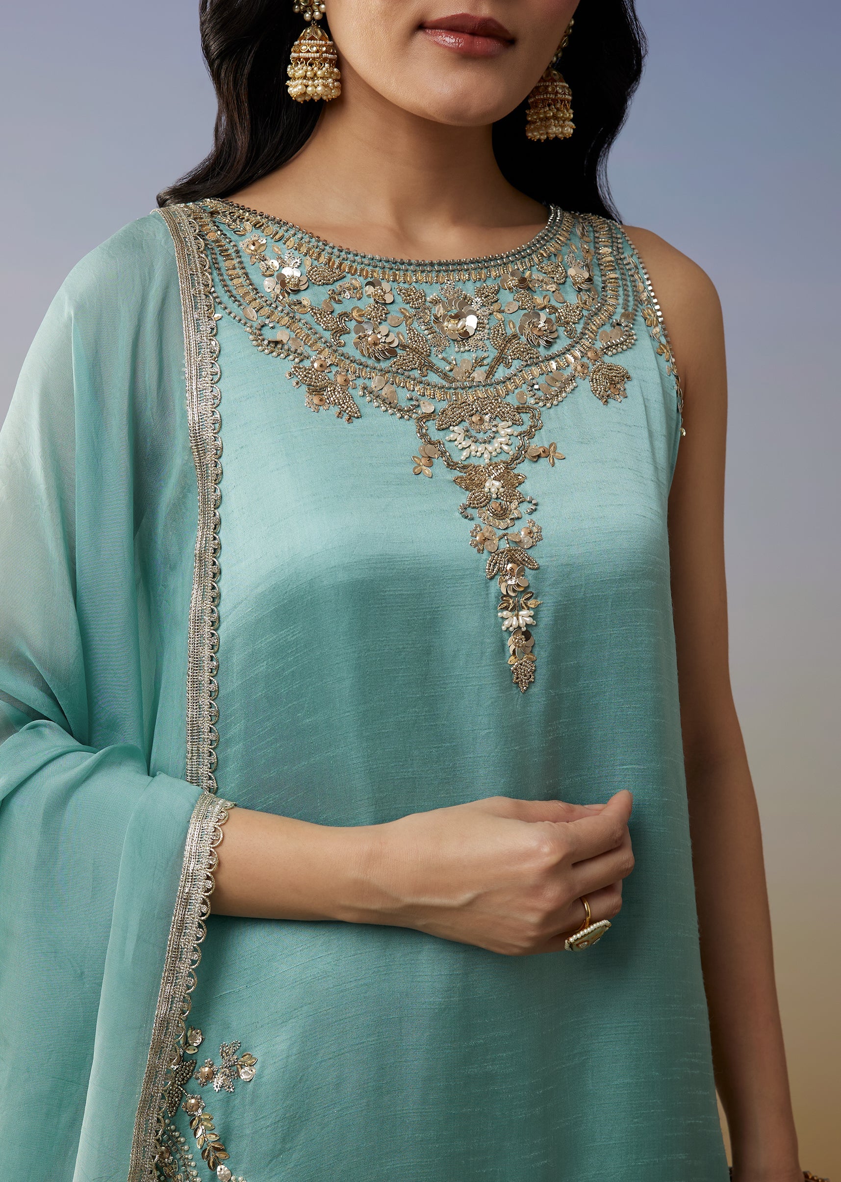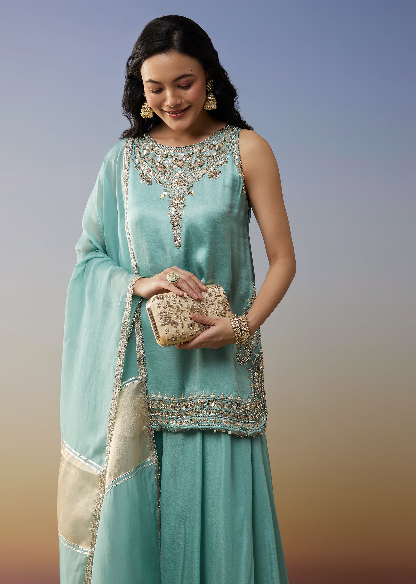 Sky Blue Satin Palazzo Suit with Beads Sequins Work