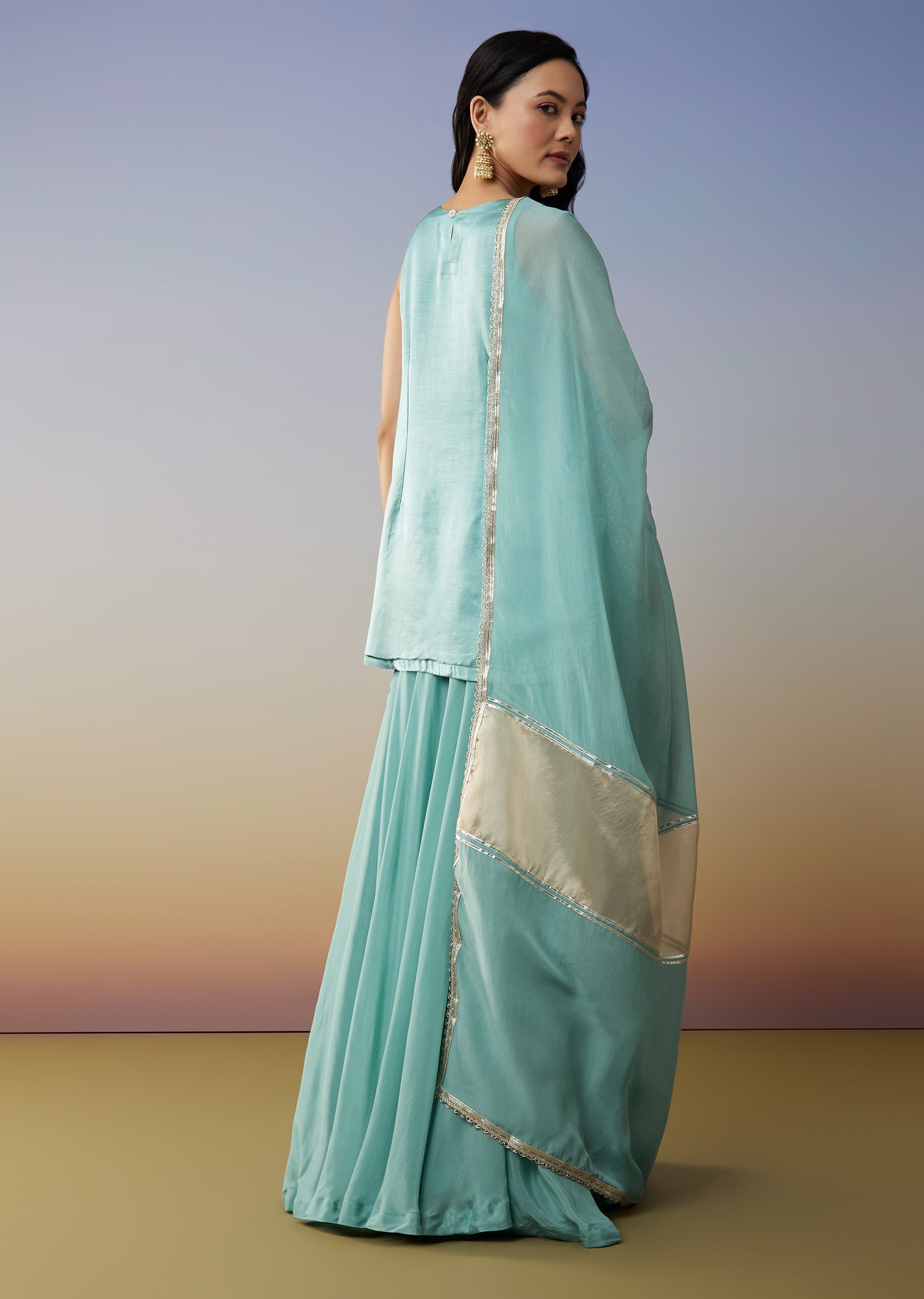 This sky blue palazzo suit brings a gentle pastel elegance perfect for engagement mehendi and bridesmaid celebrations. Crafted in a satin primary fabric with a soft chinos secondary base the... More Product Details