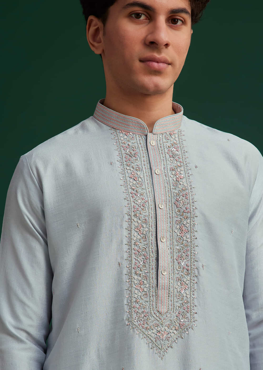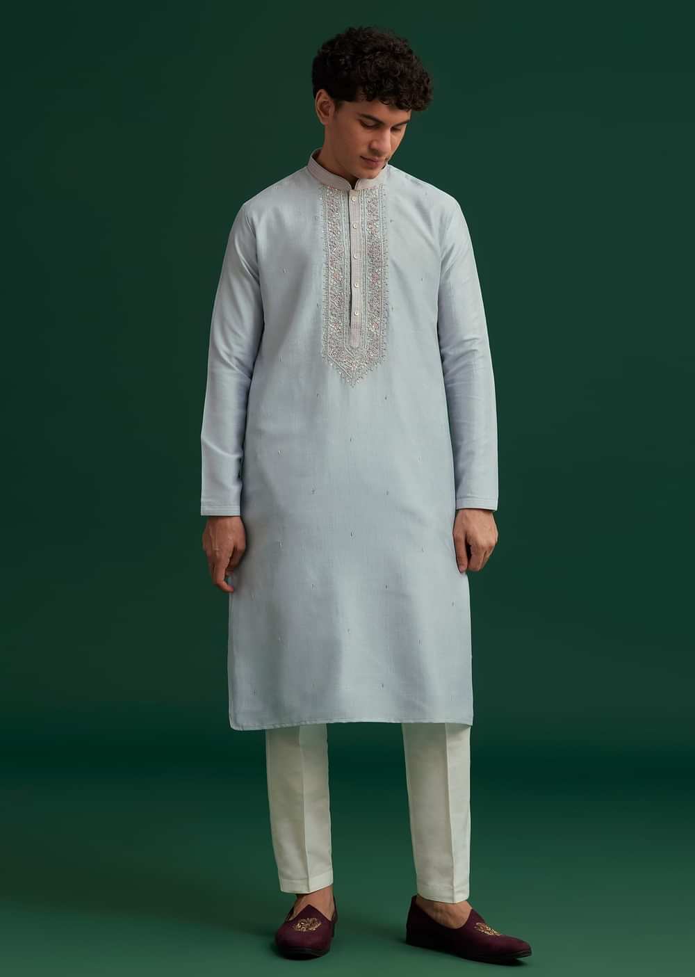 Exude Refined Elegance With This Sky Blue Silk Kurta Set Featuring Intricate Hand Embroidery On The Yoke For A Regal Touch. The Delicate Embellishments Crafted With Resham Threadwork Sequins And Pearls Enhance The Soft Sheen Of The Luxurious Silk Fabric. Designed For Weddings Festive Celebrations And Grand Occasions This Kurta Set Strikes The Perfect Balance Between Timeless Tradition And Modern Sophistication. The Serene Sky Blue Hue And Exquisite Detailing Make It A Distinguished Choice For Refined Ethnic Dressing.Awarded As The Most Trusted Brand We'Re Delivering Styles You Love Just As Promised.