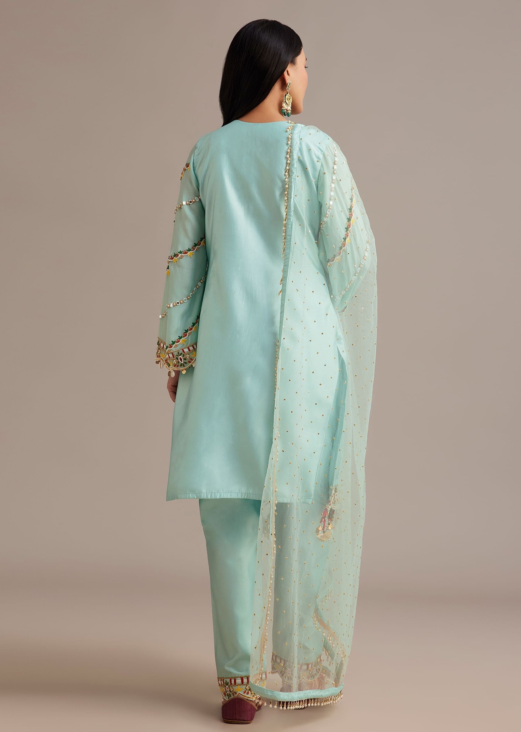 • Embrace A Festive Spirit With This Sky Blue Silk Kurta Set Highlighted By Intricate Mirror Moti And Thread Embroidery.