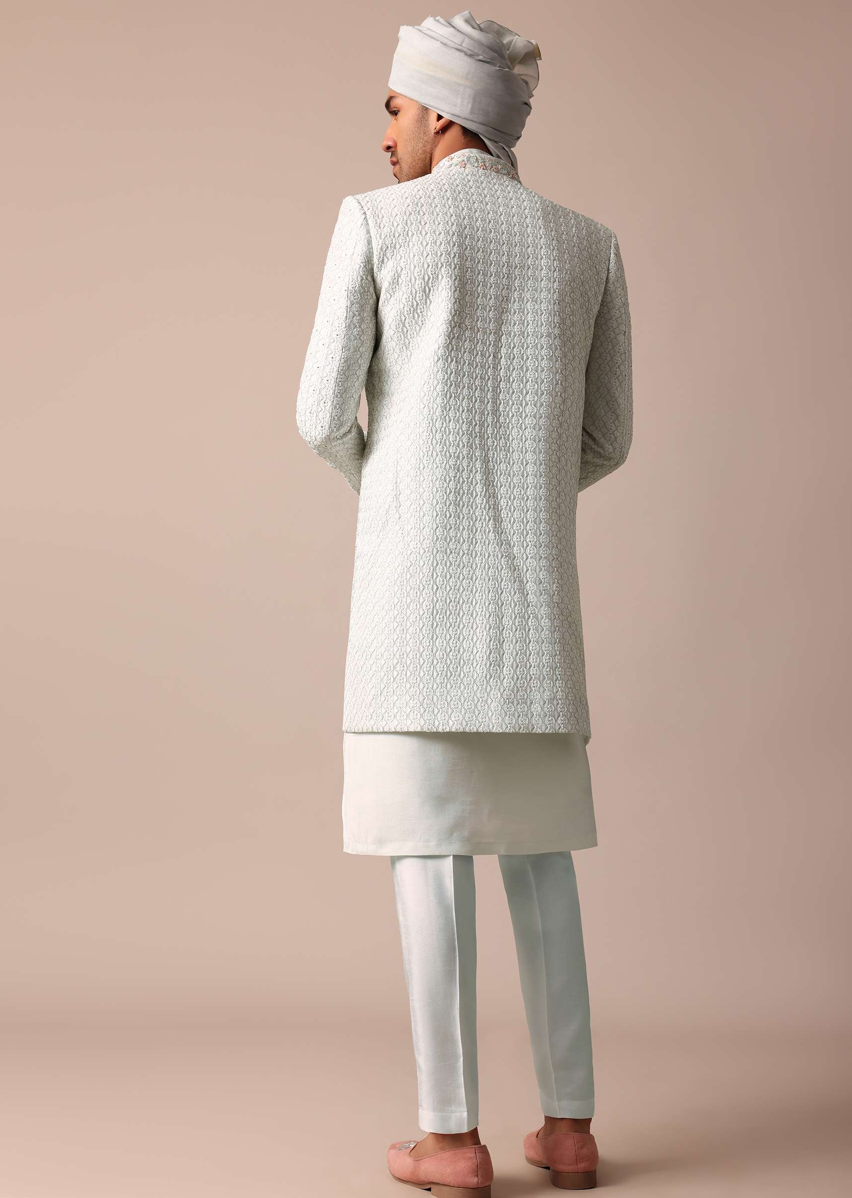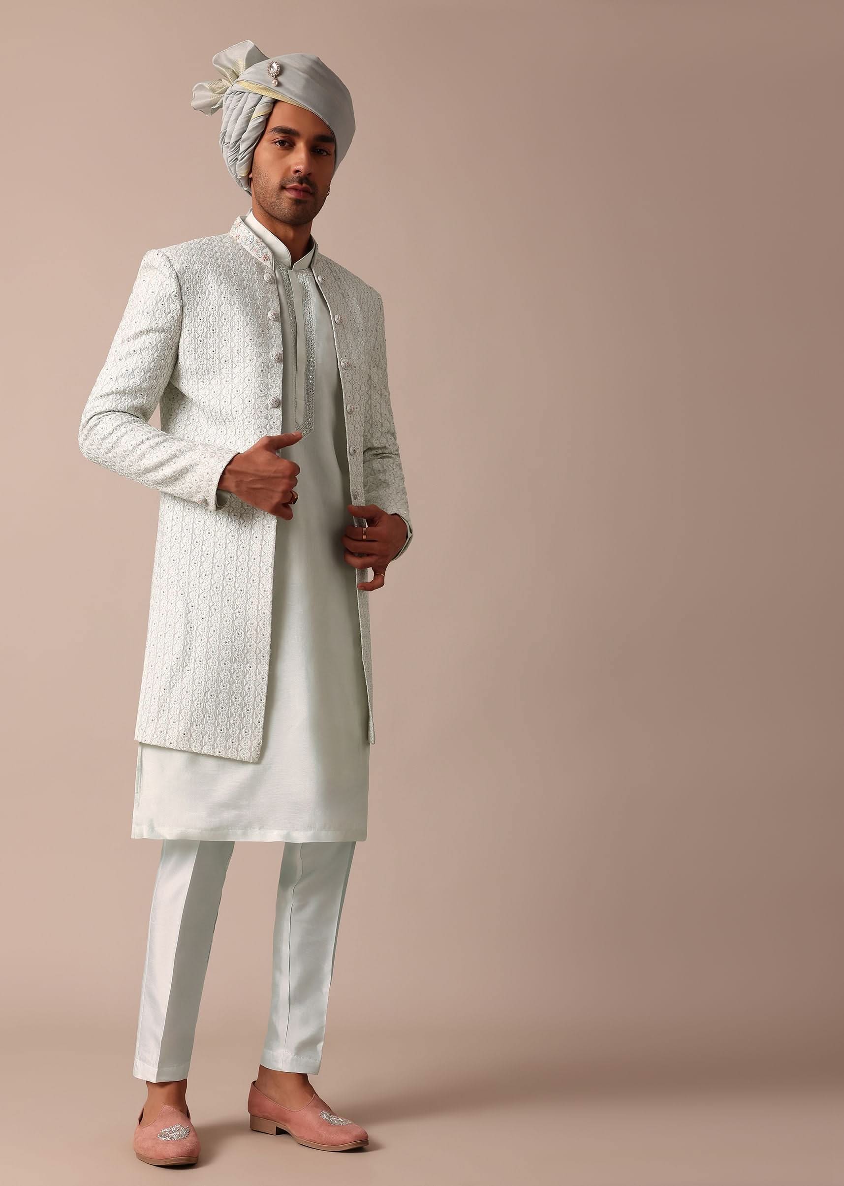 Sky Blue Silk Sherwani With Exquisite All-Over Embroidery