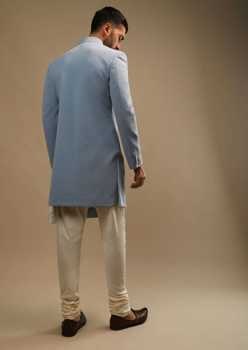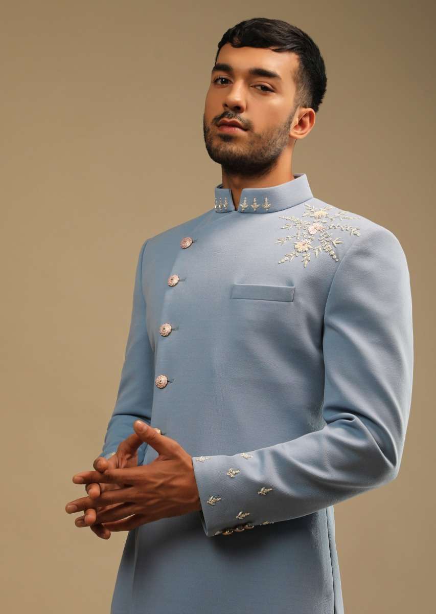 Skyway Blue Sherwani Set With Zardosi And Sequins Embroidered Floral Motifs And Off Centre Placket