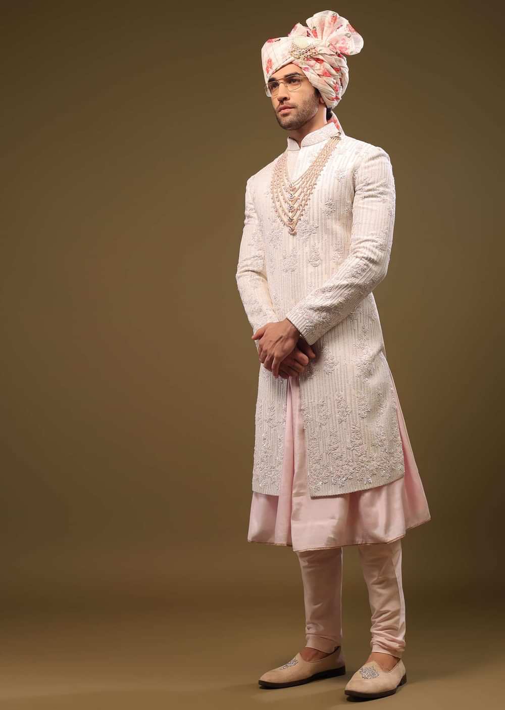 An elegant snow-white sherwani set fabricated in silk, crafted in cut-dana, sequins, and zari embroidery.It has full sleeves and a mandarin collar with a front closure, and comes with a pink anarkali inner kurta and a matching churidar.Buttons and Accessories may vary in color, shape and size. Awarded as the Most Trusted Brand, we're delivering styles you love, just as promised.