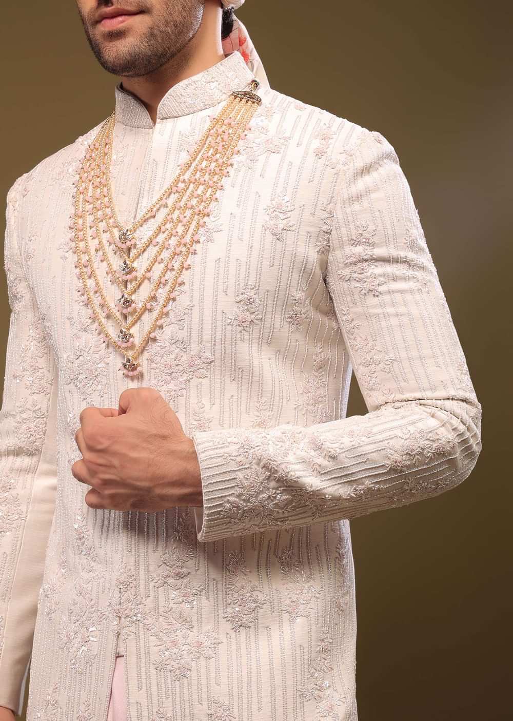 An elegant snow-white sherwani set fabricated in silk, crafted in cut-dana, sequins, and zari embroidery.It has full sleeves and a mandarin collar with a front closure, and comes with a... More Product Details