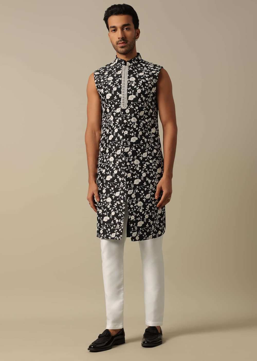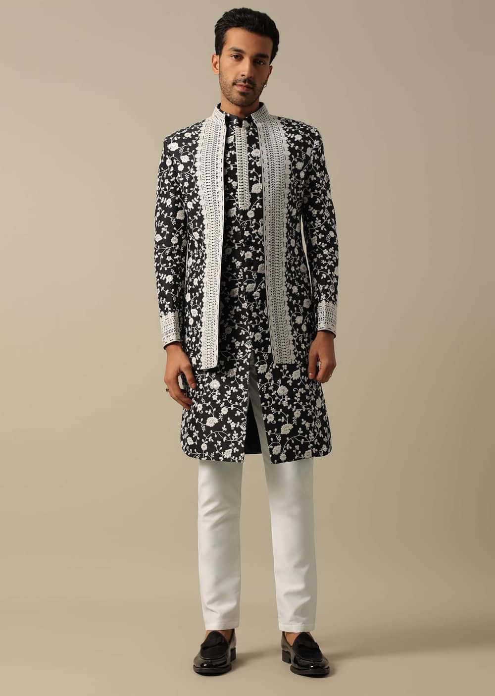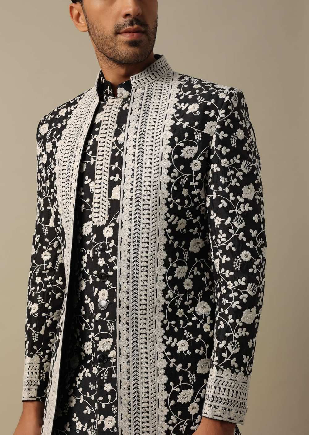 Make a statement at Sangeet with this captivating black Sherwani Set. It features intricate floral thread embroidery with an attached dupatta. The set includes a full sleeved Sherwani a stylish... More Product Details