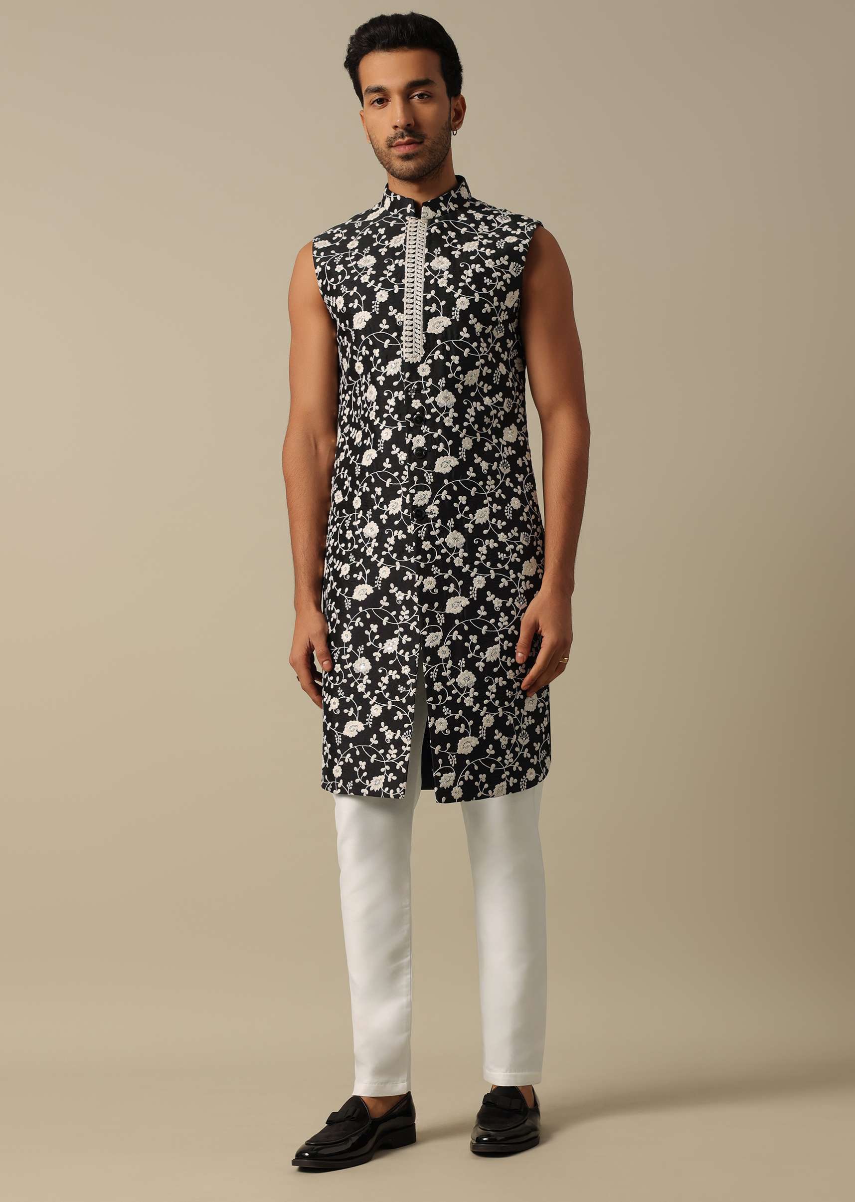 Make a statement at Sangeet with this captivating black Sherwani Set. It features intricate floral thread embroidery with an attached dupatta. The set includes a full sleeved Sherwani a stylish jacket and coordinating pant. The unique embroidery details add a touch of sophistication to this classic silhouette. Awarded as the Most Trusted Brand, we're delivering styles you love, just as promised.