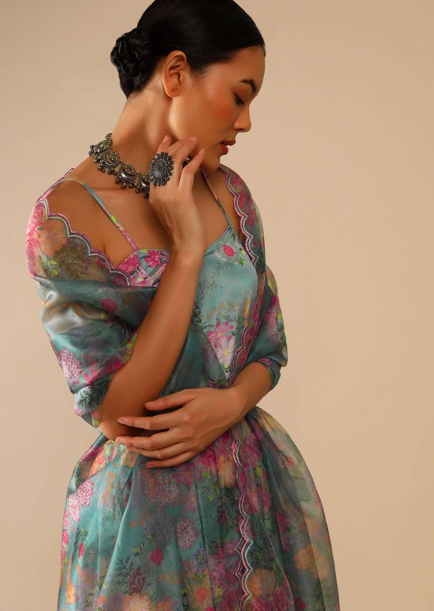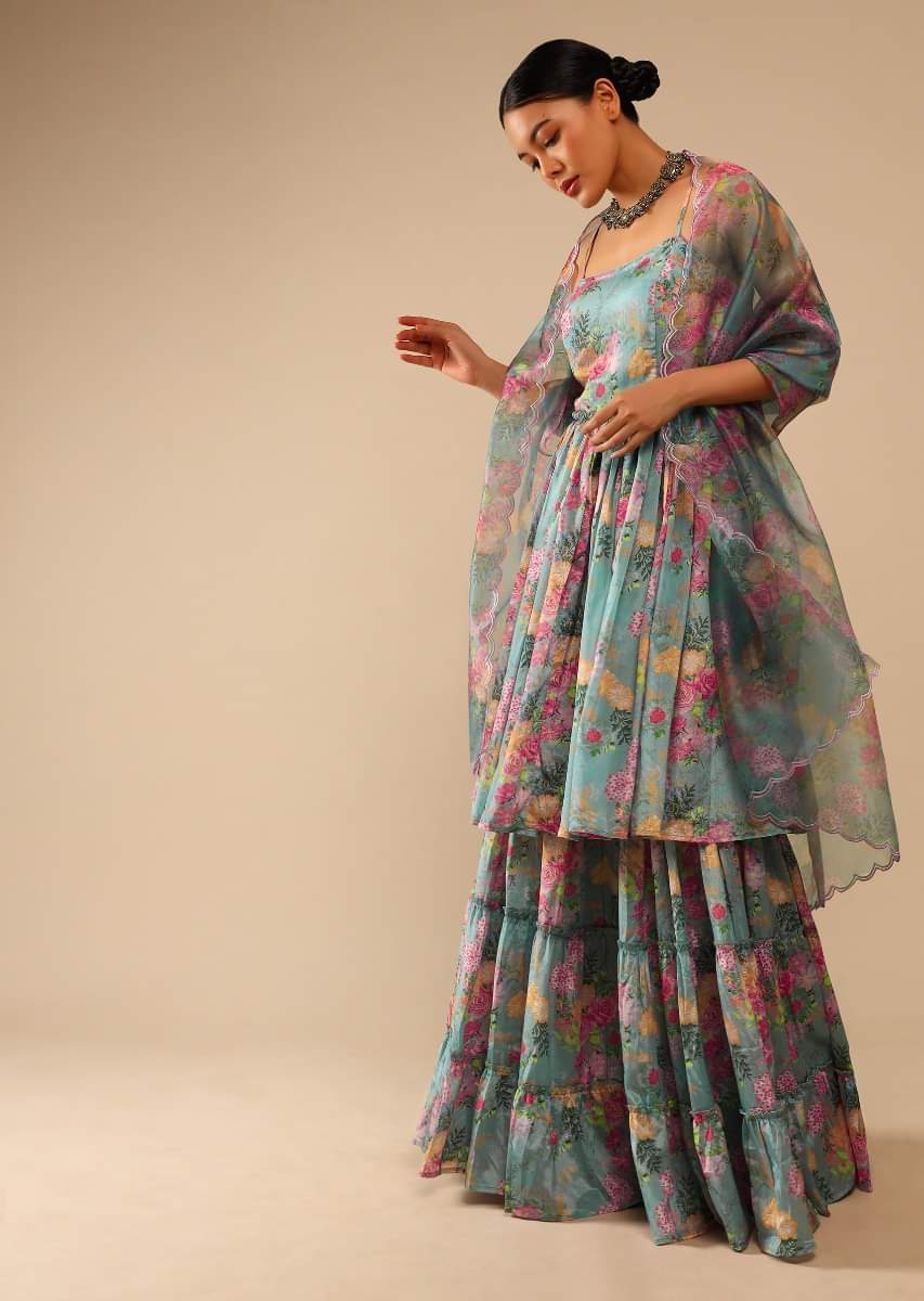 Steel Blue Sharara Suit In Crepe With Peplum Flared Kurti Adorned In Floral Print All Over