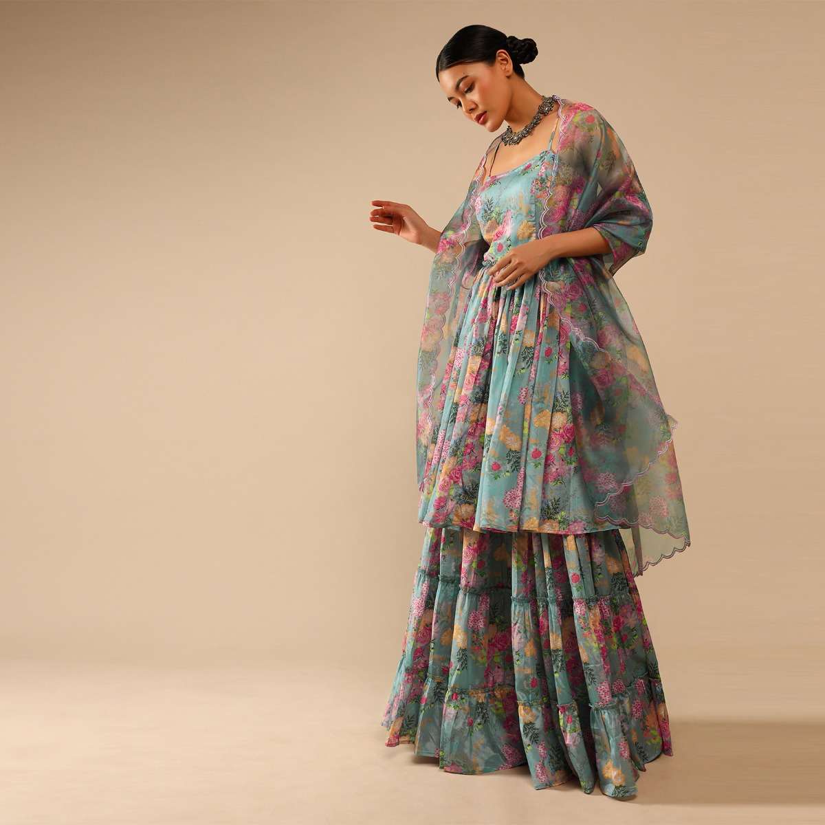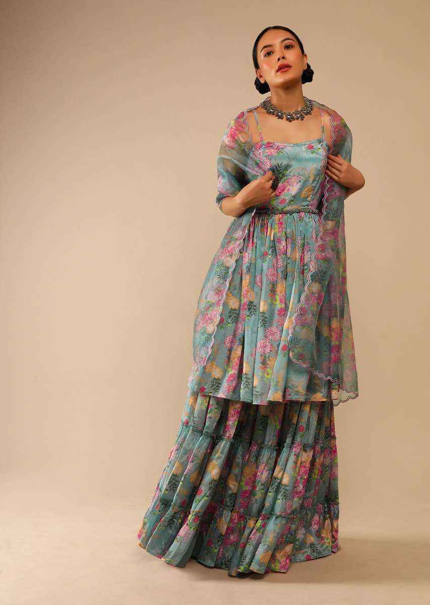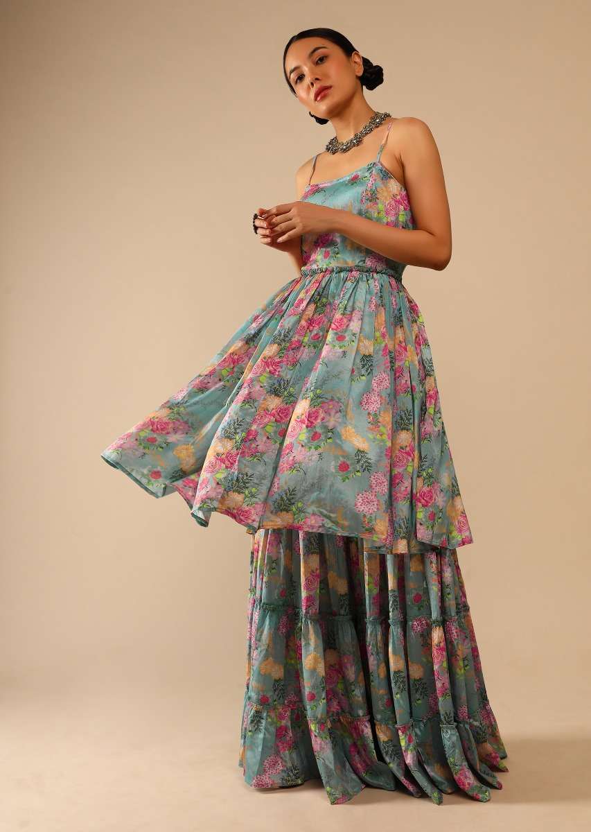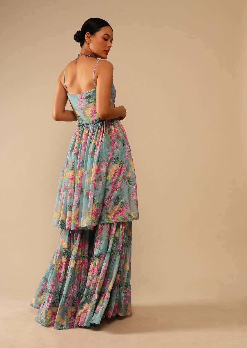 Steel blue sharara suit in crepe with peplum flared kurti. The set is adorned in floral print all over. It is designed with tube neckline, straps on the shoulders and... More Product Details