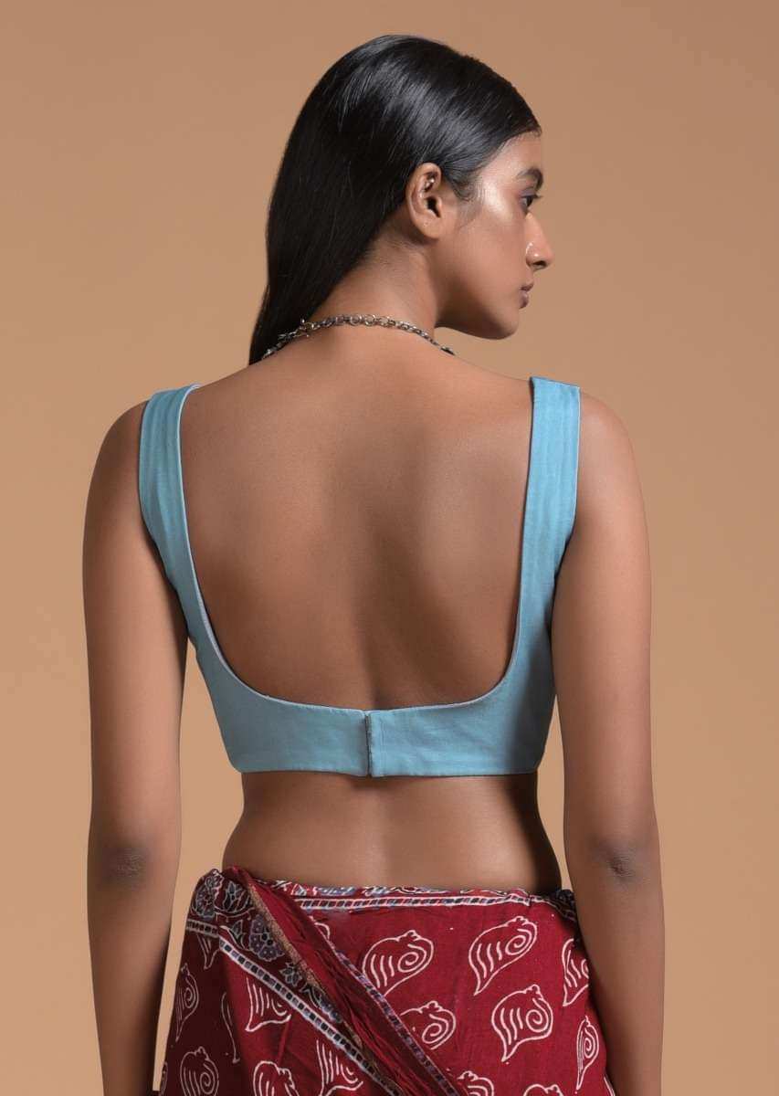 Steel blue sleeveless blouse in silk blend with scooped neckline. It comes with a U cut back with hook closure. Awarded As The Most Trusted Brand We'Re Delivering Styles You... More Product Details