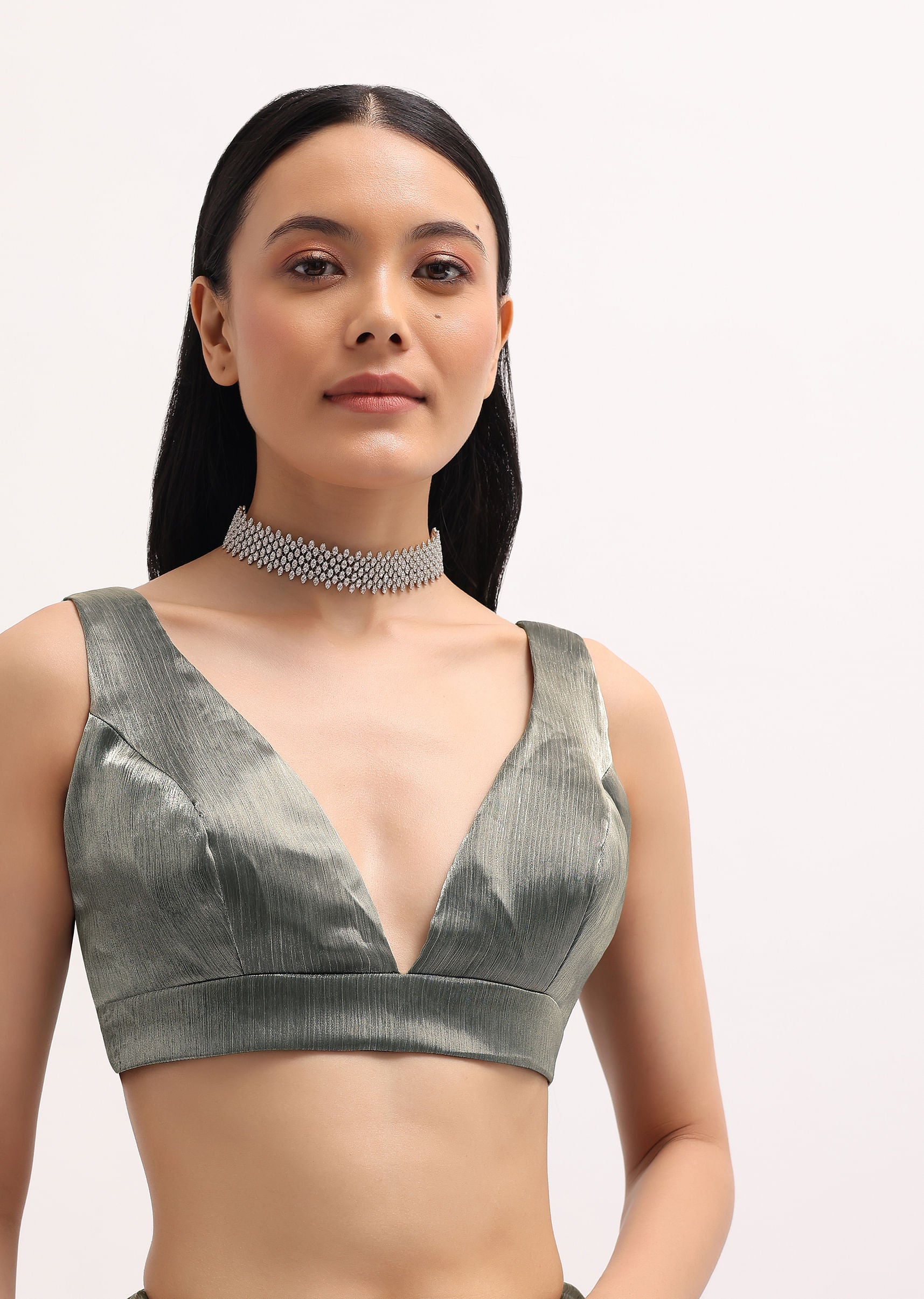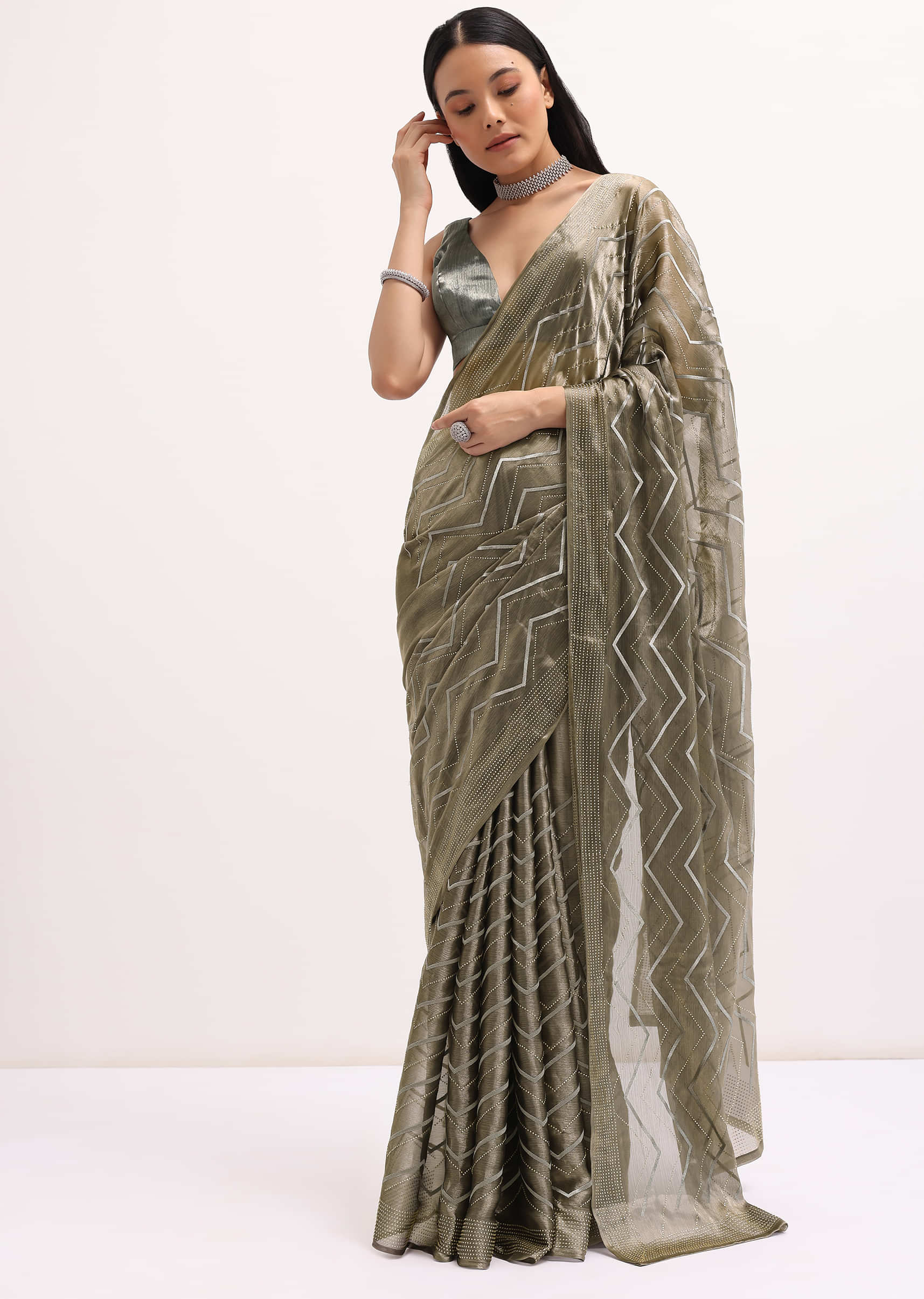 Stone Grey Glass Tissue Saree With Unstitched Blouse