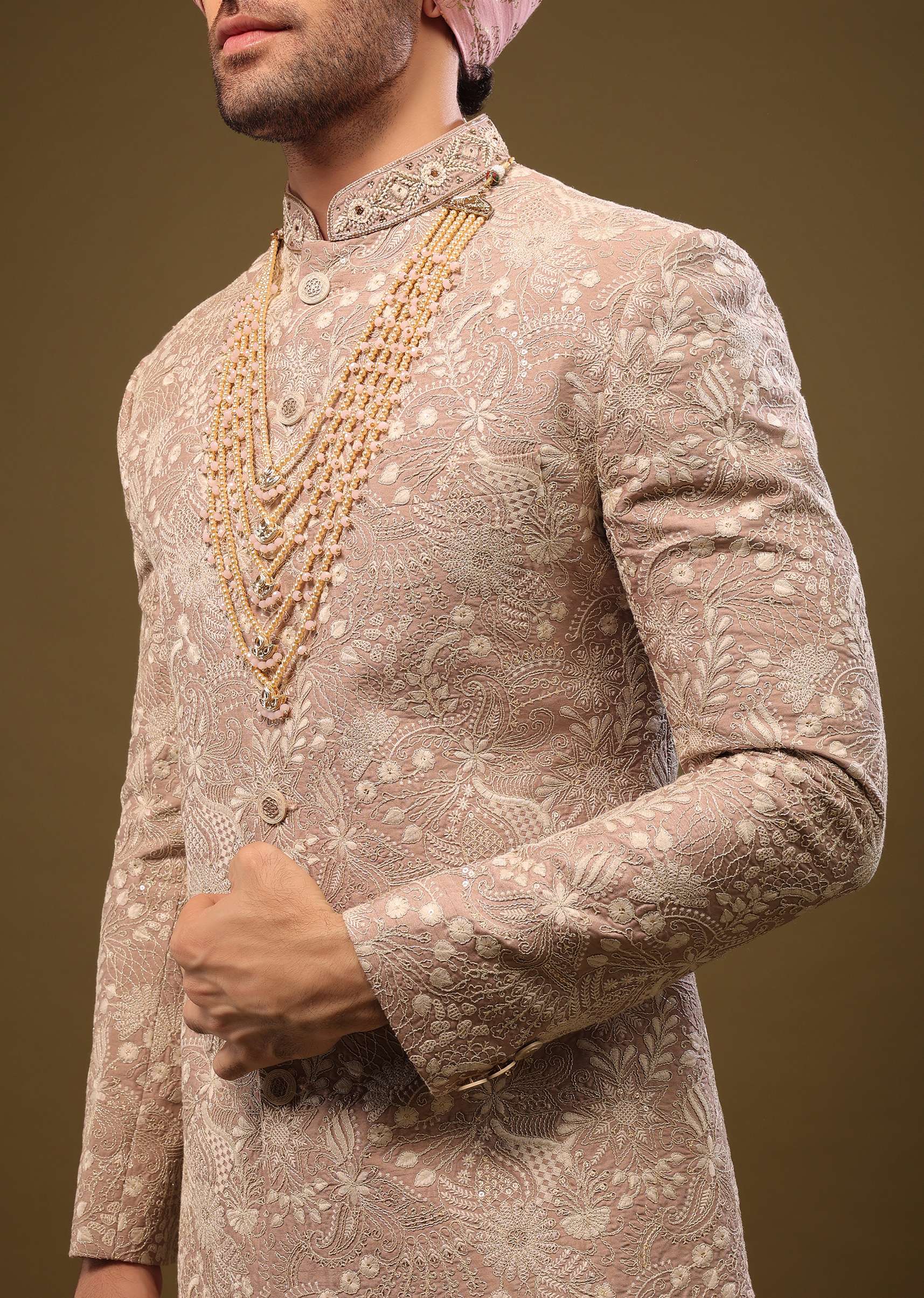 An enticing stucco beige sherwani set fabricated in silk crafted in a hand-embroidered zari and sequins work in a beautiful floral design.It has full sleeves and an embroidered mandarin collar... More Product Details