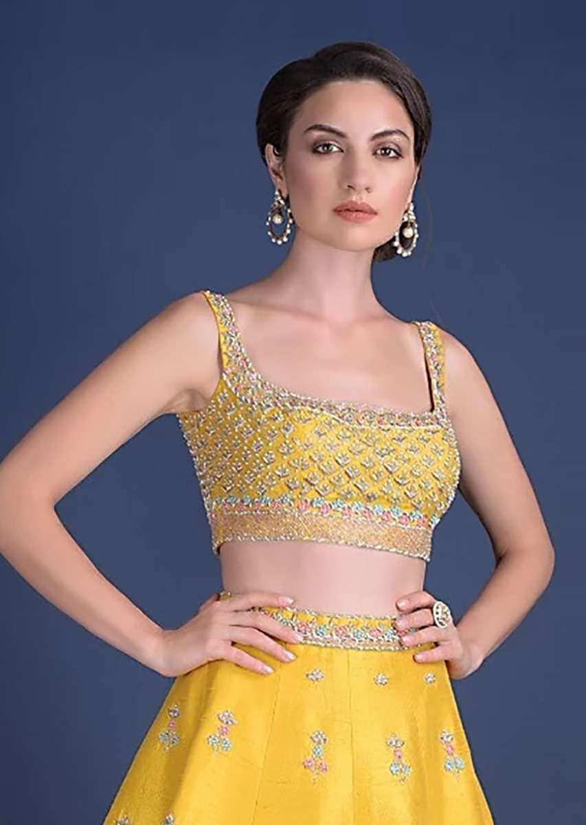 Sunset yellow heavily embellished sleeveless choli in raw silk with floral buttis in embossed embroidery using beads, cut dana, zardosi and French knots.Designed with U neck and a deep U... More Product Details