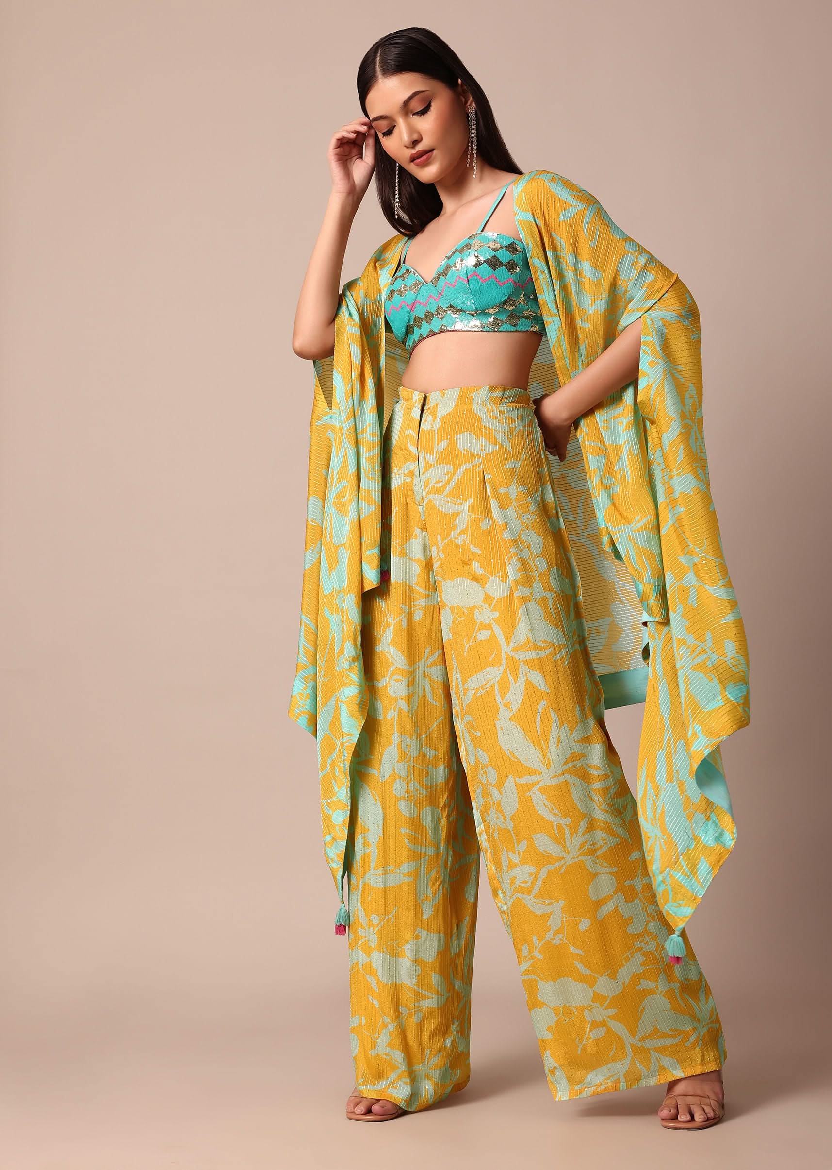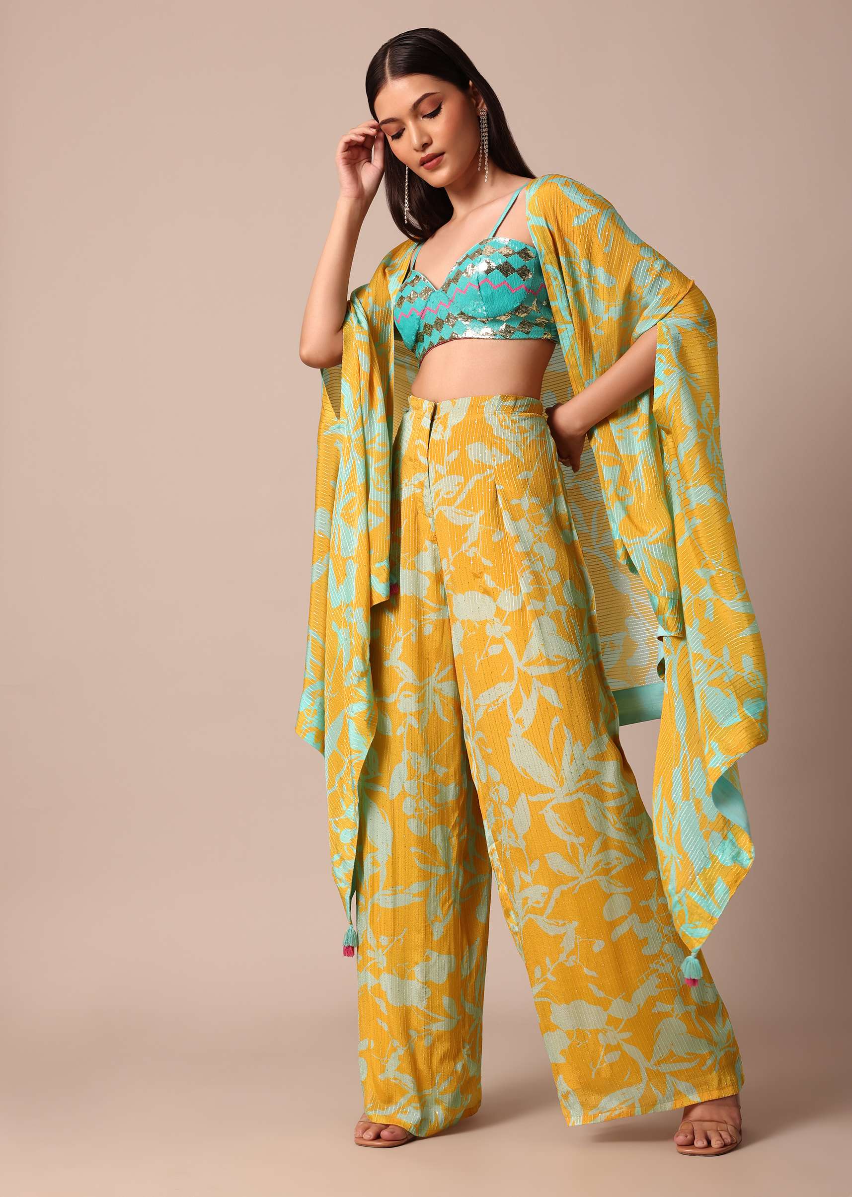Sunshine Yellow Printed Palazzo and Jacket With Sky Blue Crop Top