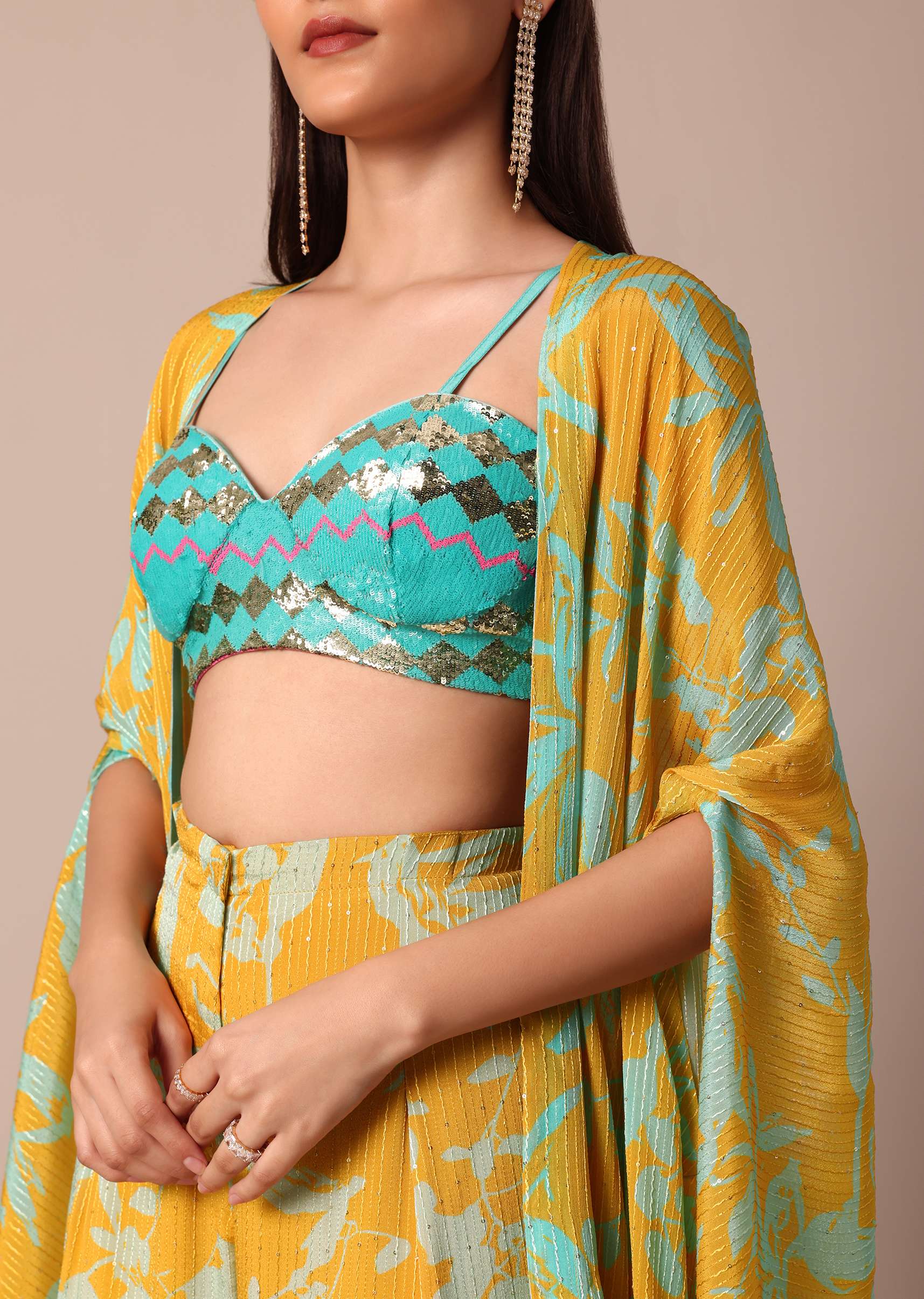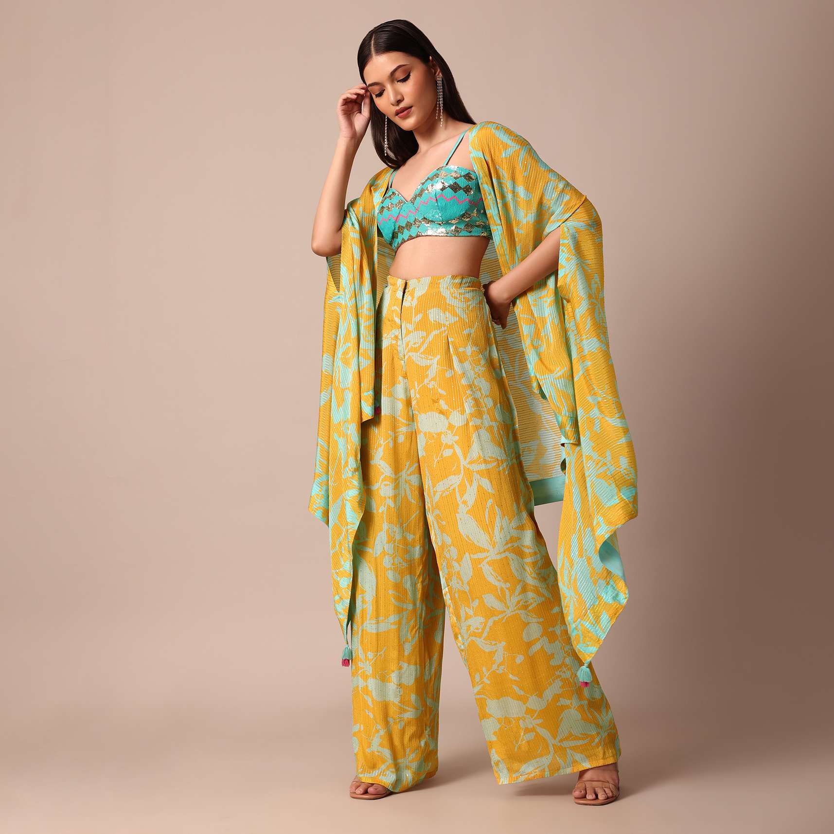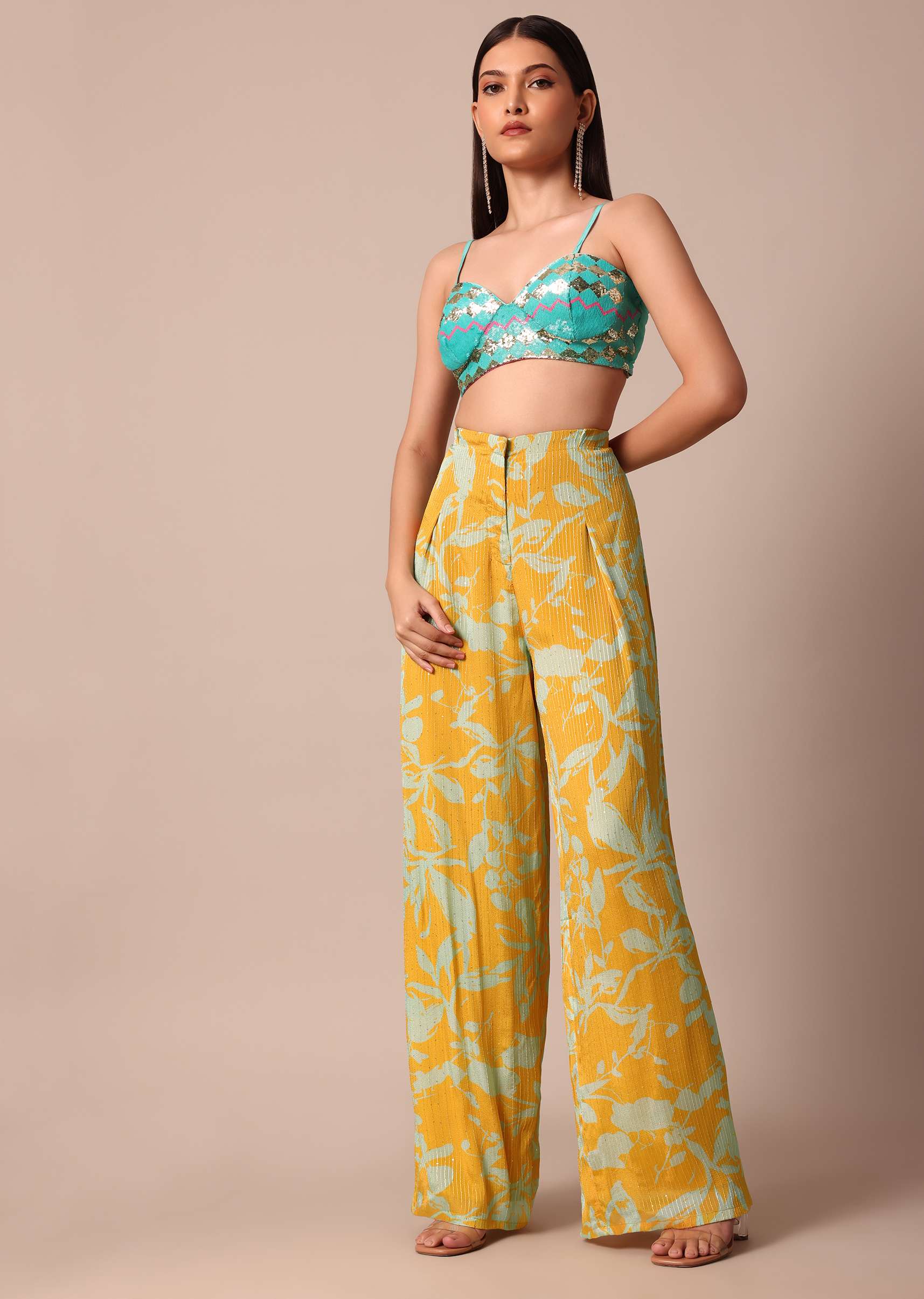 Complement this vibrant palazzo set with gold accessories and strappy heels to enhance the radiant allure of the ensemble.