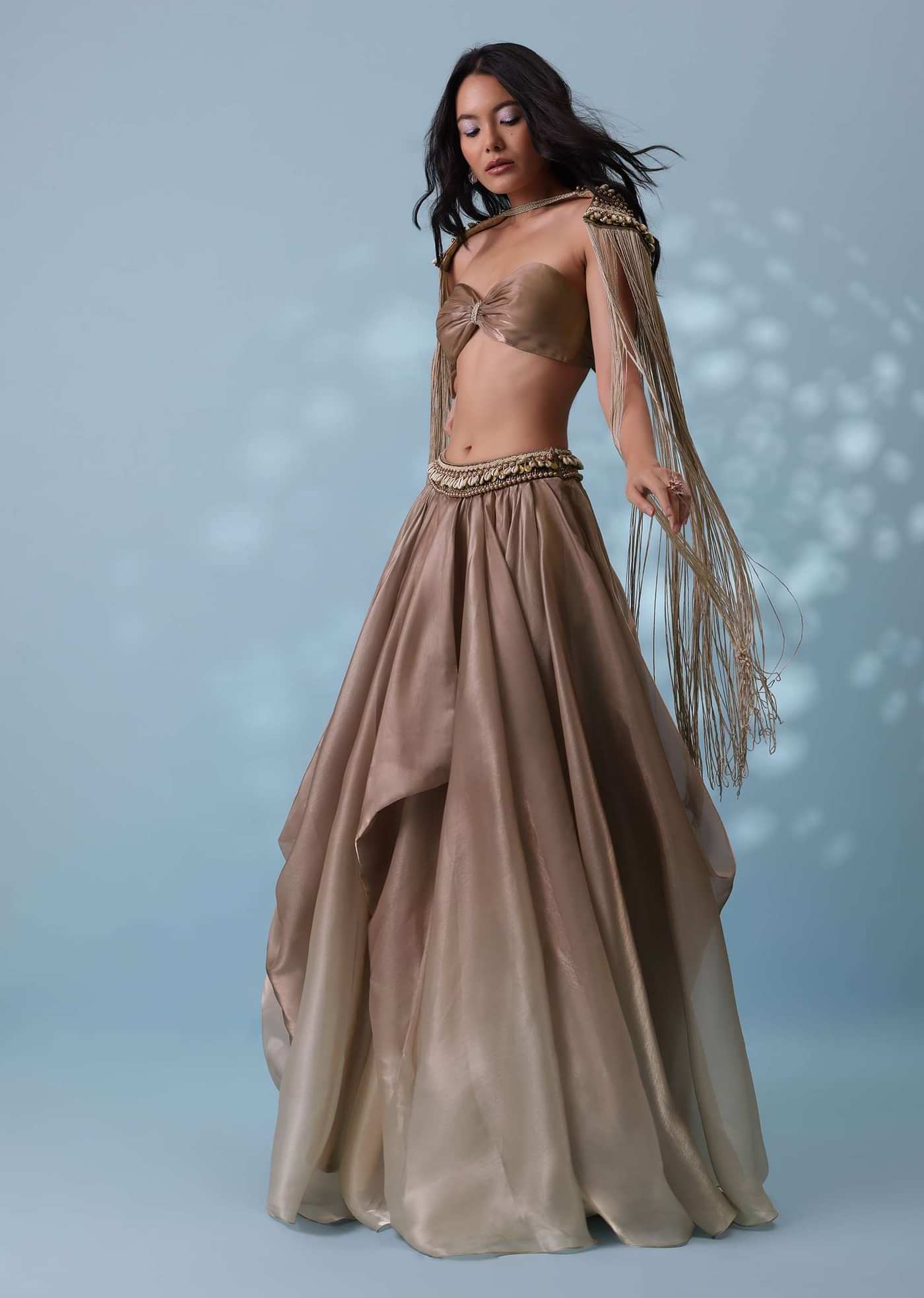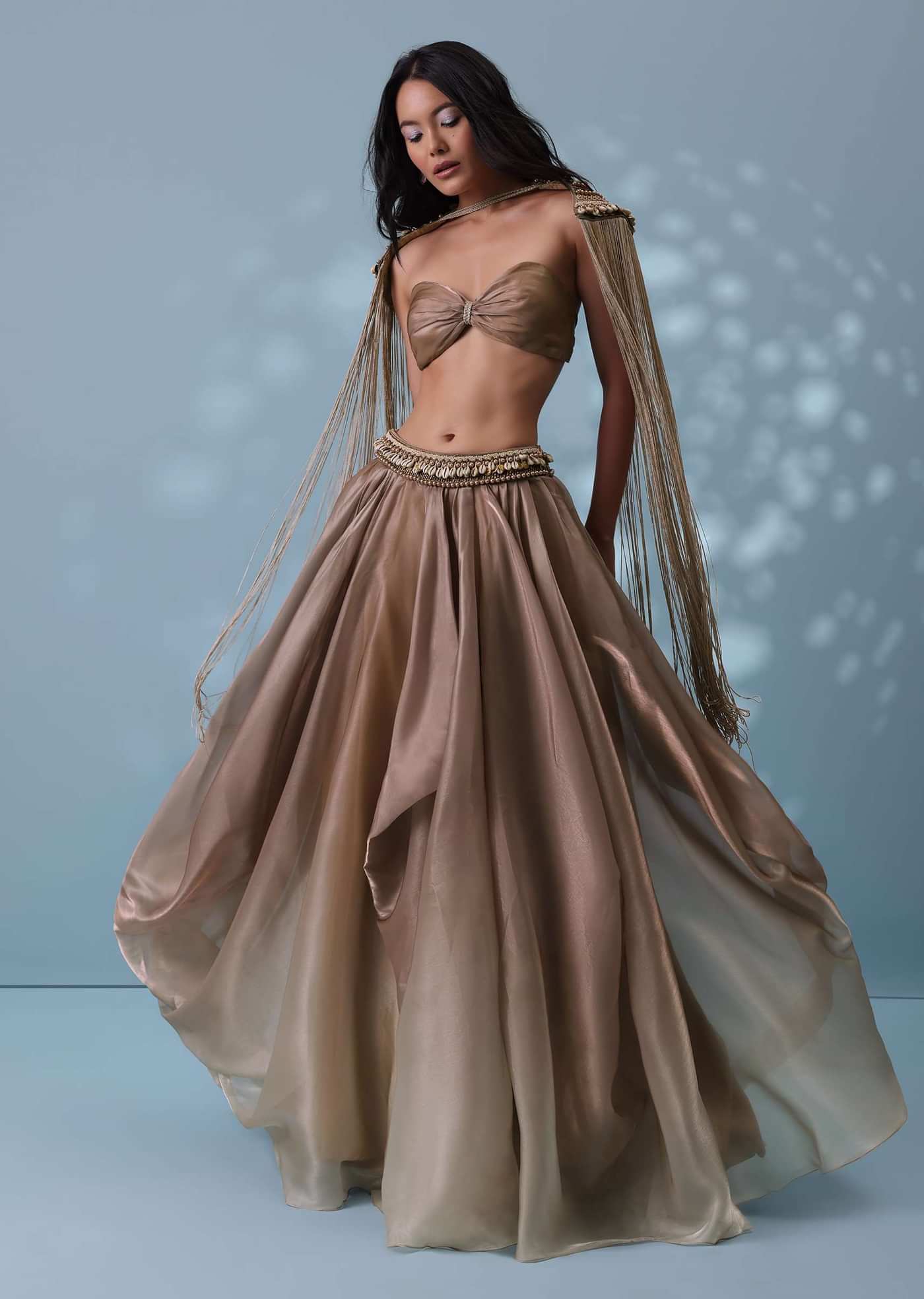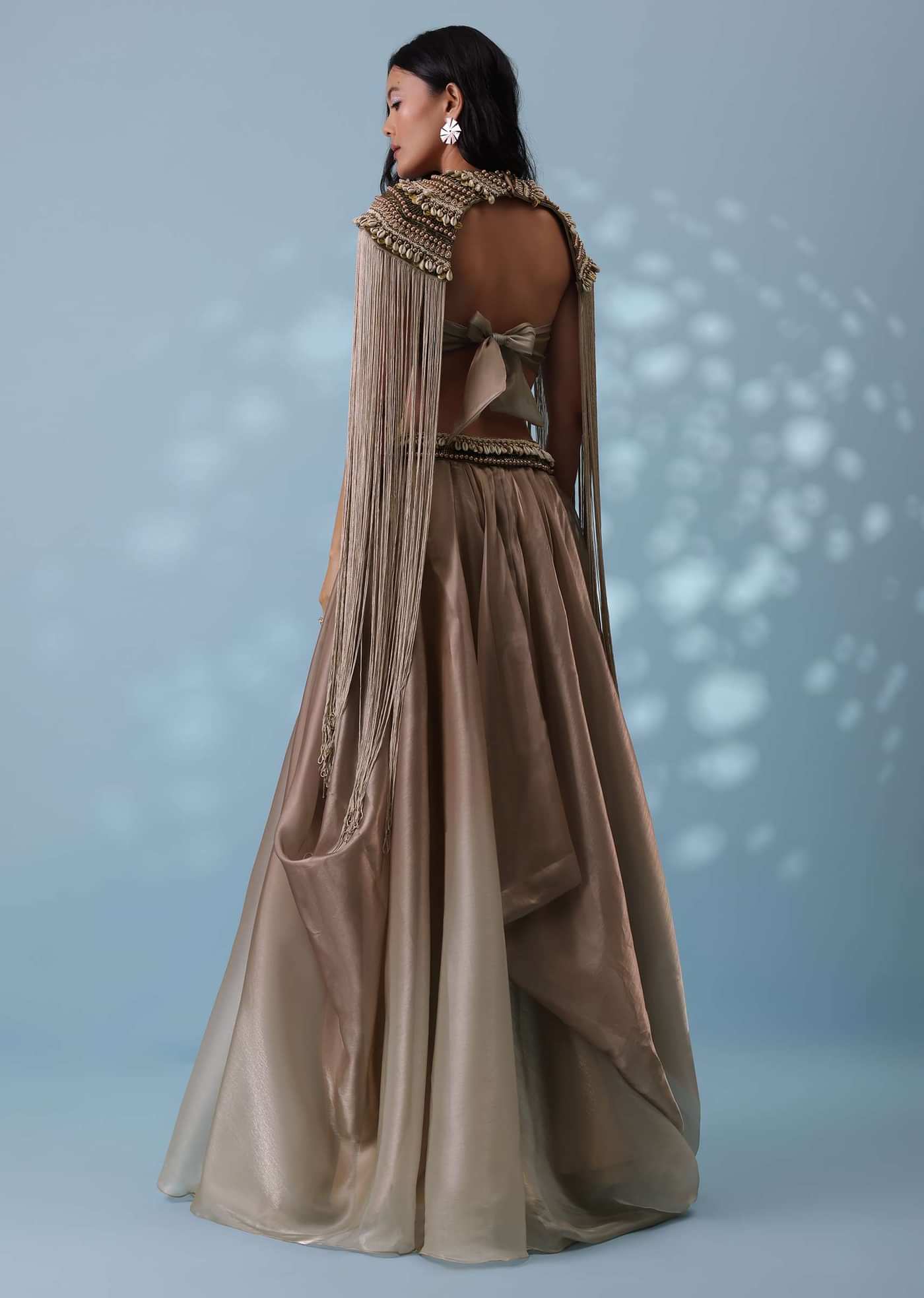 Taupe Brown Embroidered Cowl Lehenga And Cape Blouse In Shimmer Organza