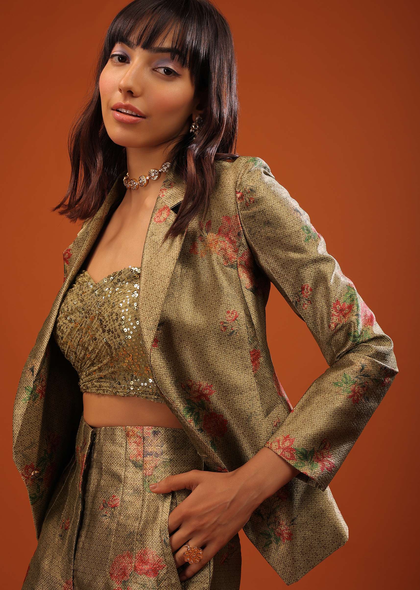 Moss Green Three-Piece Suit In Woven Floral Motifs With Cropped Pants And Sequin Bustier
