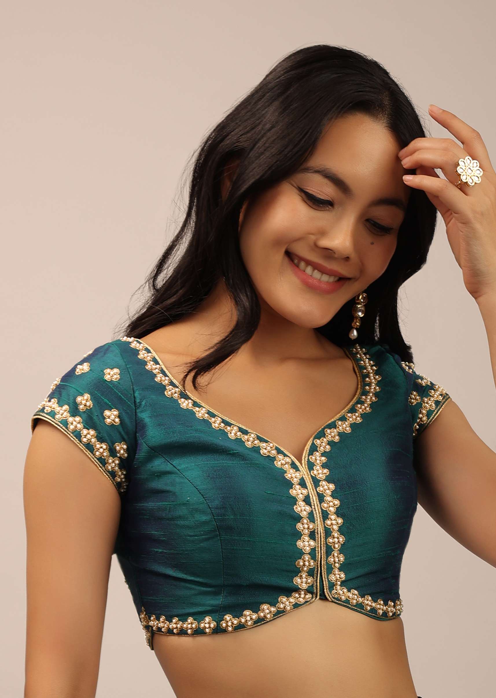 Teal Blouse In Raw Silk With Moti And Zari Work In Floral Design