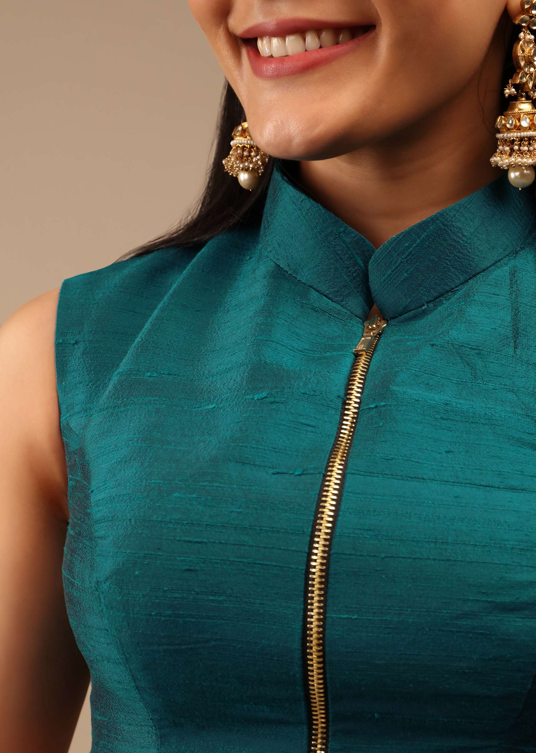 Teal blue blouse in raw silk with mandarin collar neckline and front zip closure. It is crafted sleeveless with padding and closed back. Awarded As The Most Trusted Brand We'Re Delivering Styles You Love Just As Promised.